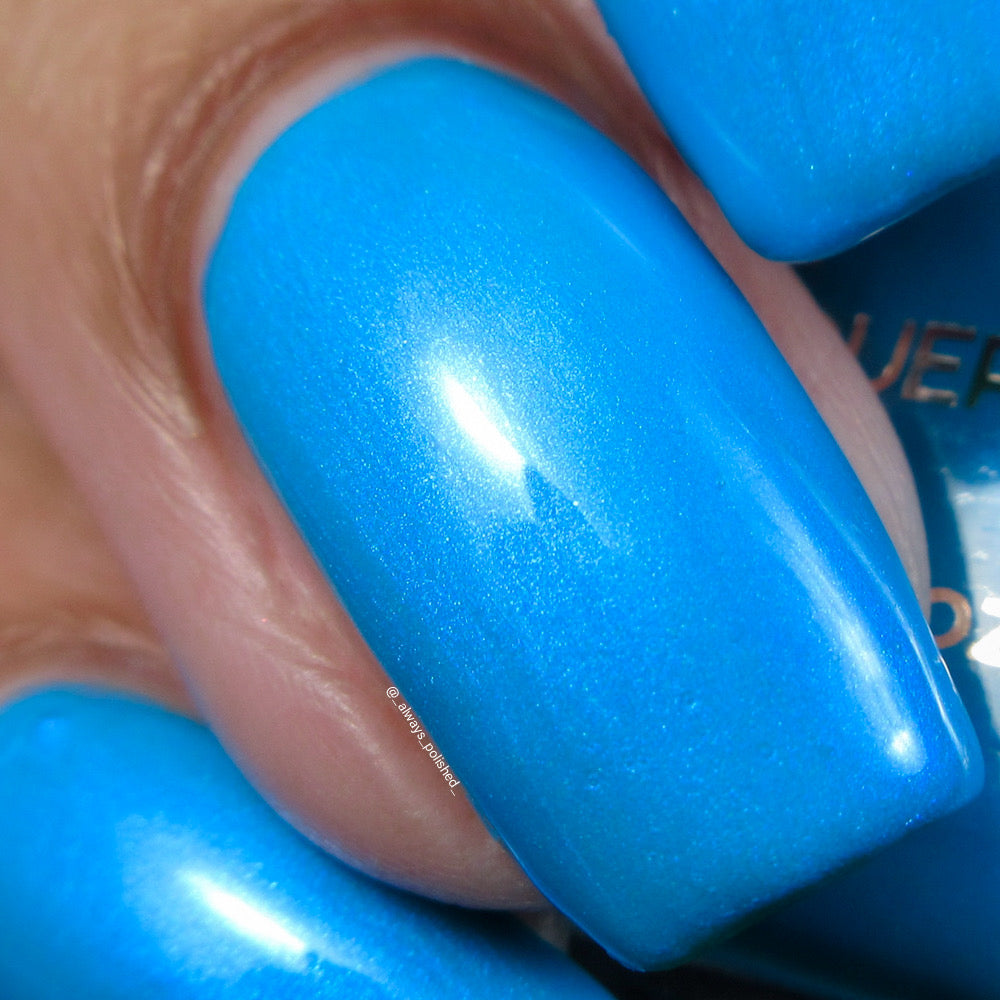 Very bright, almost-neon turquoise blue filled with blue to violet shifting shimmer.