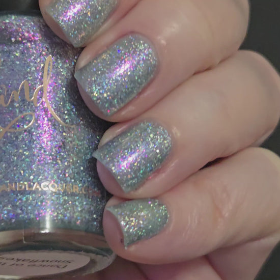 Pale lilac shifty shimmer and holographic flakes that reads as silvery lilac on the nail. Opaque in 2-3 coats. Dries smooth. High quality base and top coat always recommended for maximum shine and wear. No staining reported. This is a cousin to Candy Cane Crumbles from 2024.