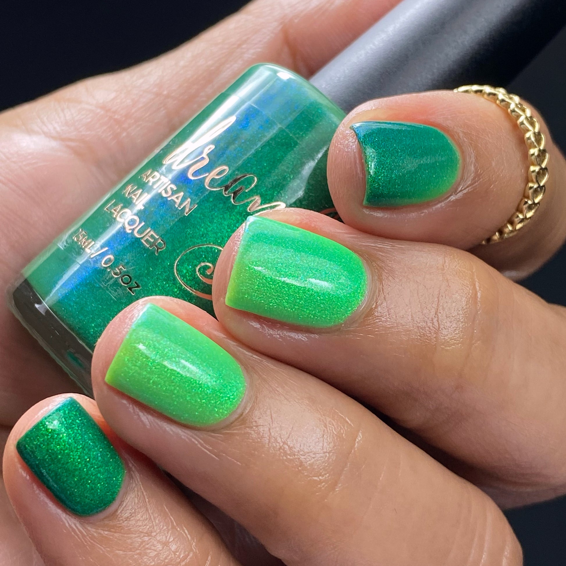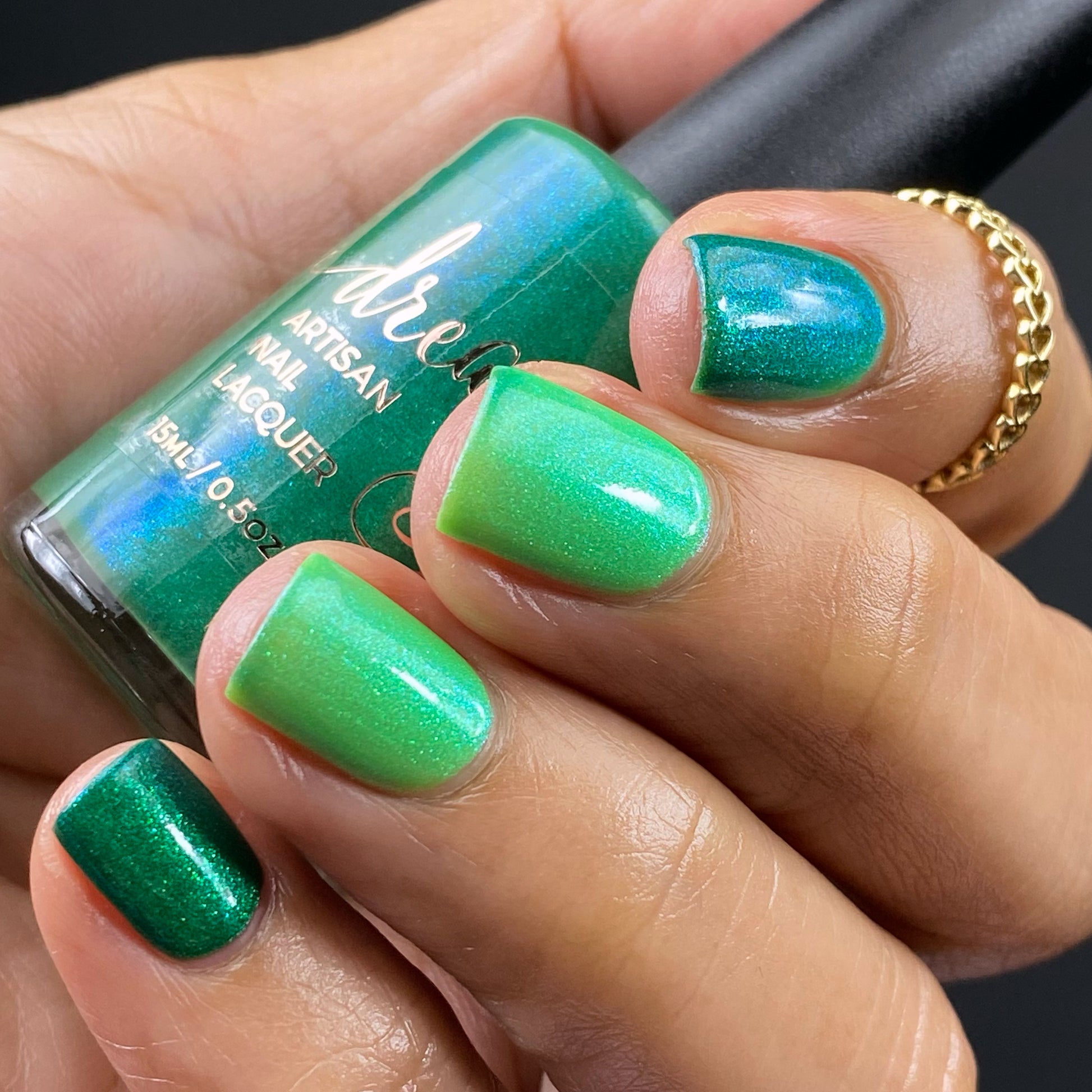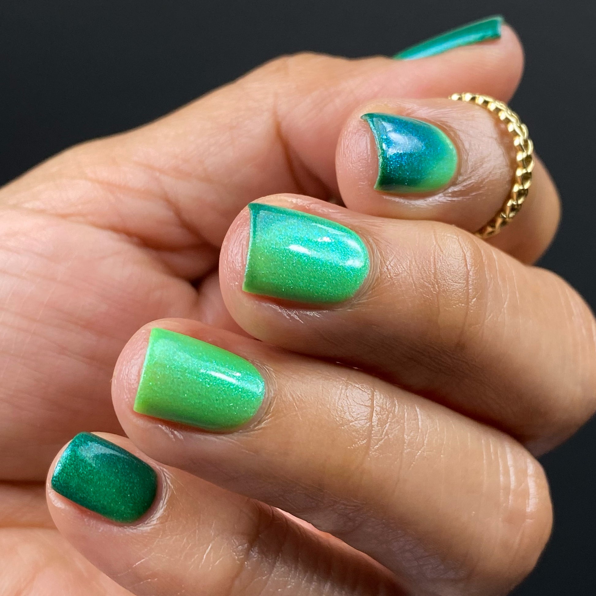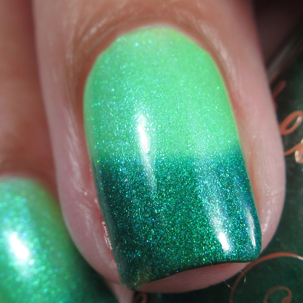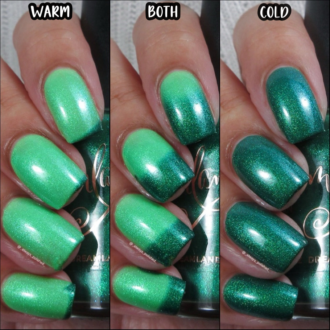 Dark green (cold) to light green (warm) thermal filled with green shifty shimmer. Dries slightly textured. No staining reported. Dries to a satin finish, glossy topcoat always recommended.