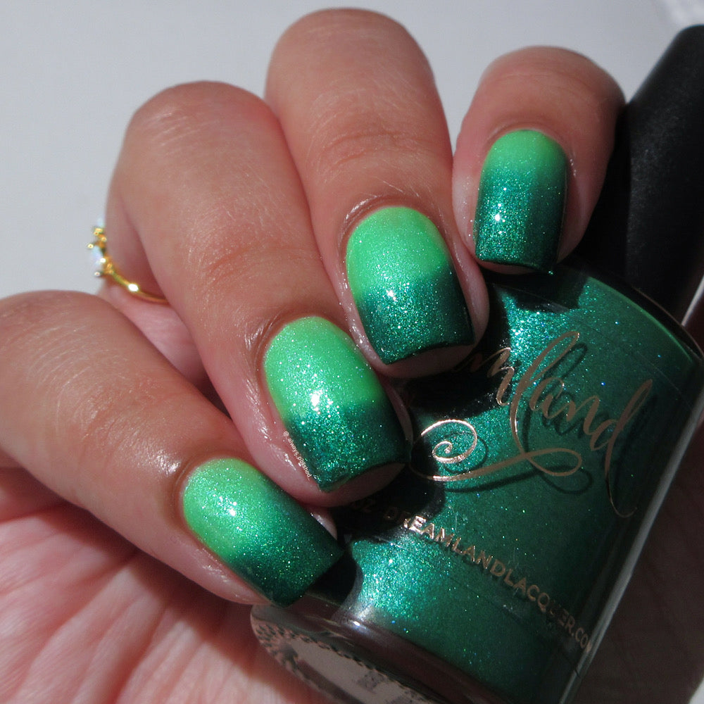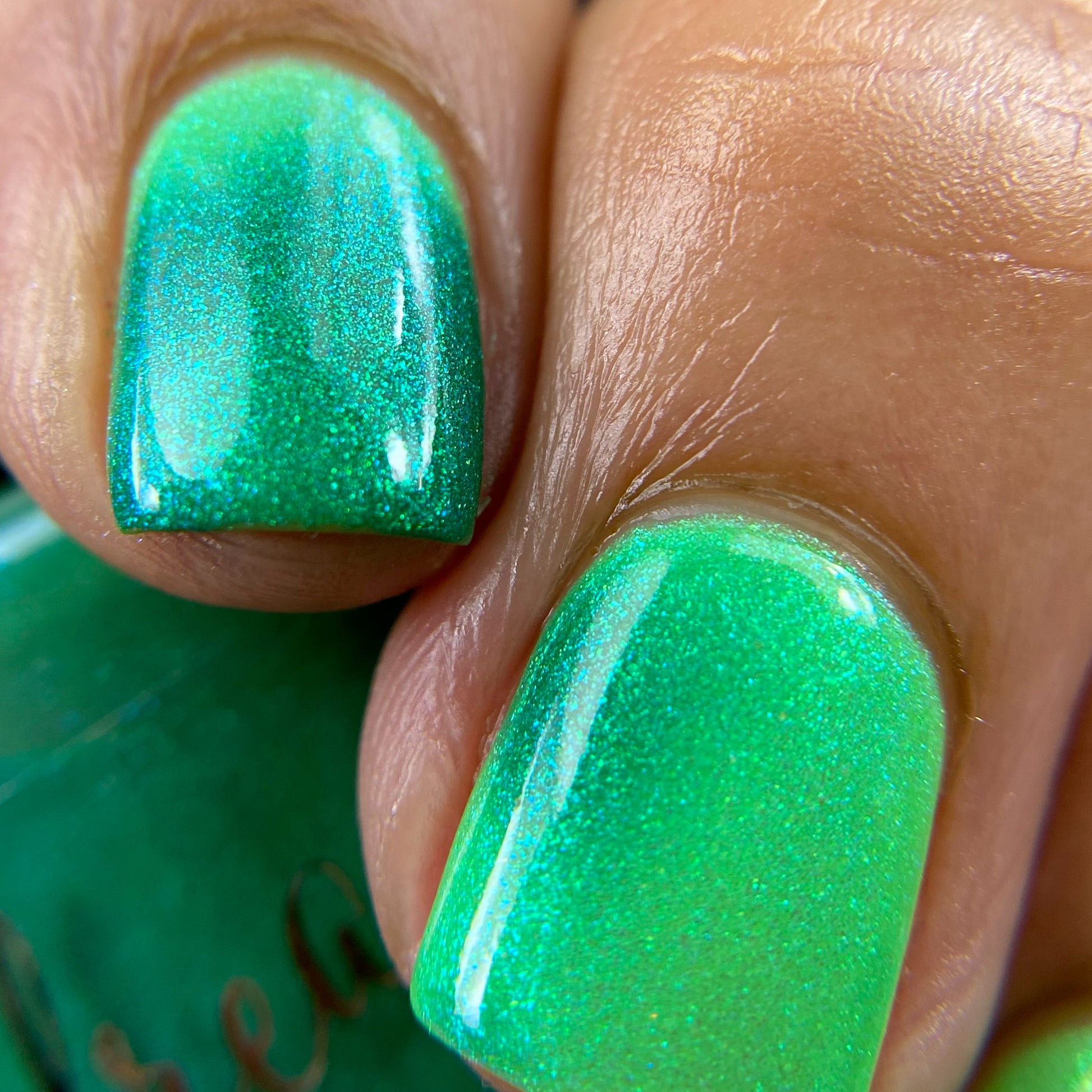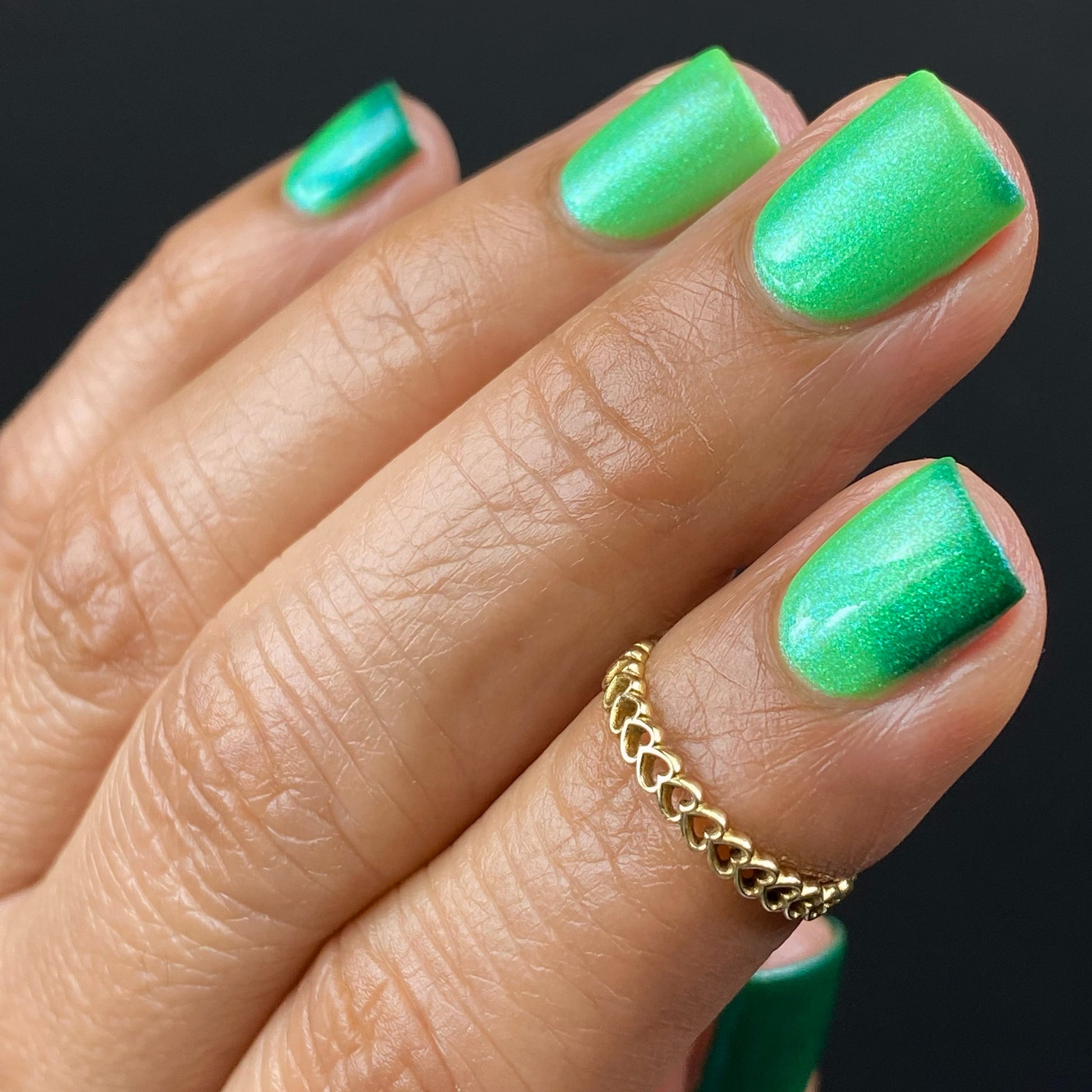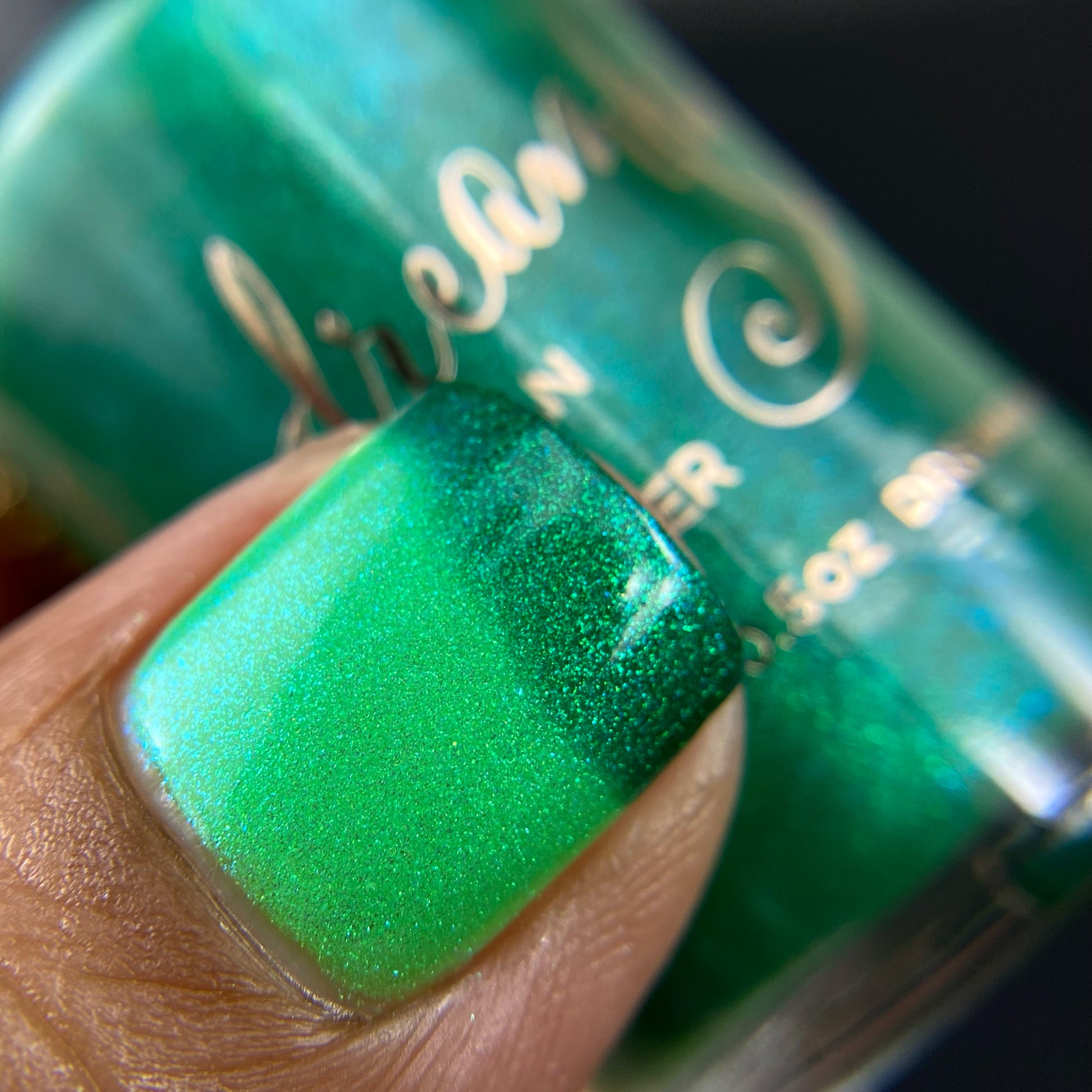 Dark green (cold) to light green (warm) thermal filled with green shifty shimmer. Dries slightly textured. No staining reported. Dries to a satin finish, glossy topcoat always recommended.
