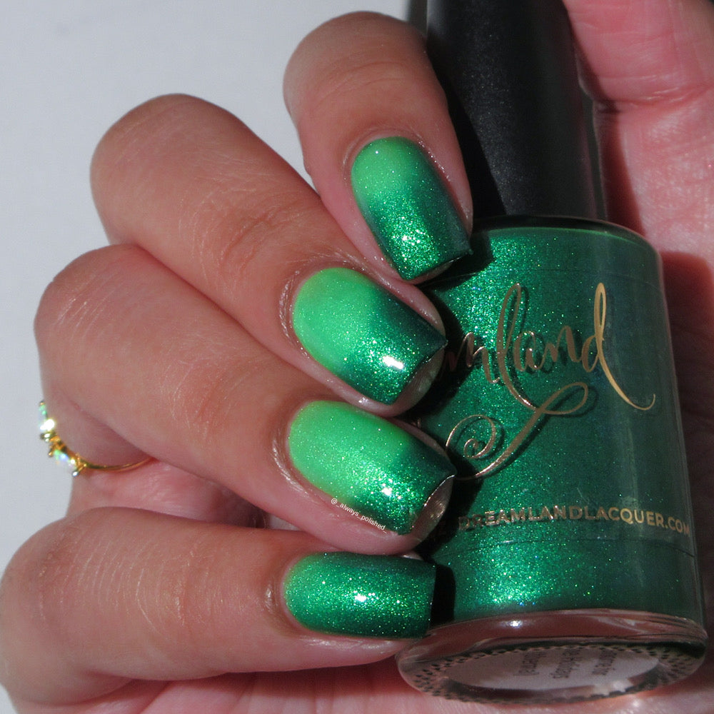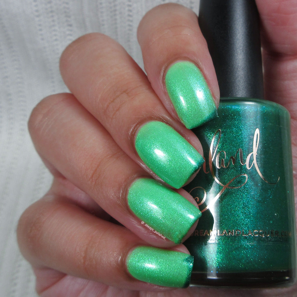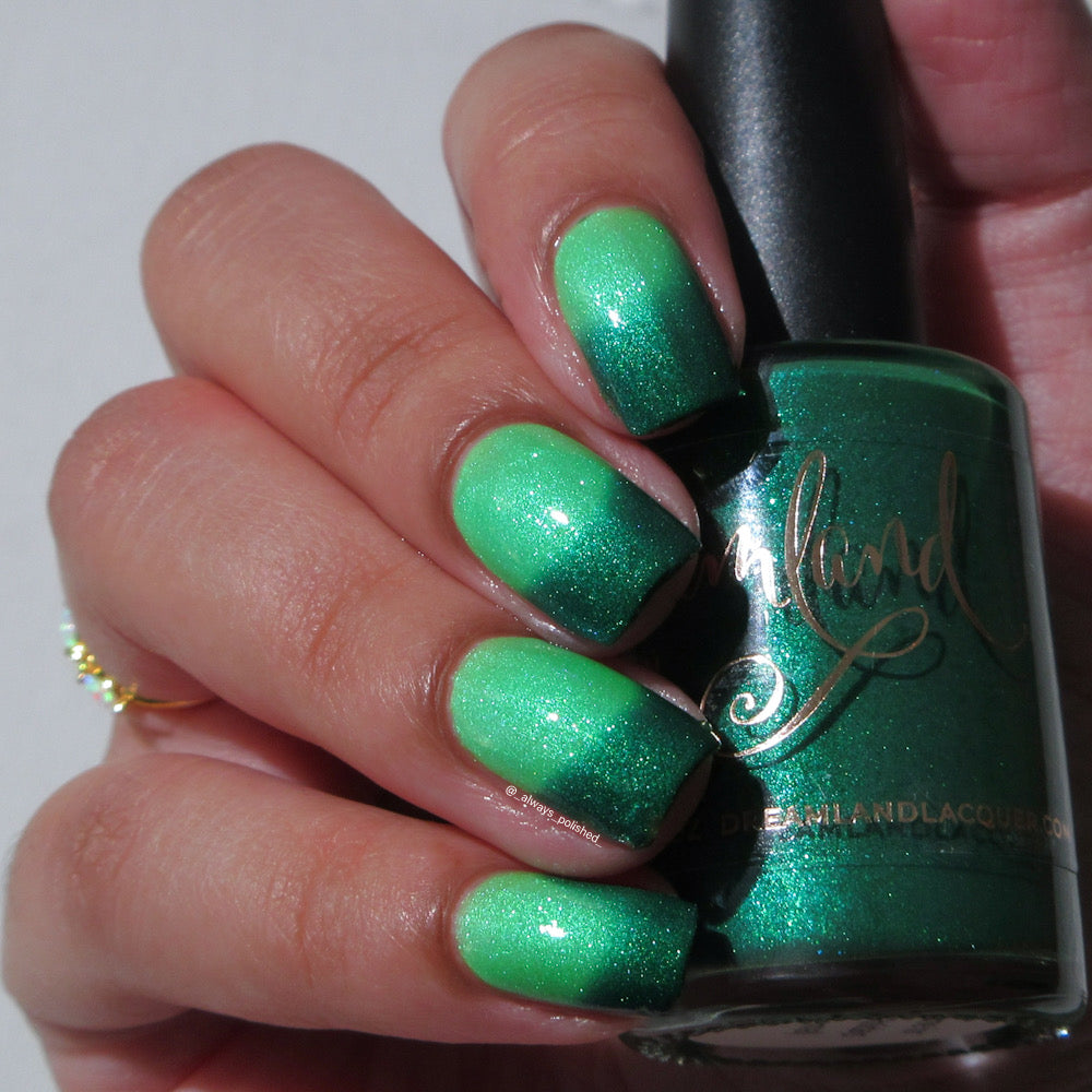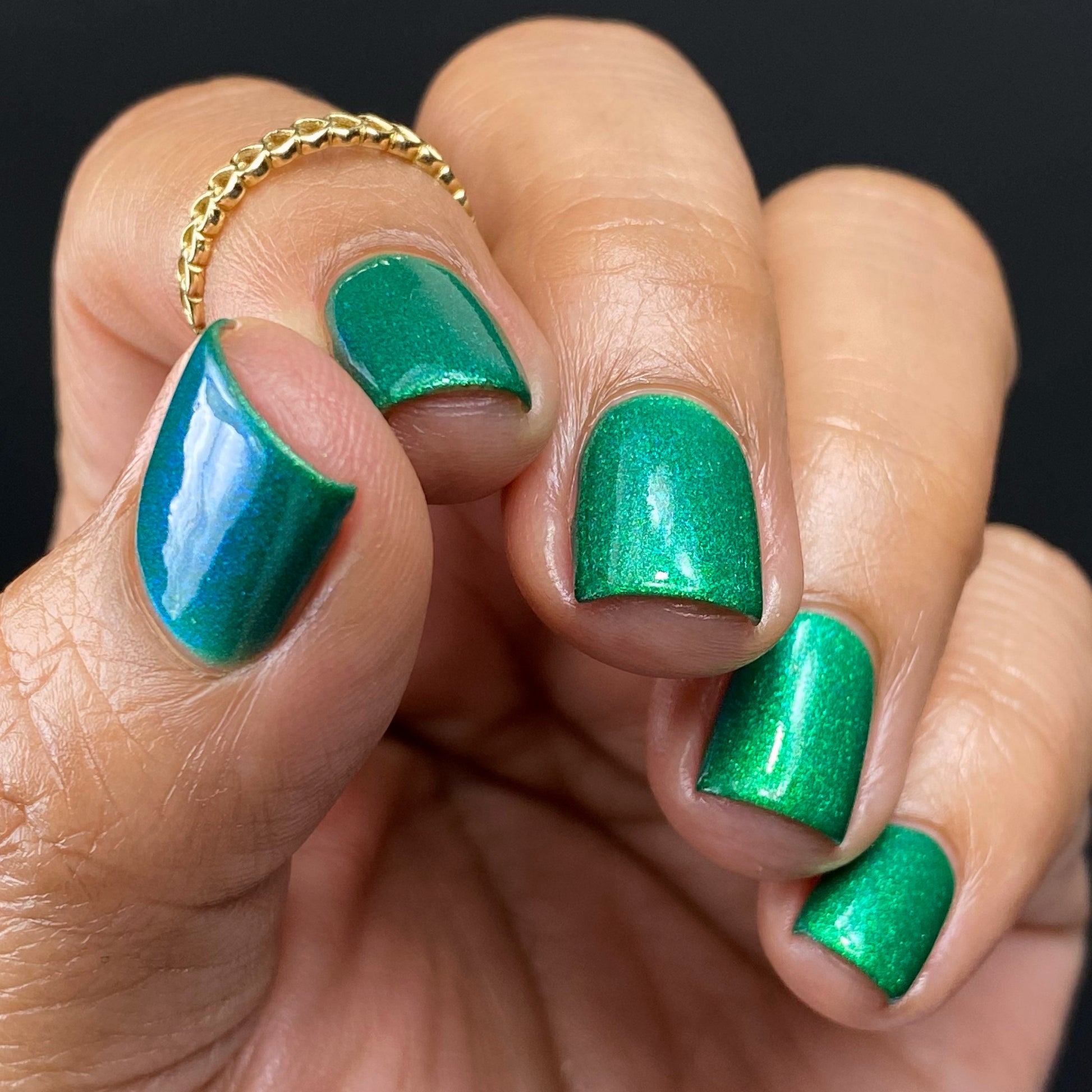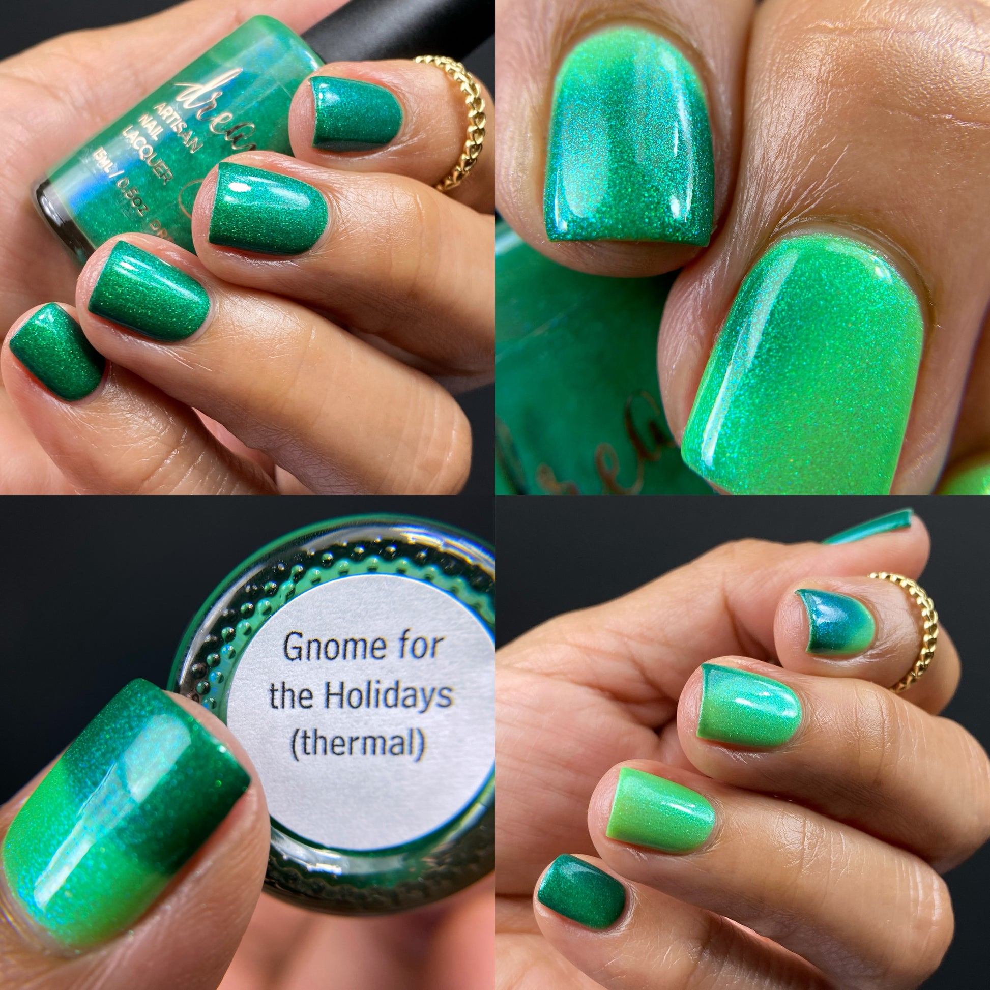 Dark green (cold) to light green (warm) thermal filled with green shifty shimmer. Dries slightly textured. No staining reported. Dries to a satin finish, glossy topcoat always recommended.