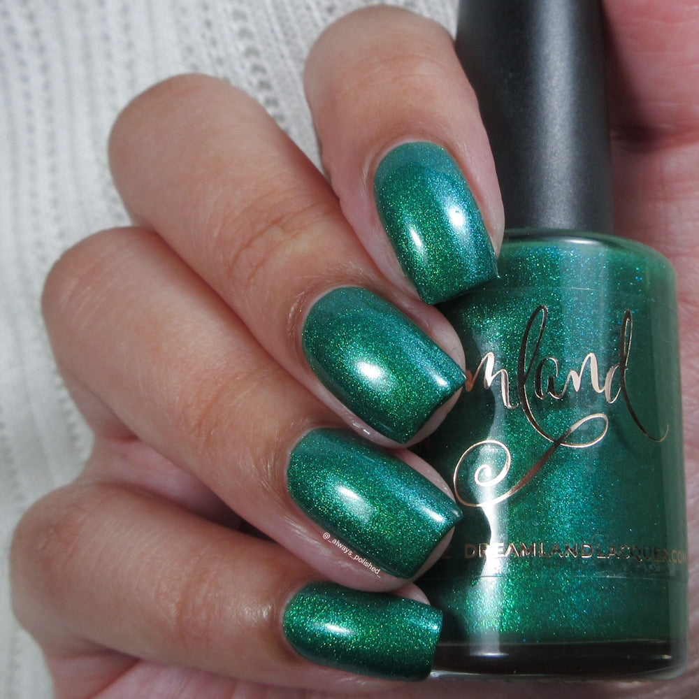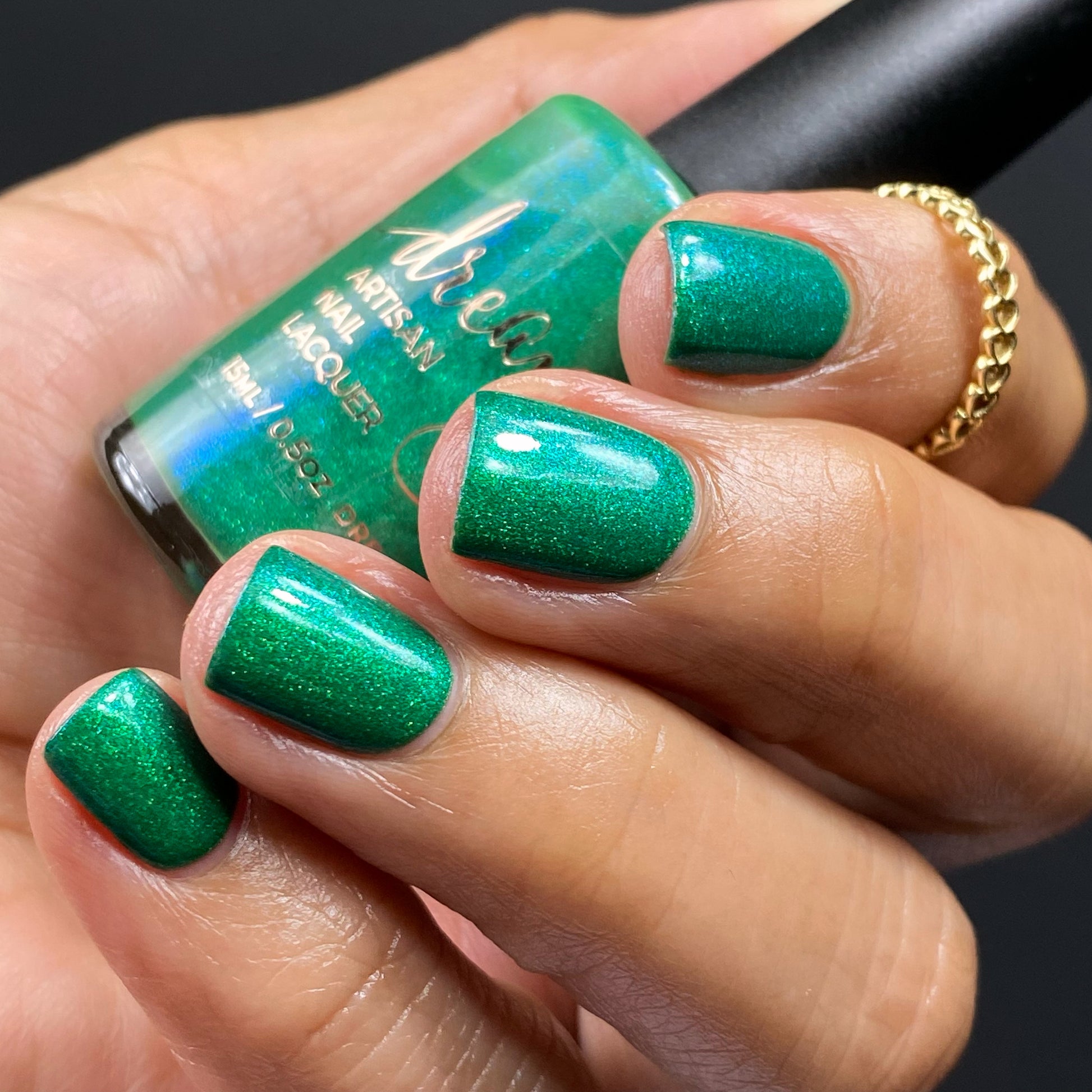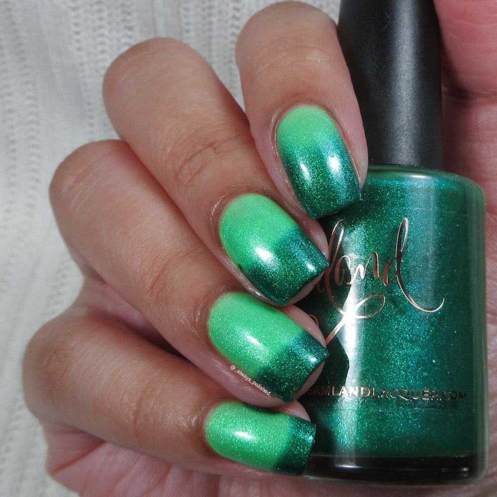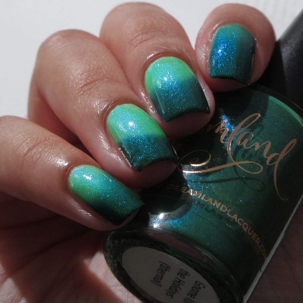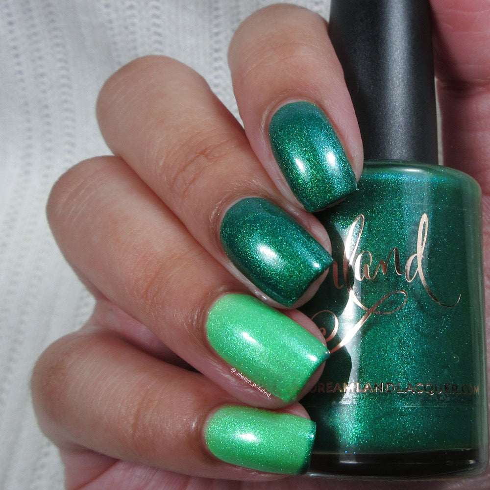 Dark green (cold) to light green (warm) thermal filled with green shifty shimmer. Dries slightly textured. No staining reported. Dries to a satin finish, glossy topcoat always recommended.