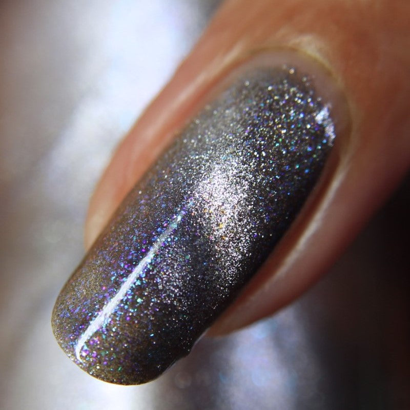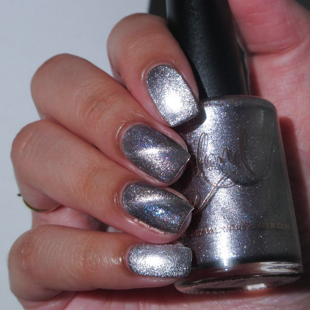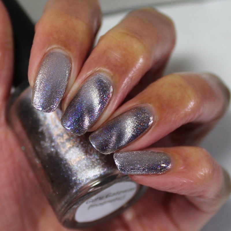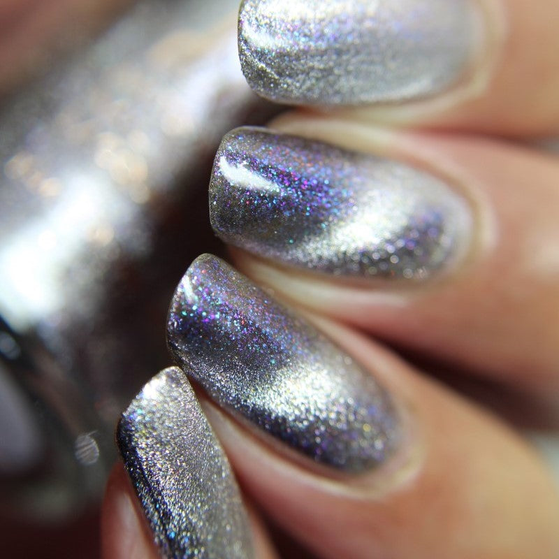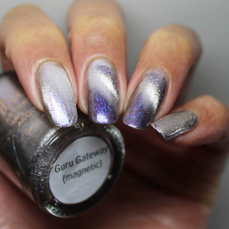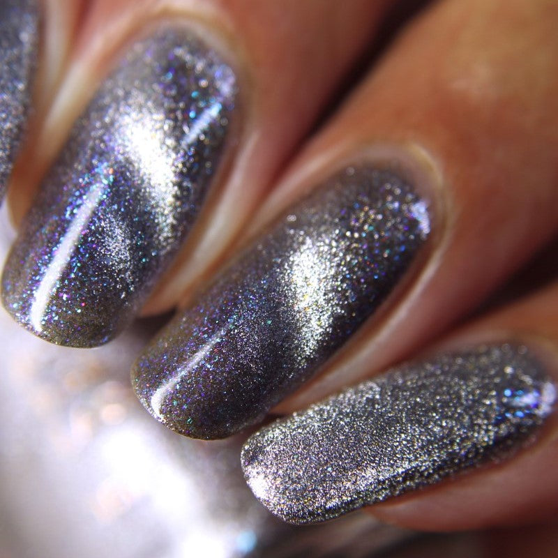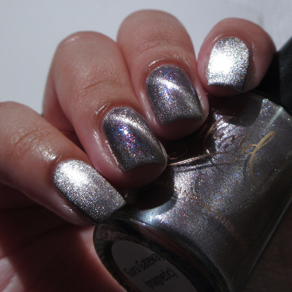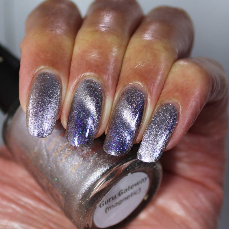 Black based silver magnetic polish filled with blue and purple shifting microflake shimmer. Dries smooth. No staining reported. Dries to a satin finish, glossy top coat recommended for maximum shine.