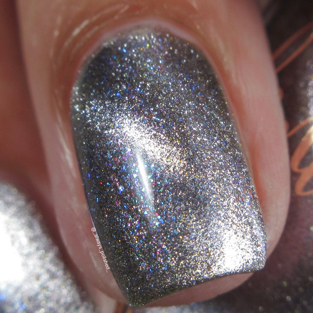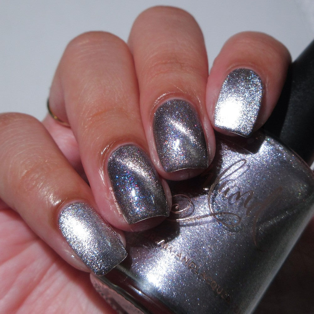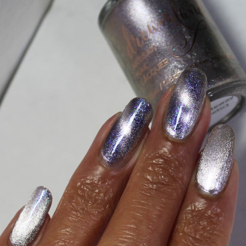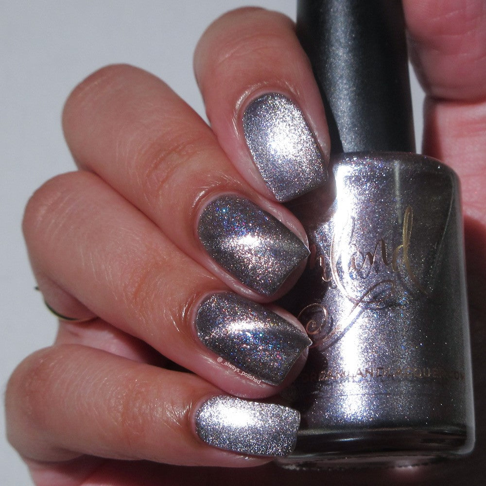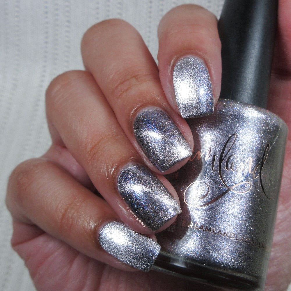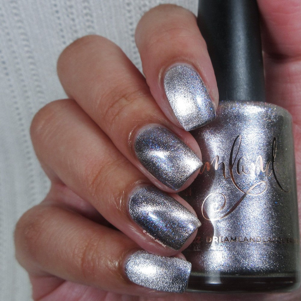 Black based silver magnetic polish filled with blue and purple shifting microflake shimmer. Dries smooth. No staining reported. Dries to a satin finish, glossy top coat recommended for maximum shine.