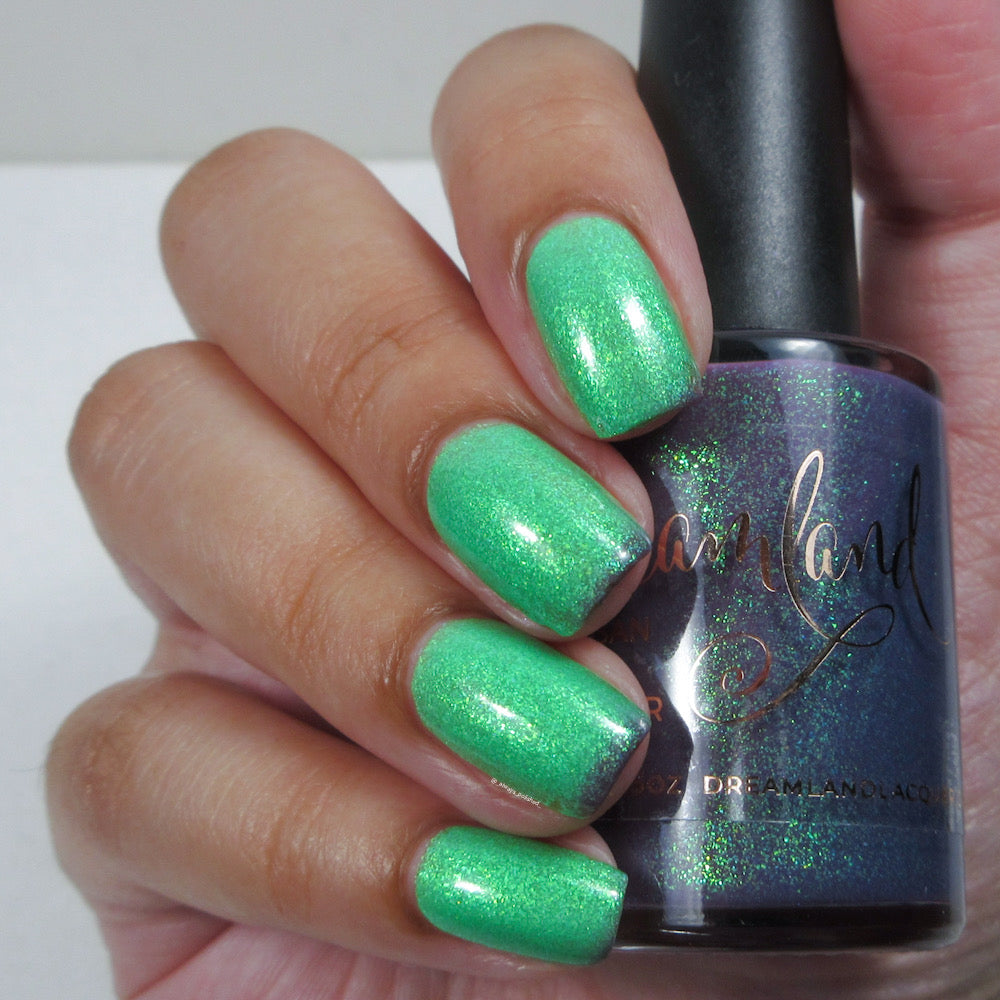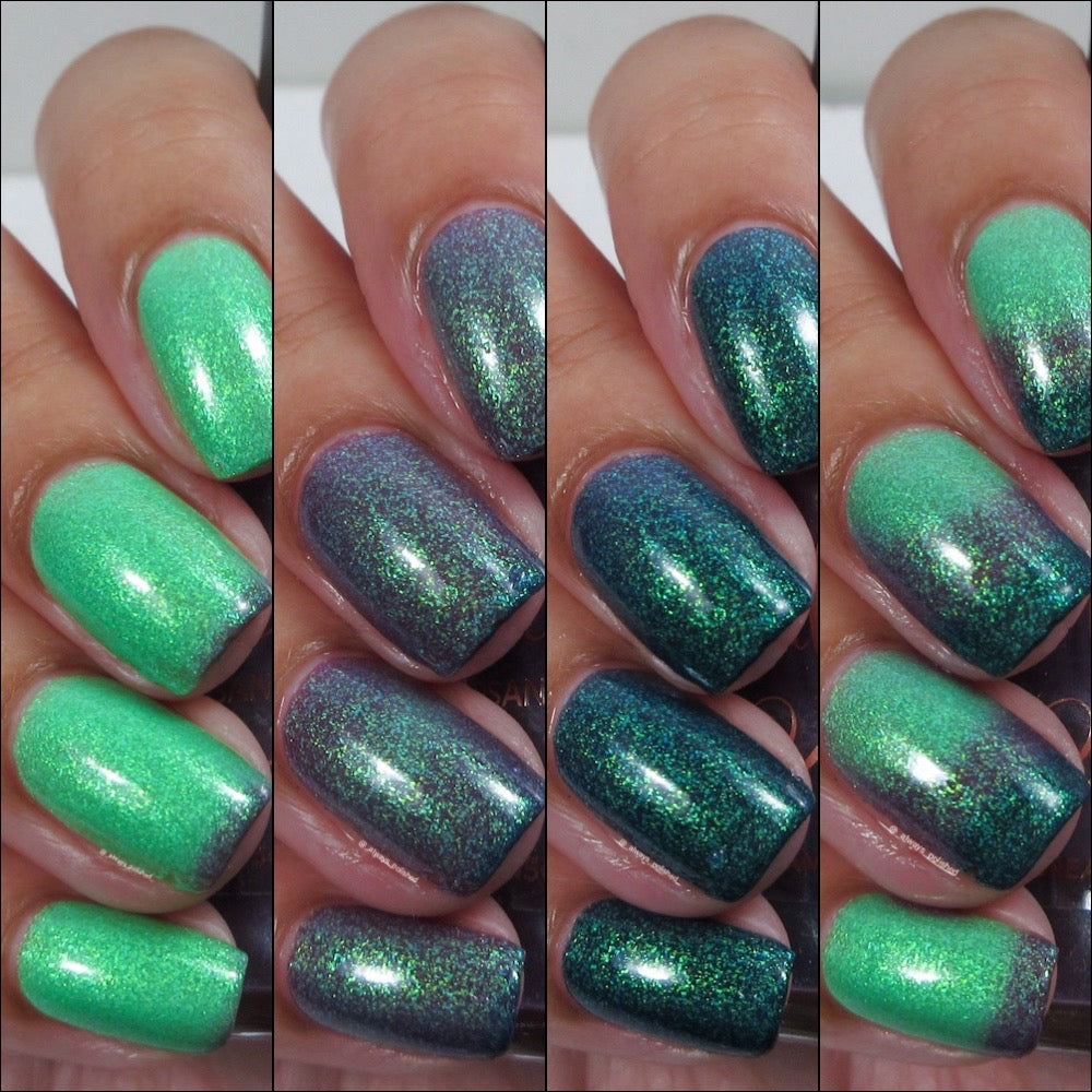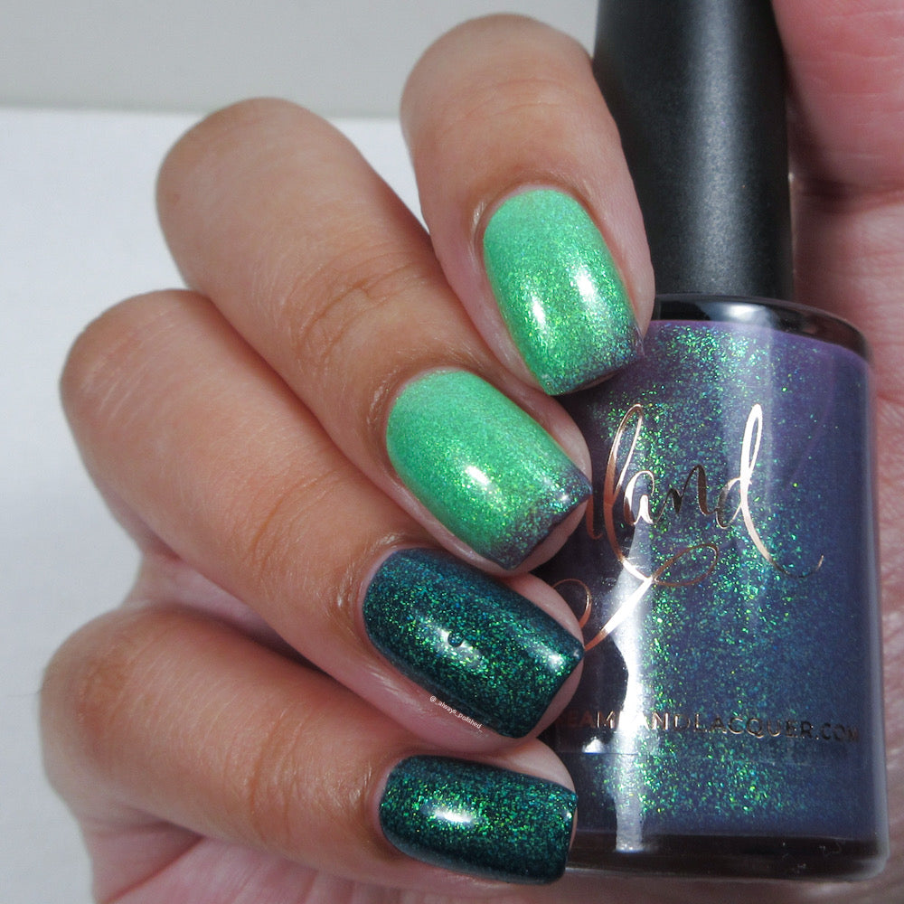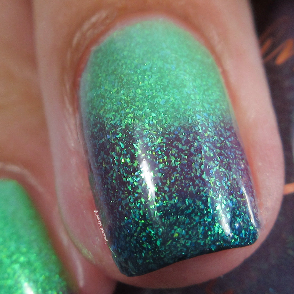 Inspired by Frankenstein's monster. Green to purple to plum trithermal filled with green blue shifty shimmer. Dries smooth. No staining reported. Dries to a satin finish, glossy top coat recommended for maximum shine.