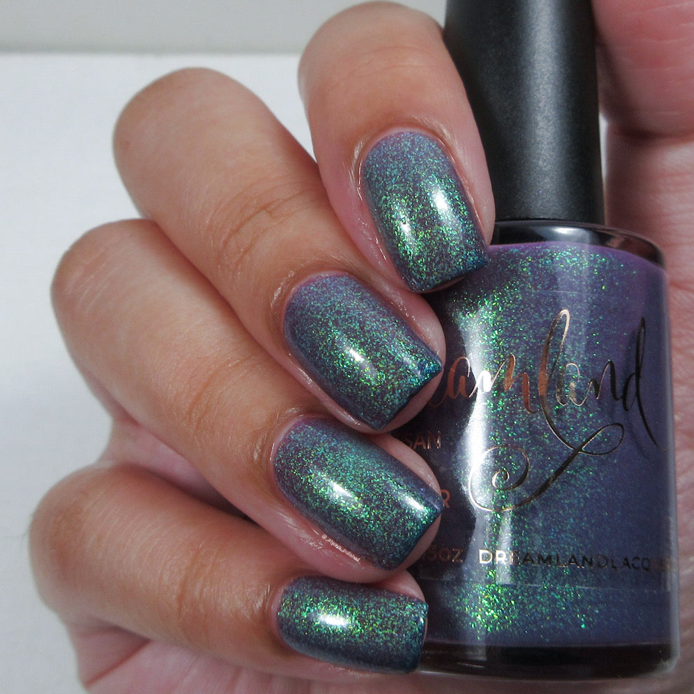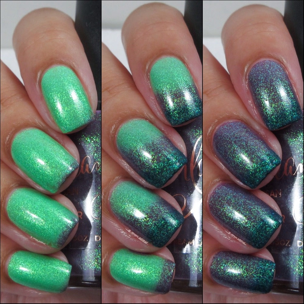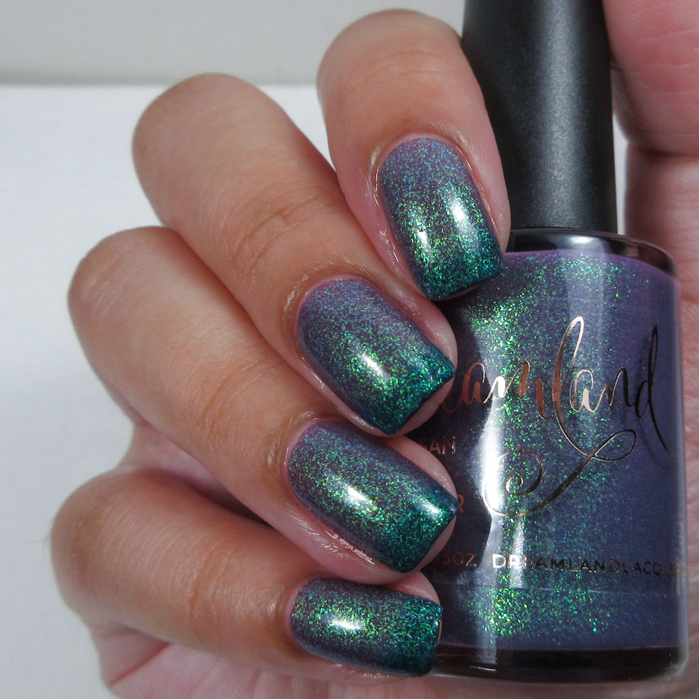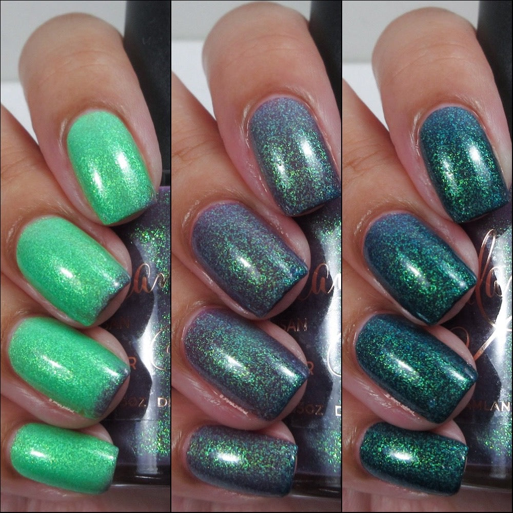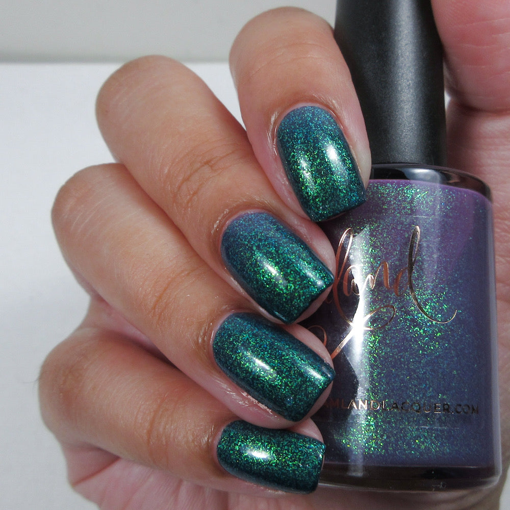 Inspired by Frankenstein's monster. Green to purple to plum trithermal filled with green blue shifty shimmer. Dries smooth. No staining reported. Dries to a satin finish, glossy top coat recommended for maximum shine.