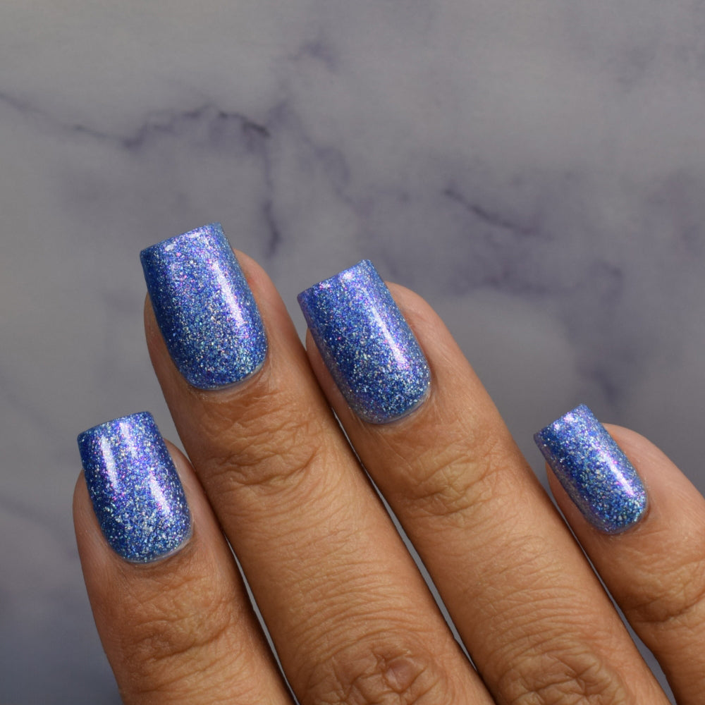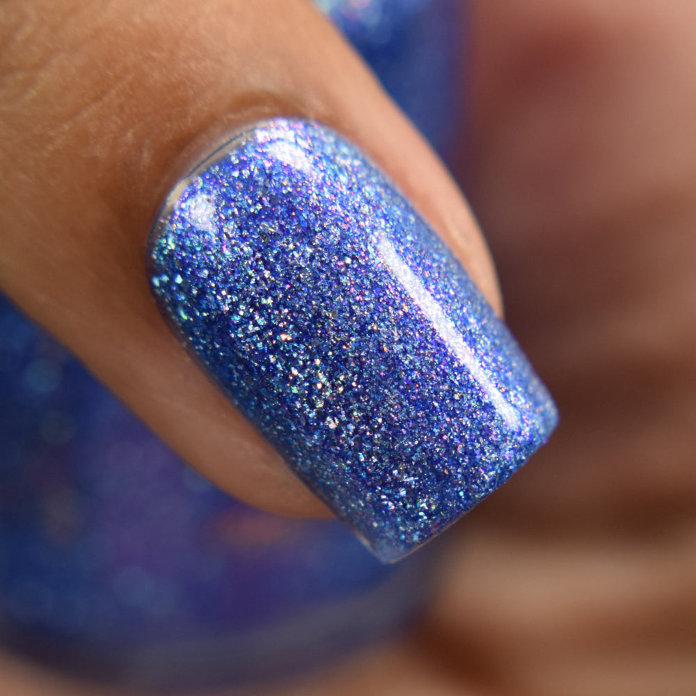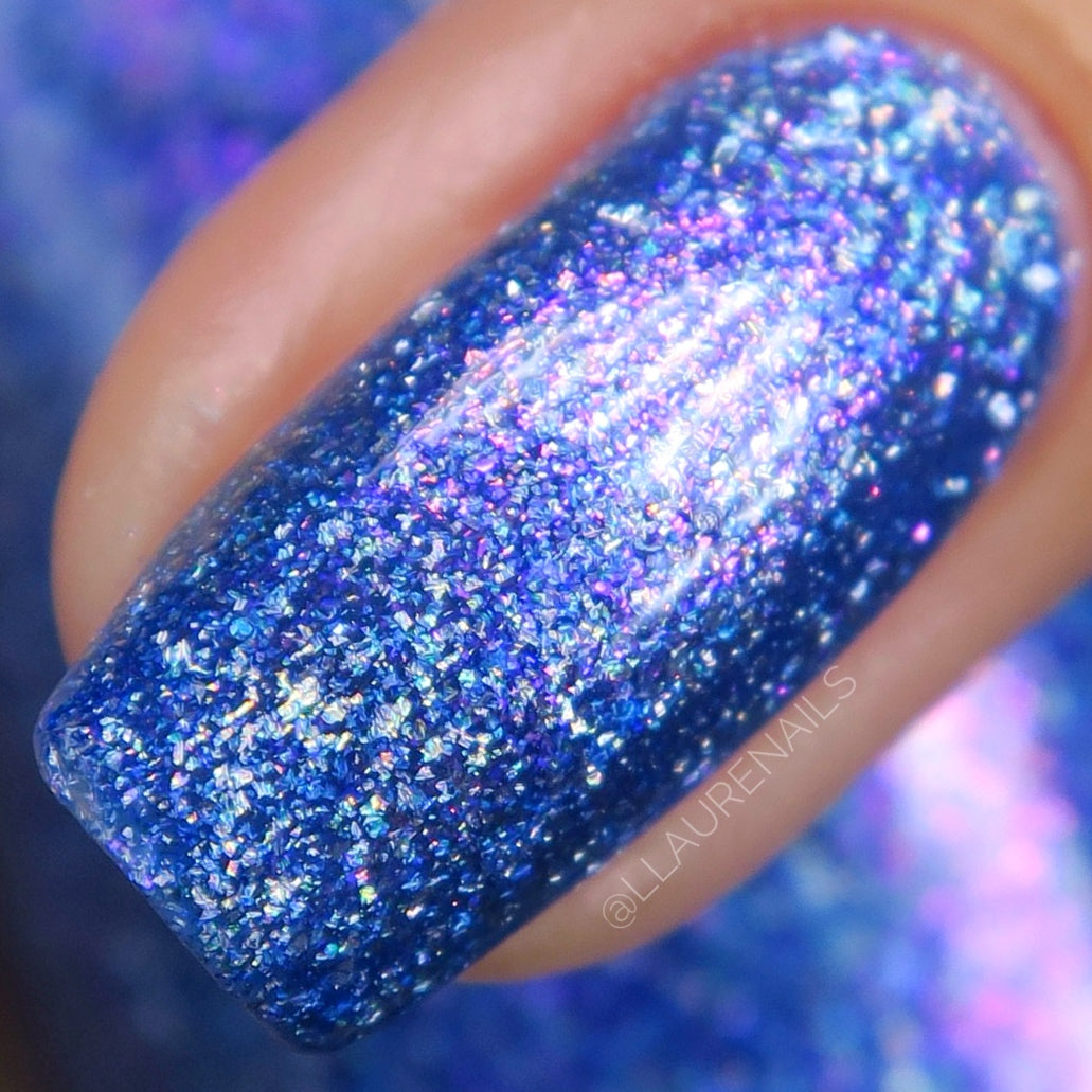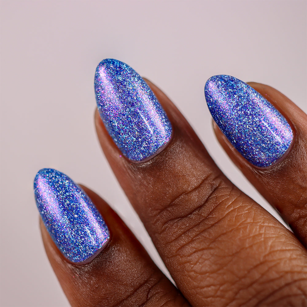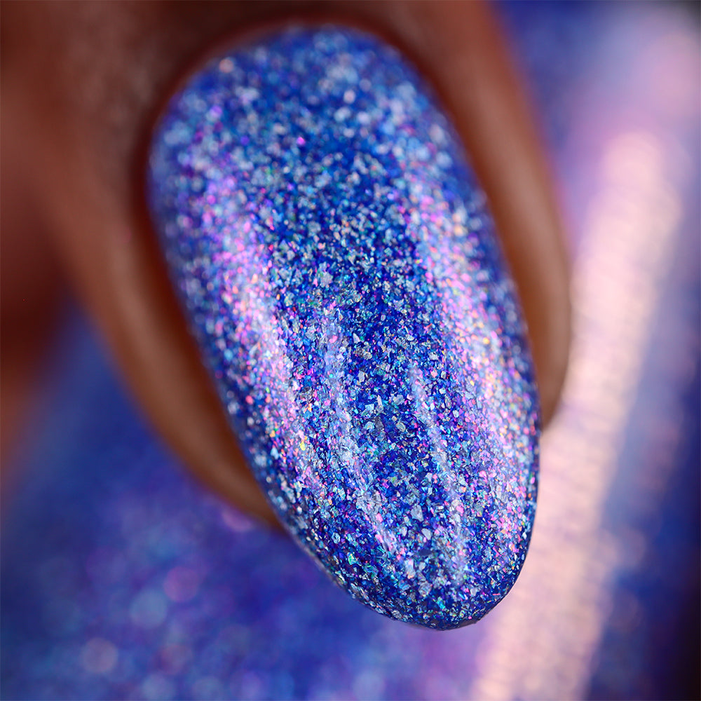 Medium violet-leaning blue filled with holo flakes and pink and purple shifty shimmers.