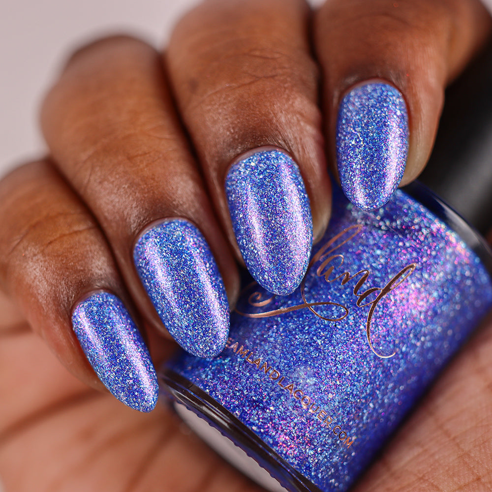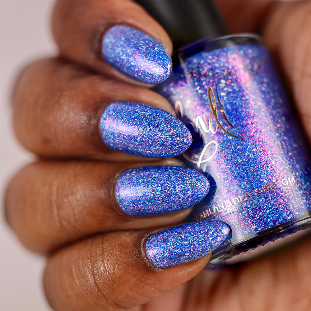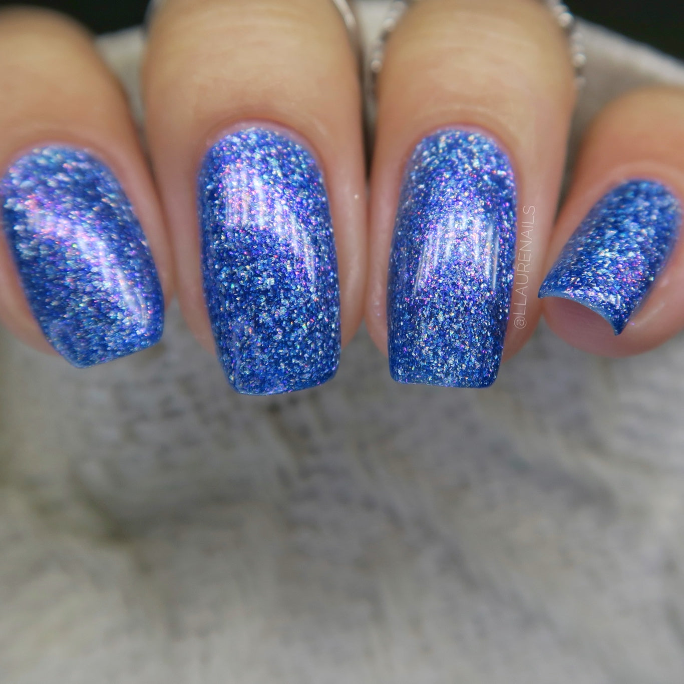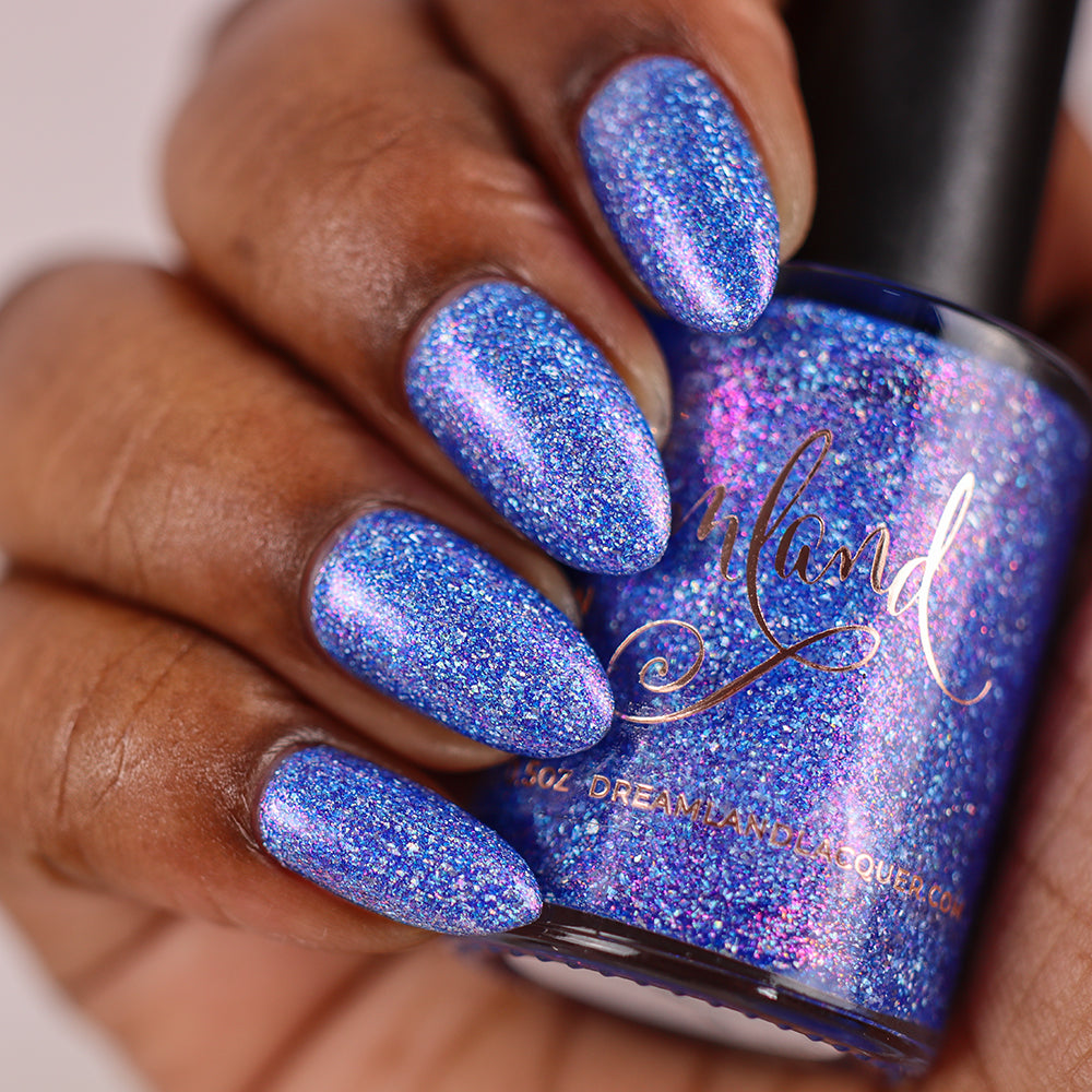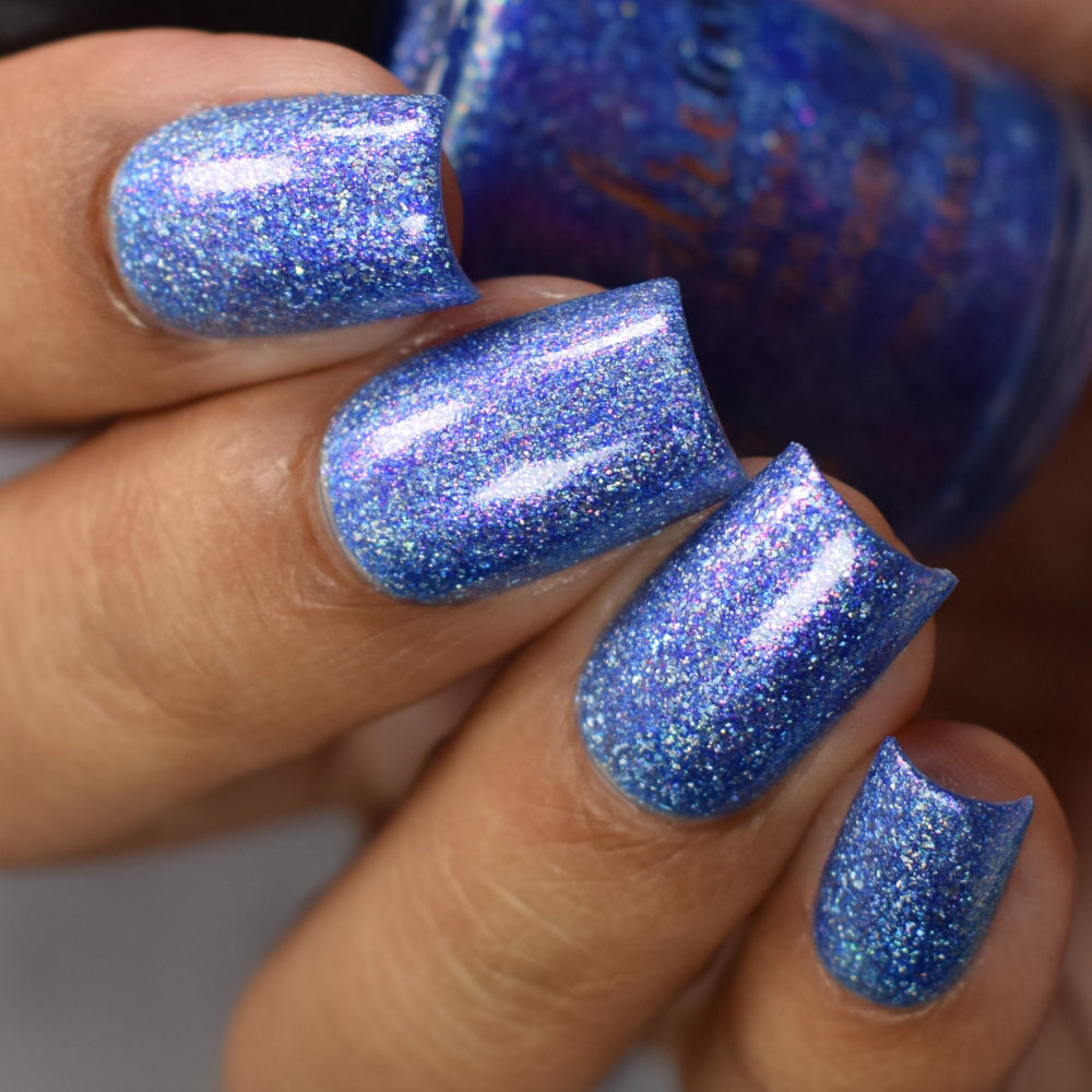 Medium violet-leaning blue filled with holo flakes and pink and purple shifty shimmers.