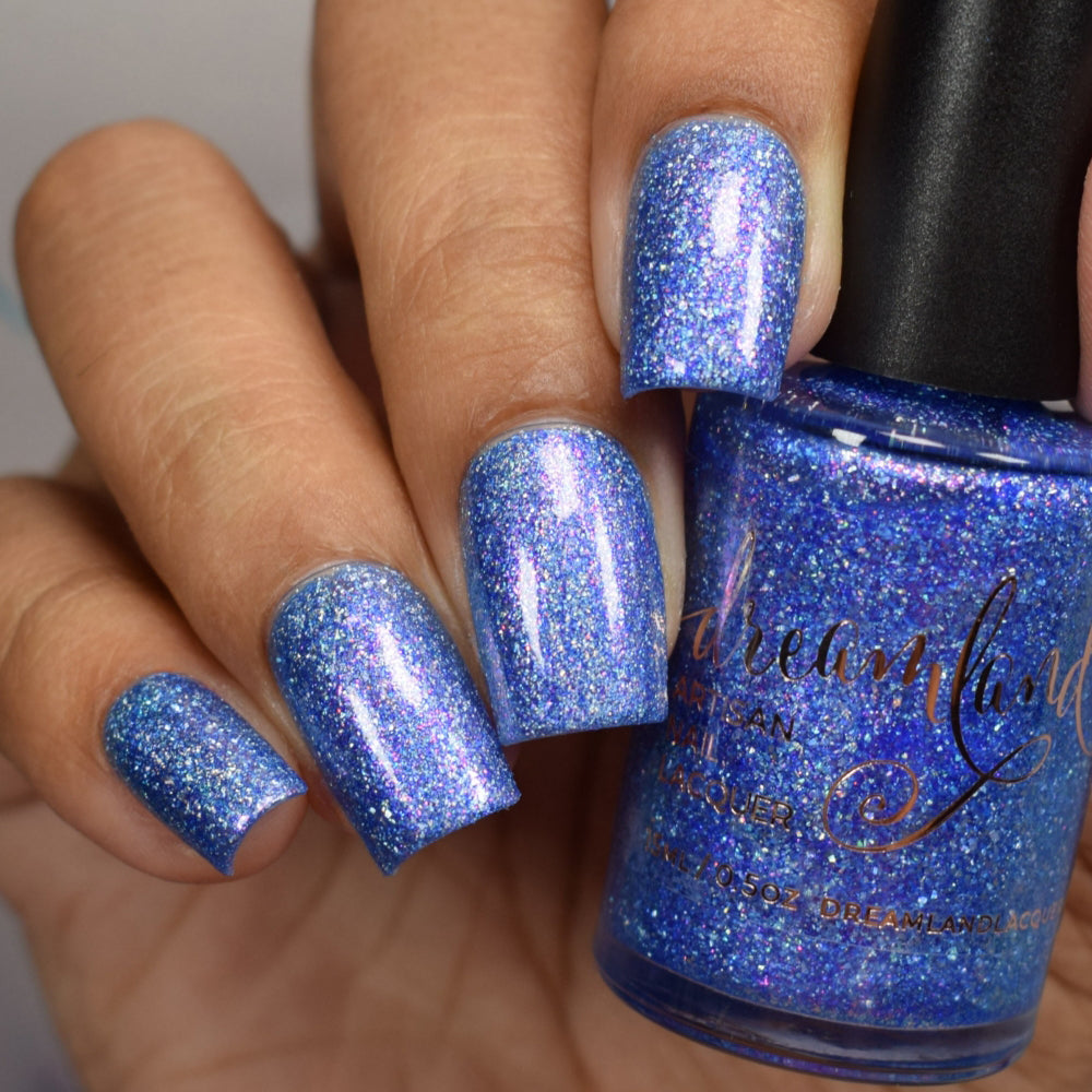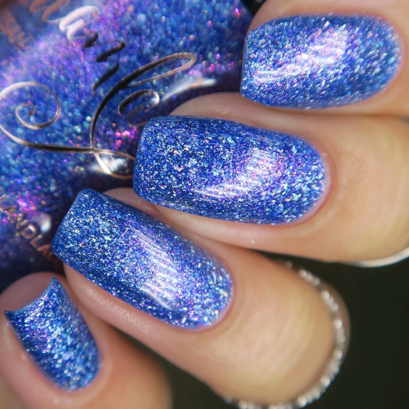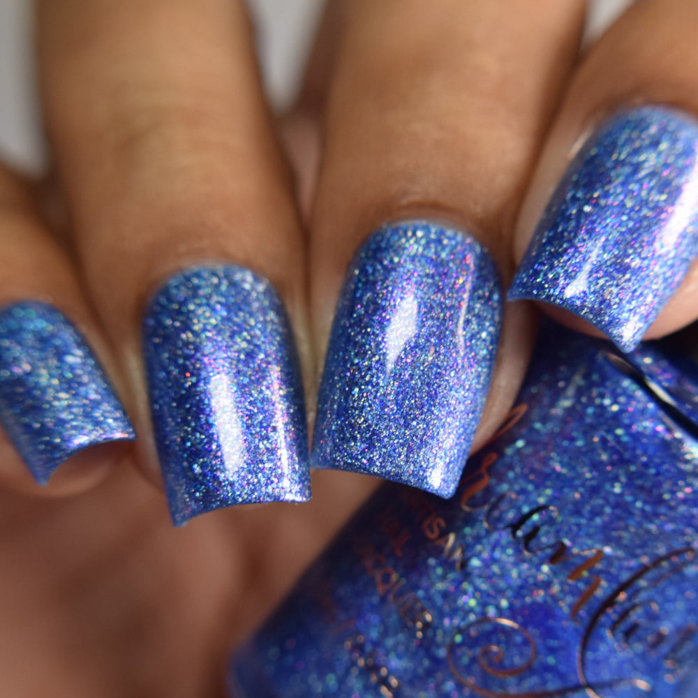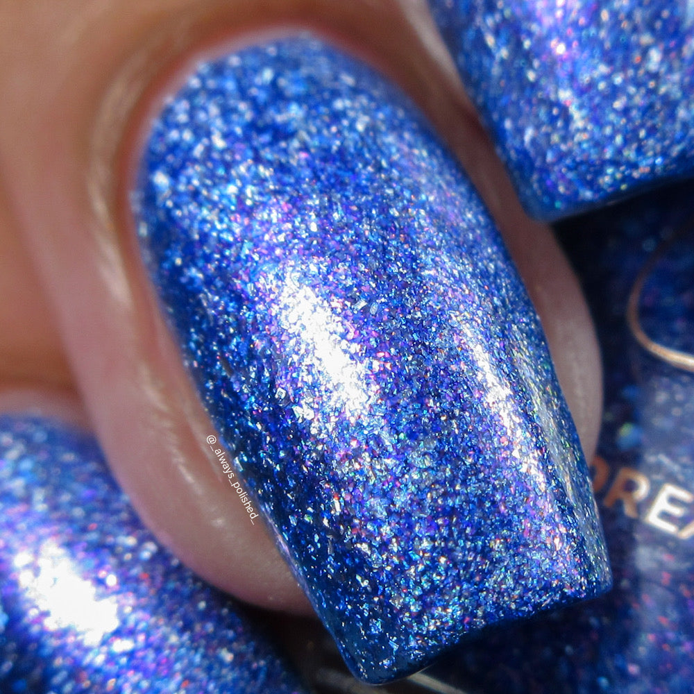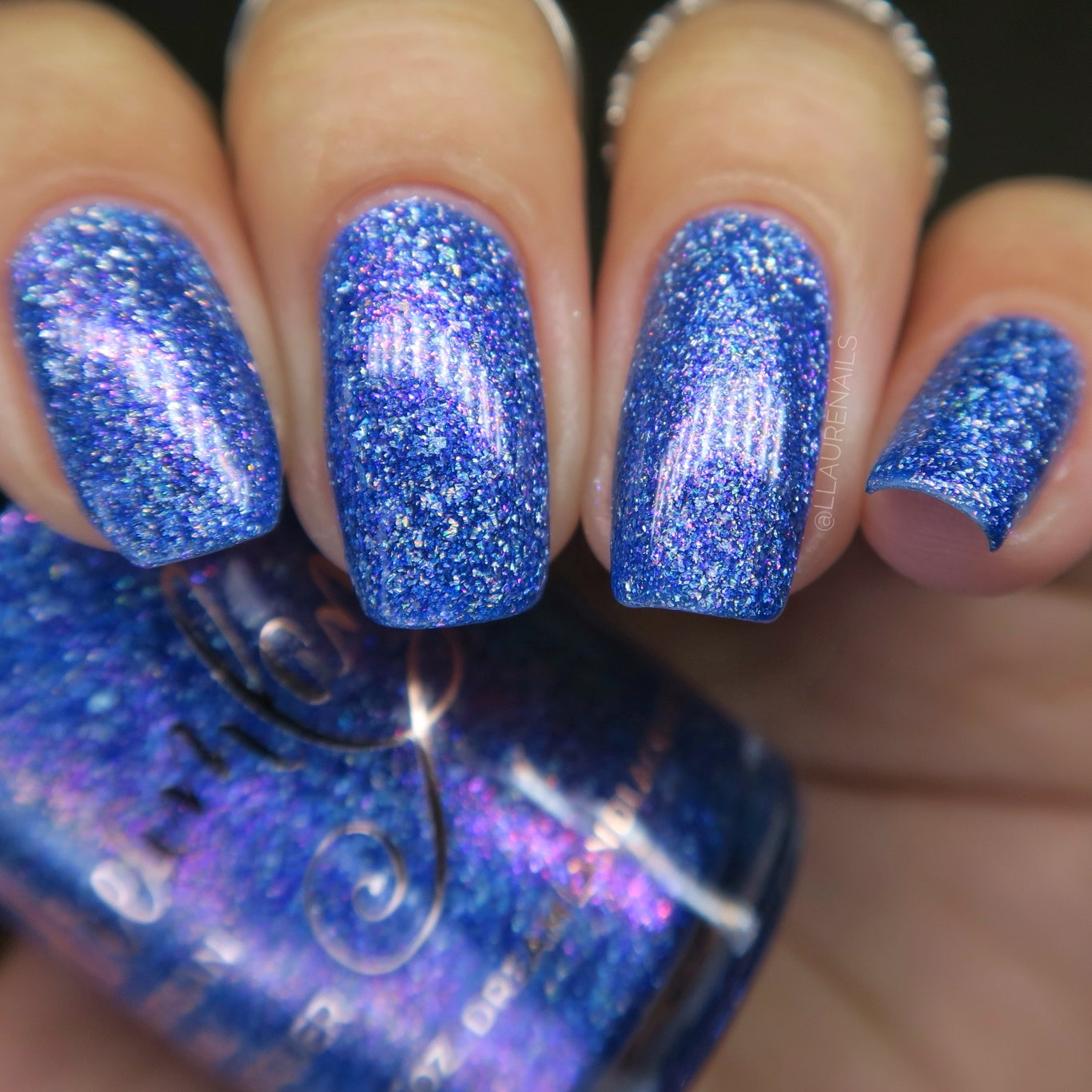 Medium violet-leaning blue filled with holo flakes and pink and purple shifty shimmers.