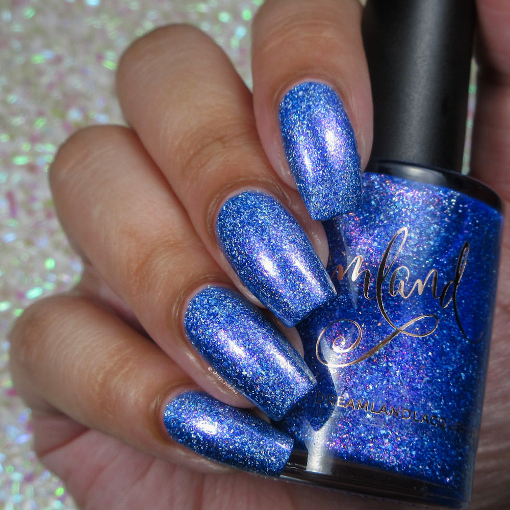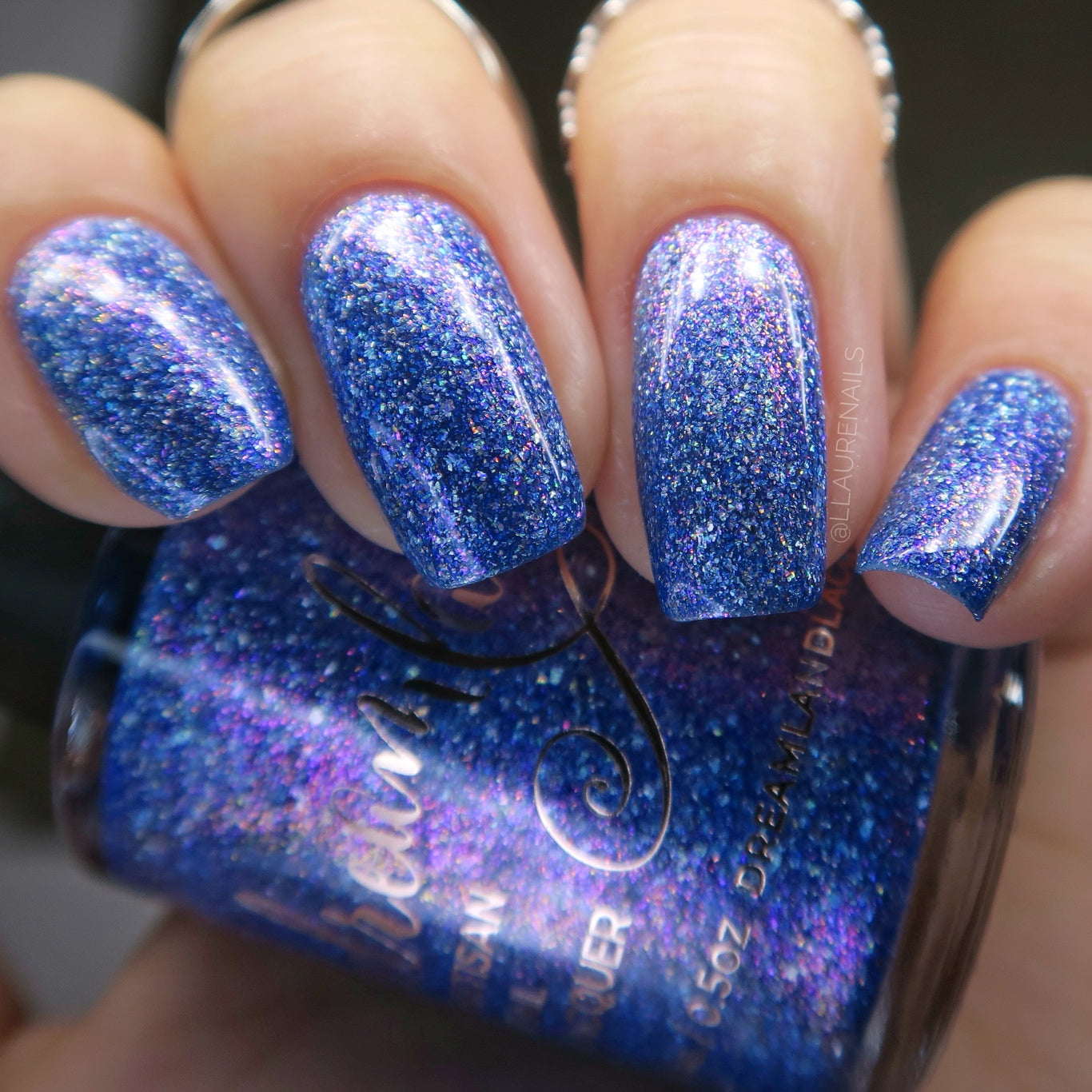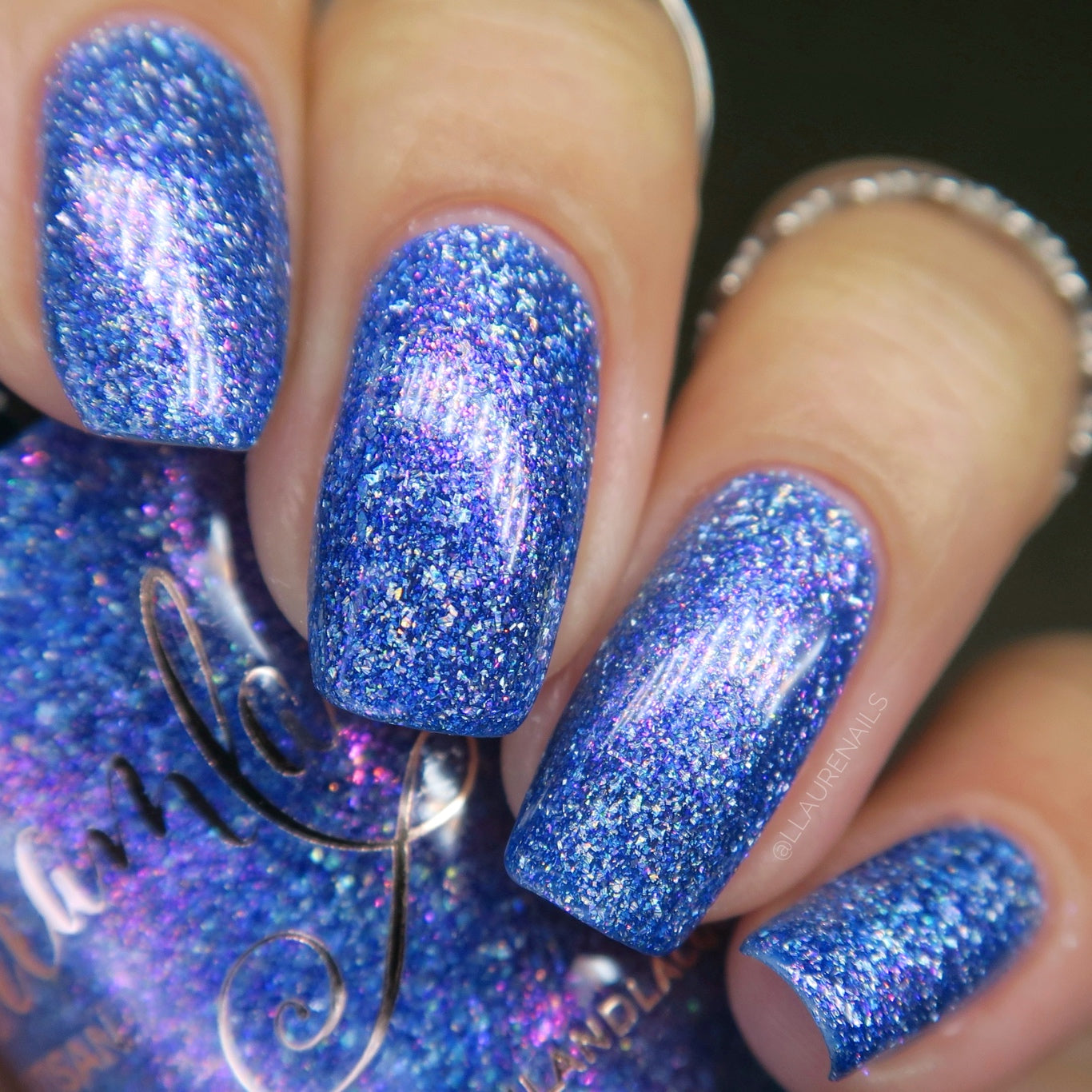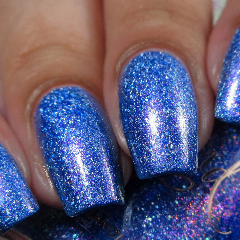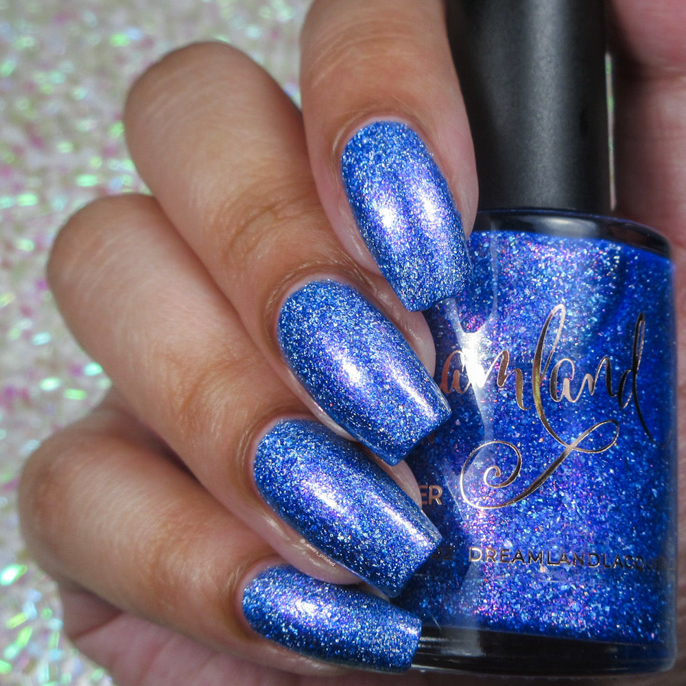 Medium violet-leaning blue filled with holo flakes and pink and purple shifty shimmers.