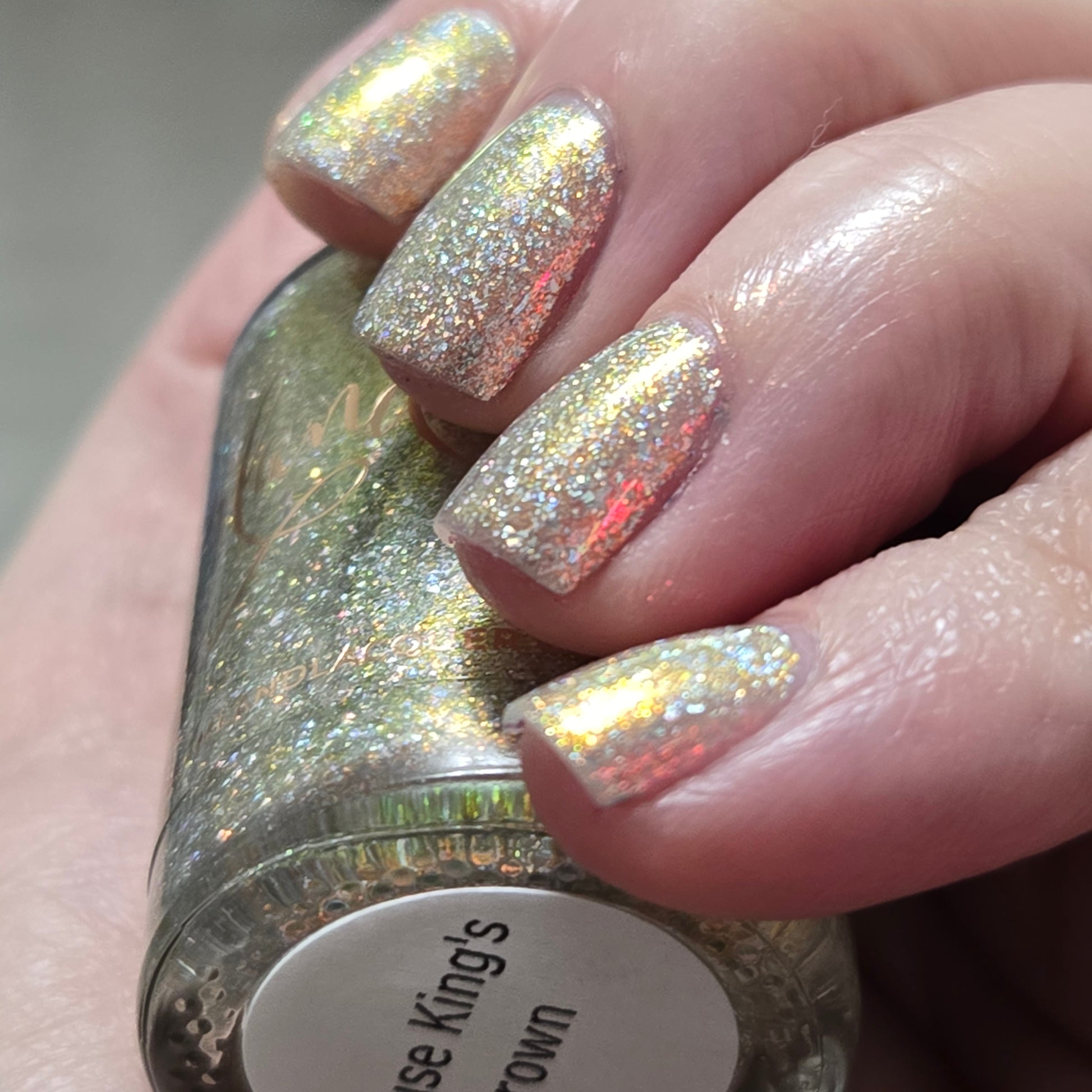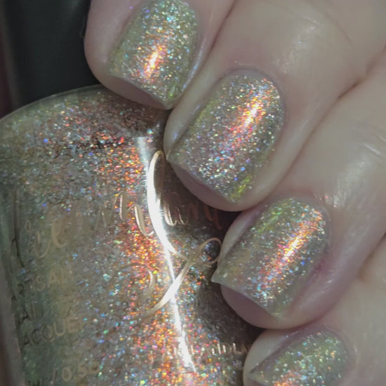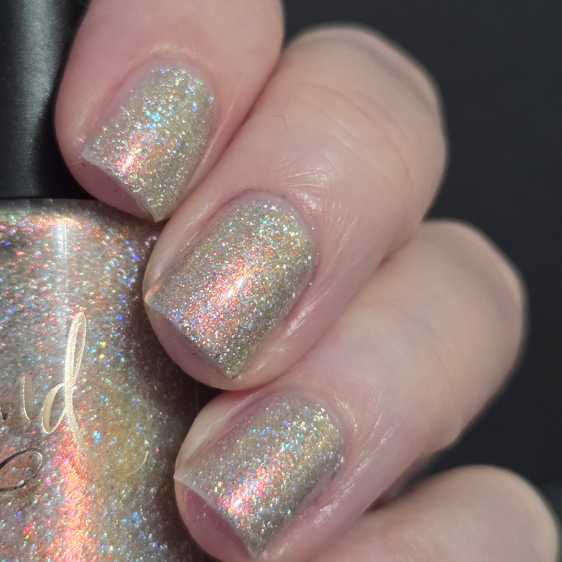 Orange shifty shimmer and holographic flakes that reads as a champagne beige on the nail. Opaque in 2-3 coats. Dries smooth. High quality base and top coat always recommended for maximum shine and wear. No staining reported. This is a cousin to Candy Cane Crumbles from 2024.