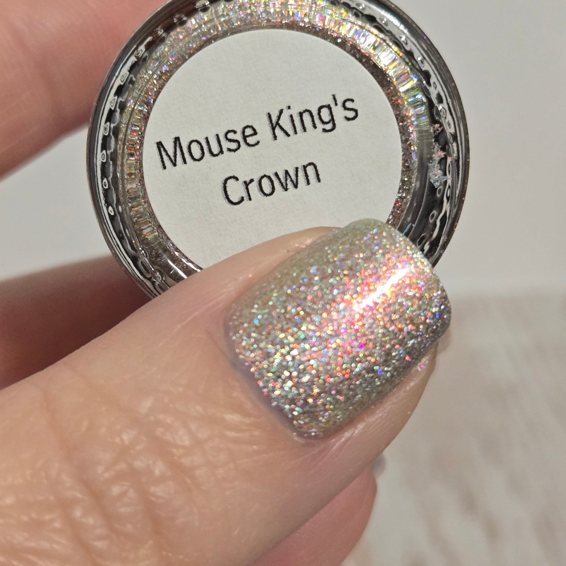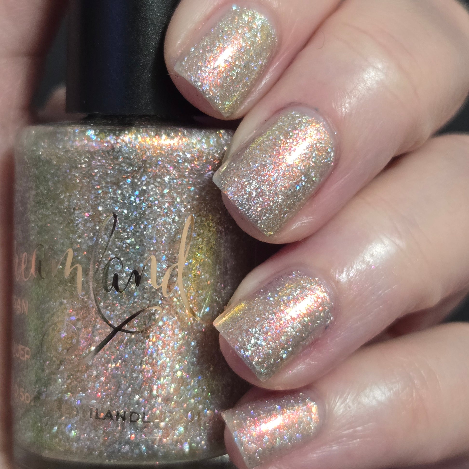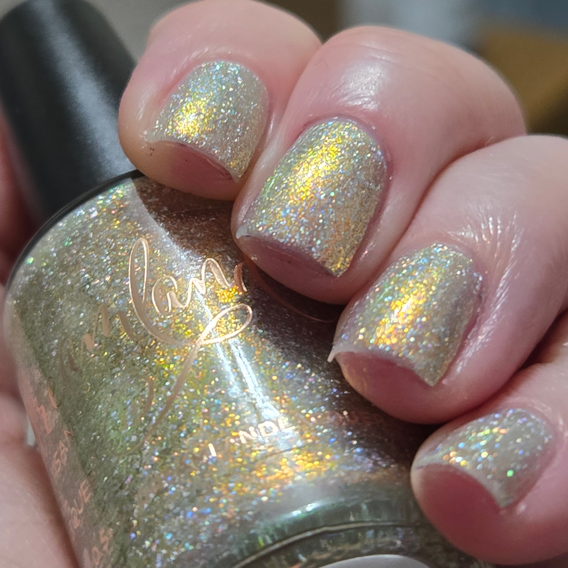 Orange shifty shimmer and holographic flakes that reads as a champagne beige on the nail. Opaque in 2-3 coats. Dries smooth. High quality base and top coat always recommended for maximum shine and wear. No staining reported. This is a cousin to Candy Cane Crumbles from 2024.