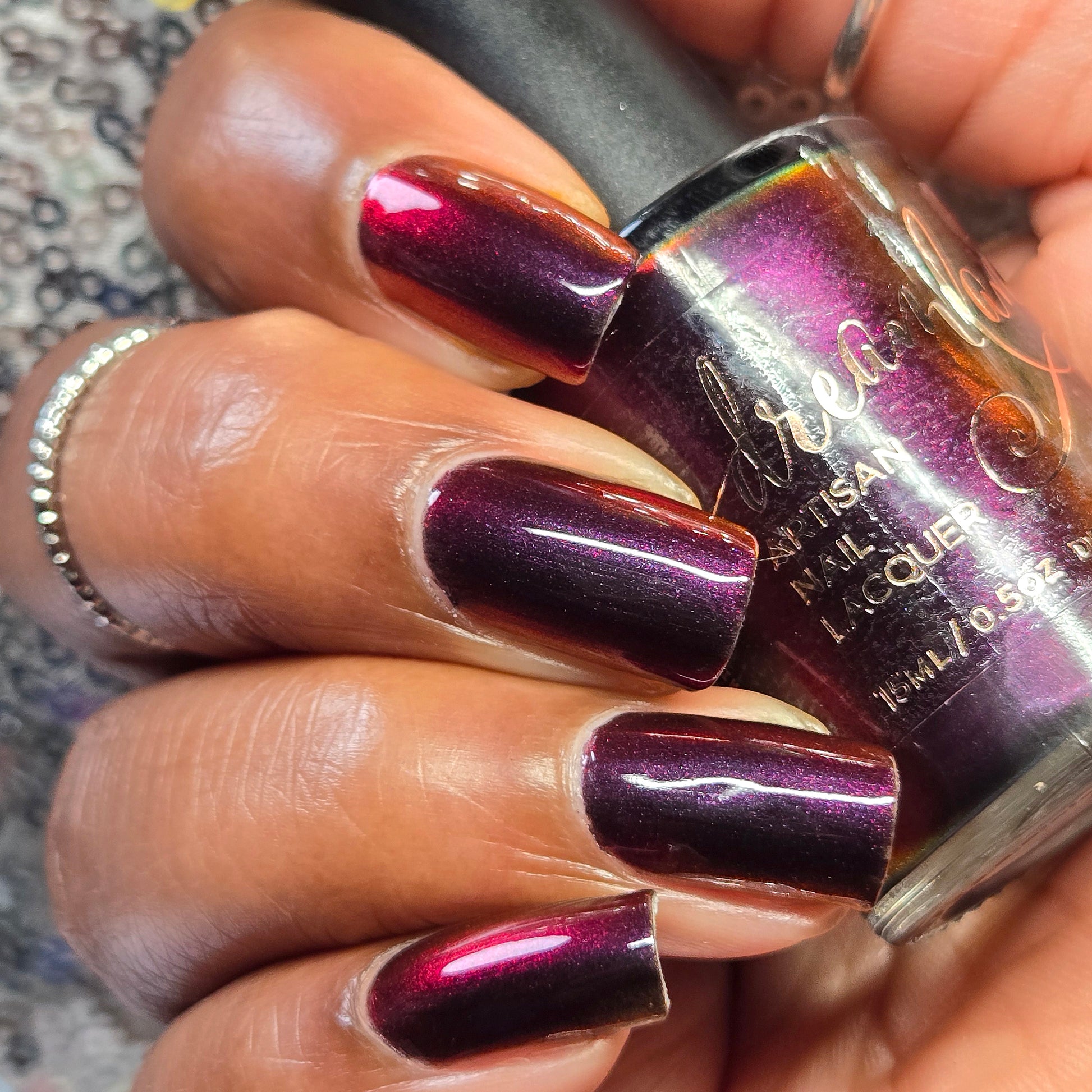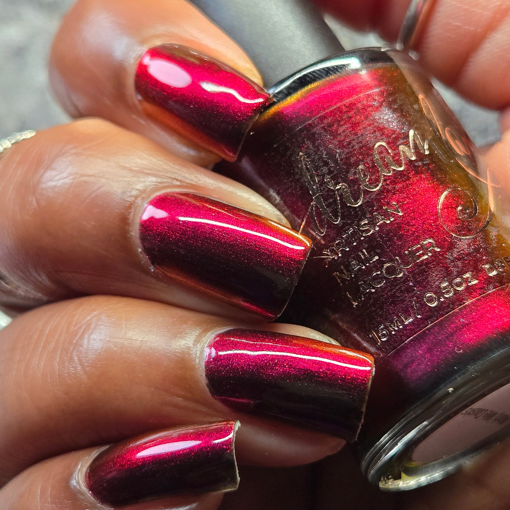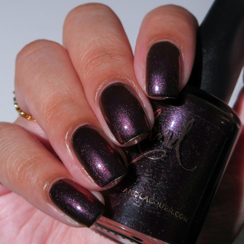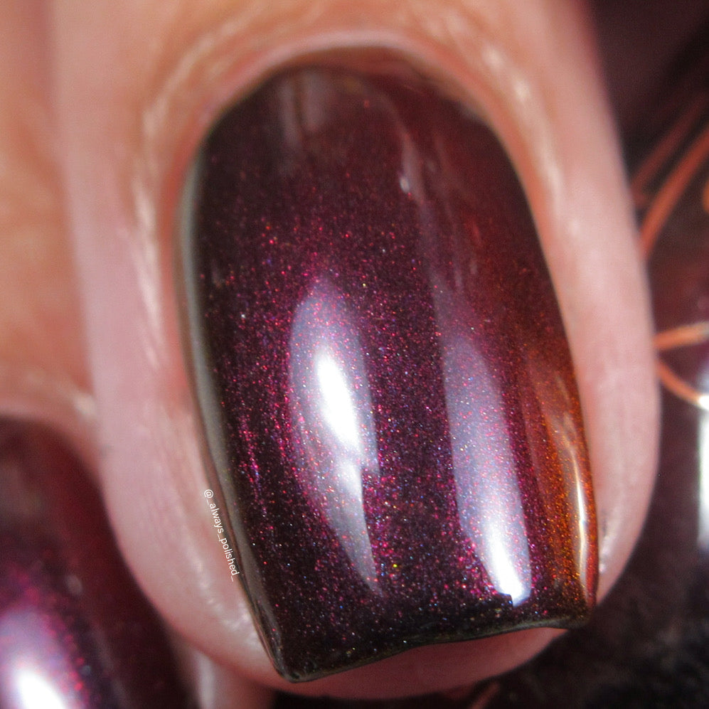 Inspired by Stack from the 2025 film Sinners. Black to red to golden orange multichrome. Opaque in 2-3 coats. Dries smooth. No staining reported.