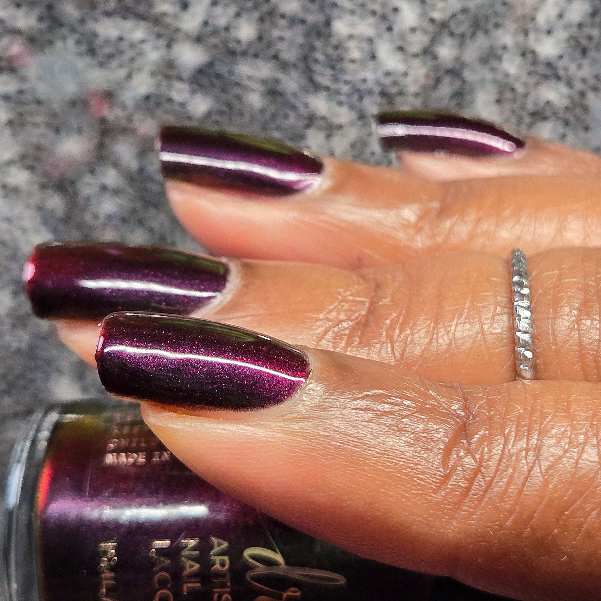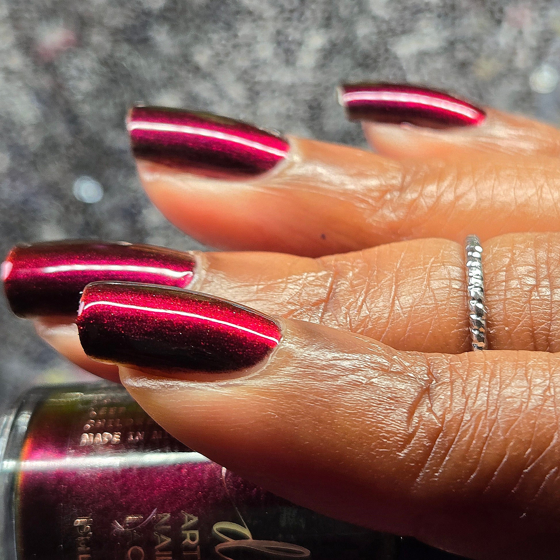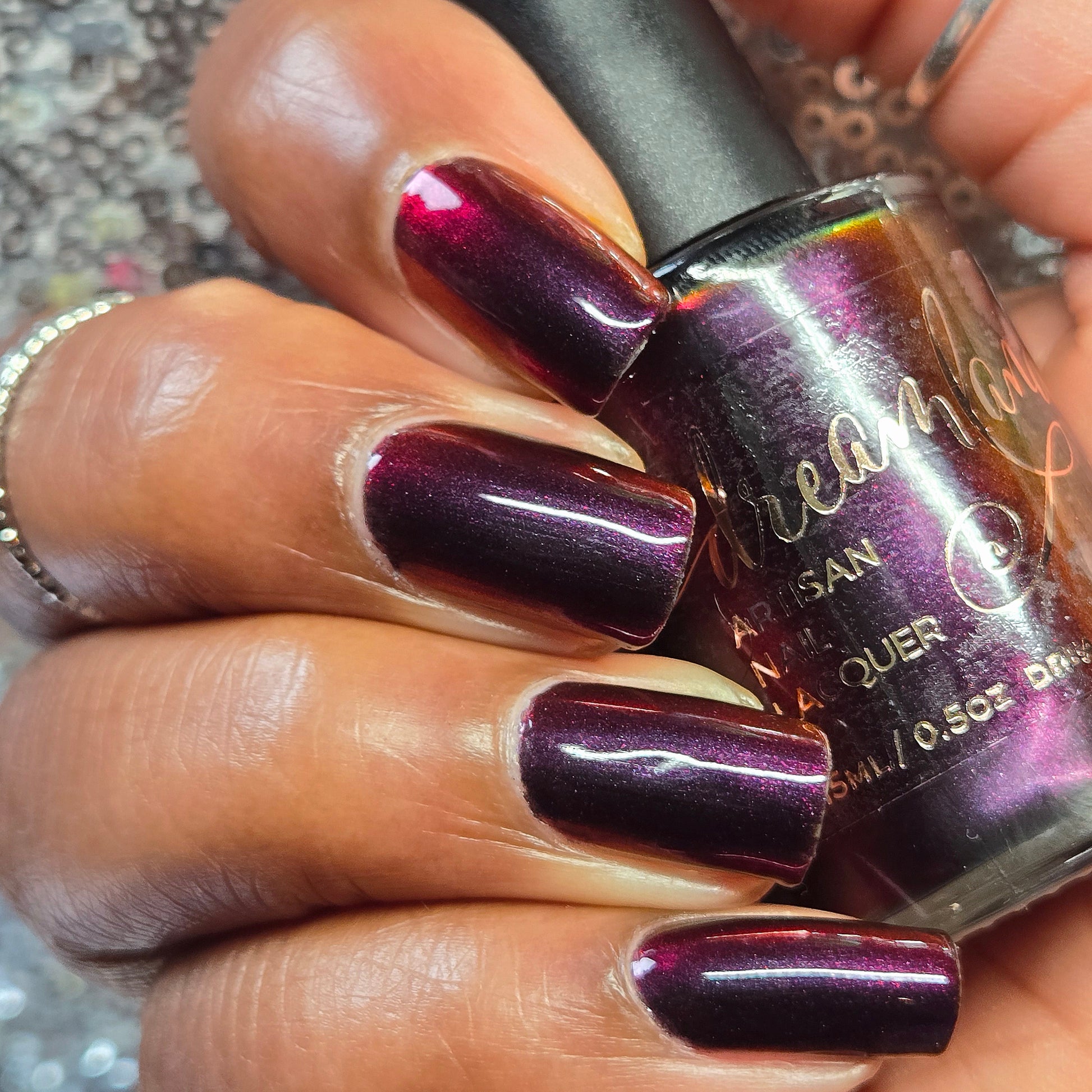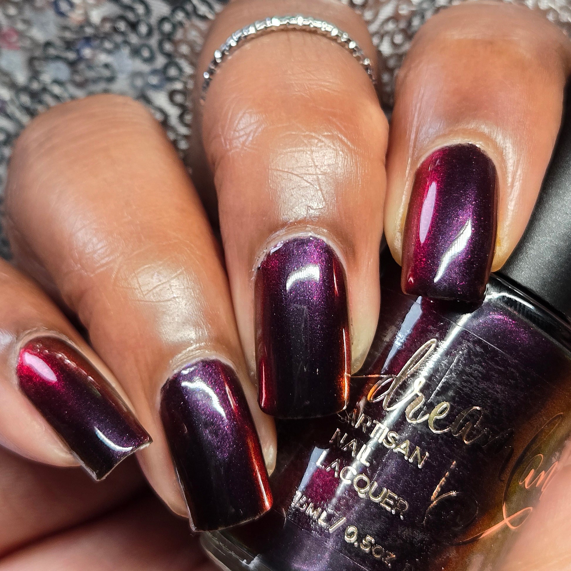 Inspired by Stack from the 2025 film Sinners. Black to red to golden orange multichrome. Opaque in 2-3 coats. Dries smooth. No staining reported.