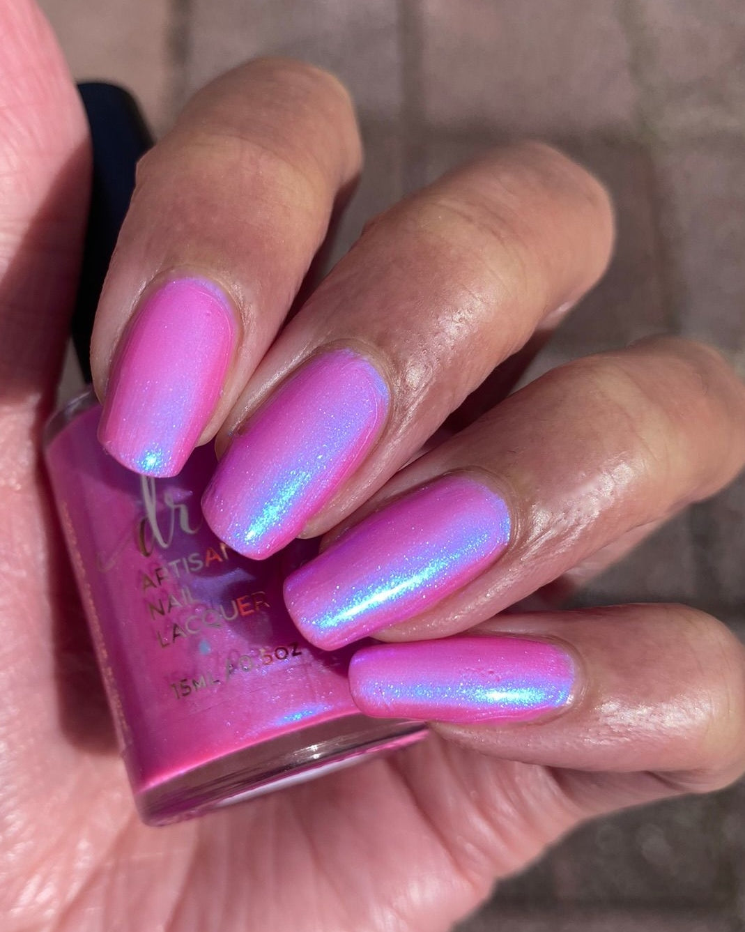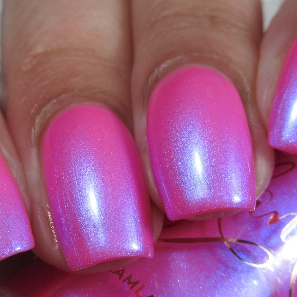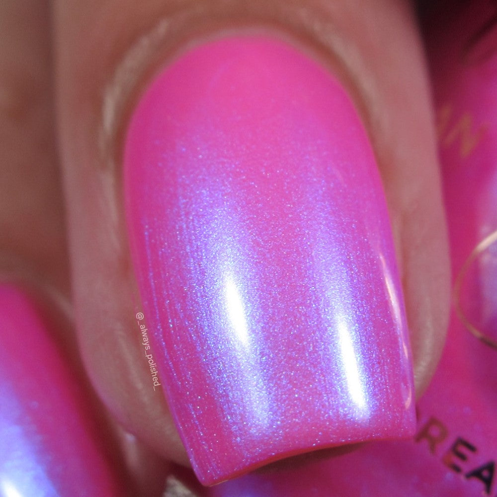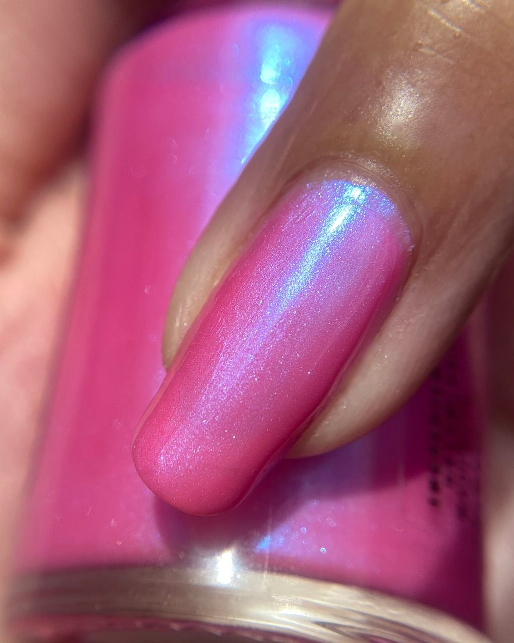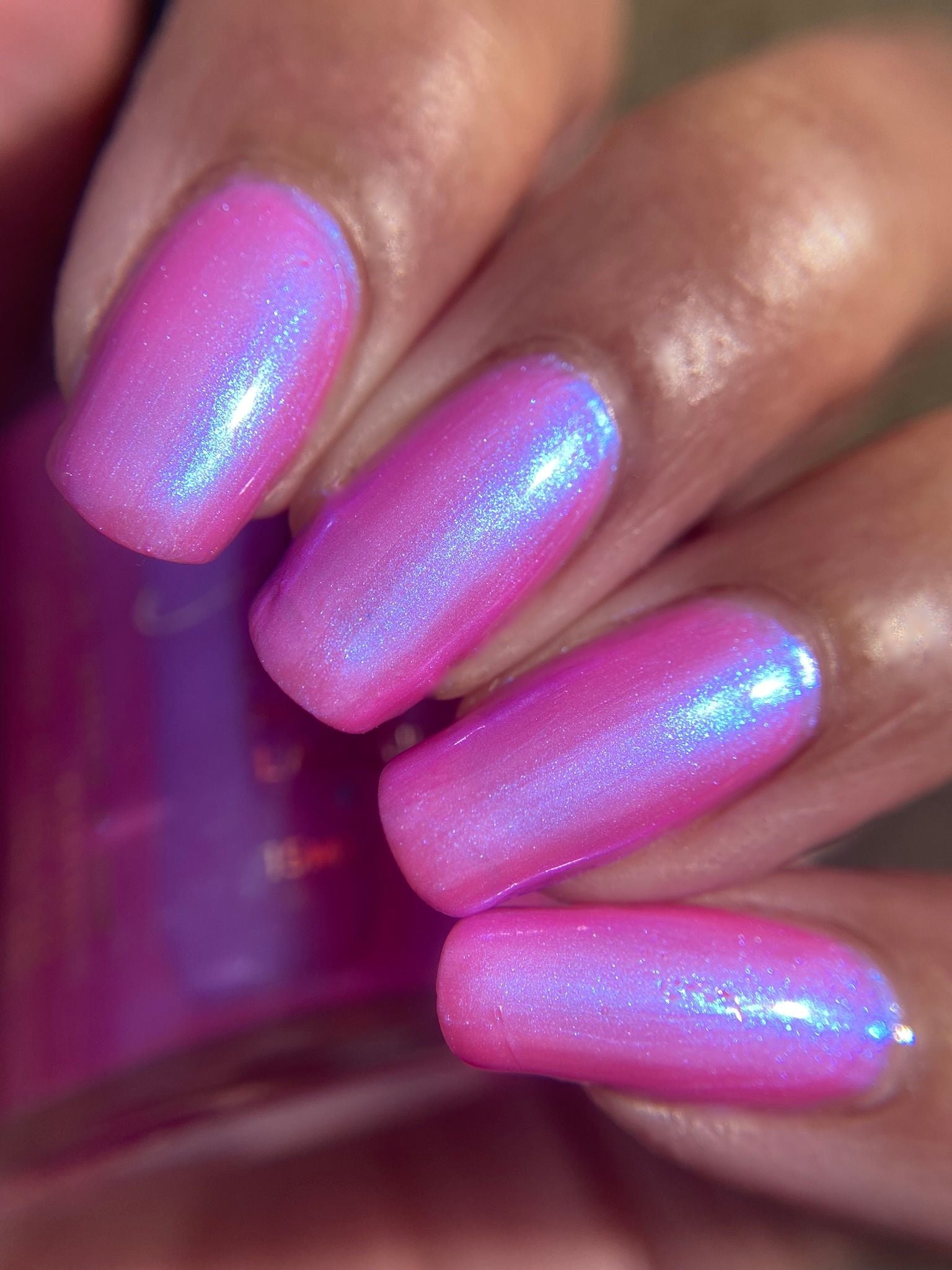 Orchid pink crelly filled with blue-violet shifty shimmer. Opaque in 2-3 coats. Dries smooth. No staining reported.
