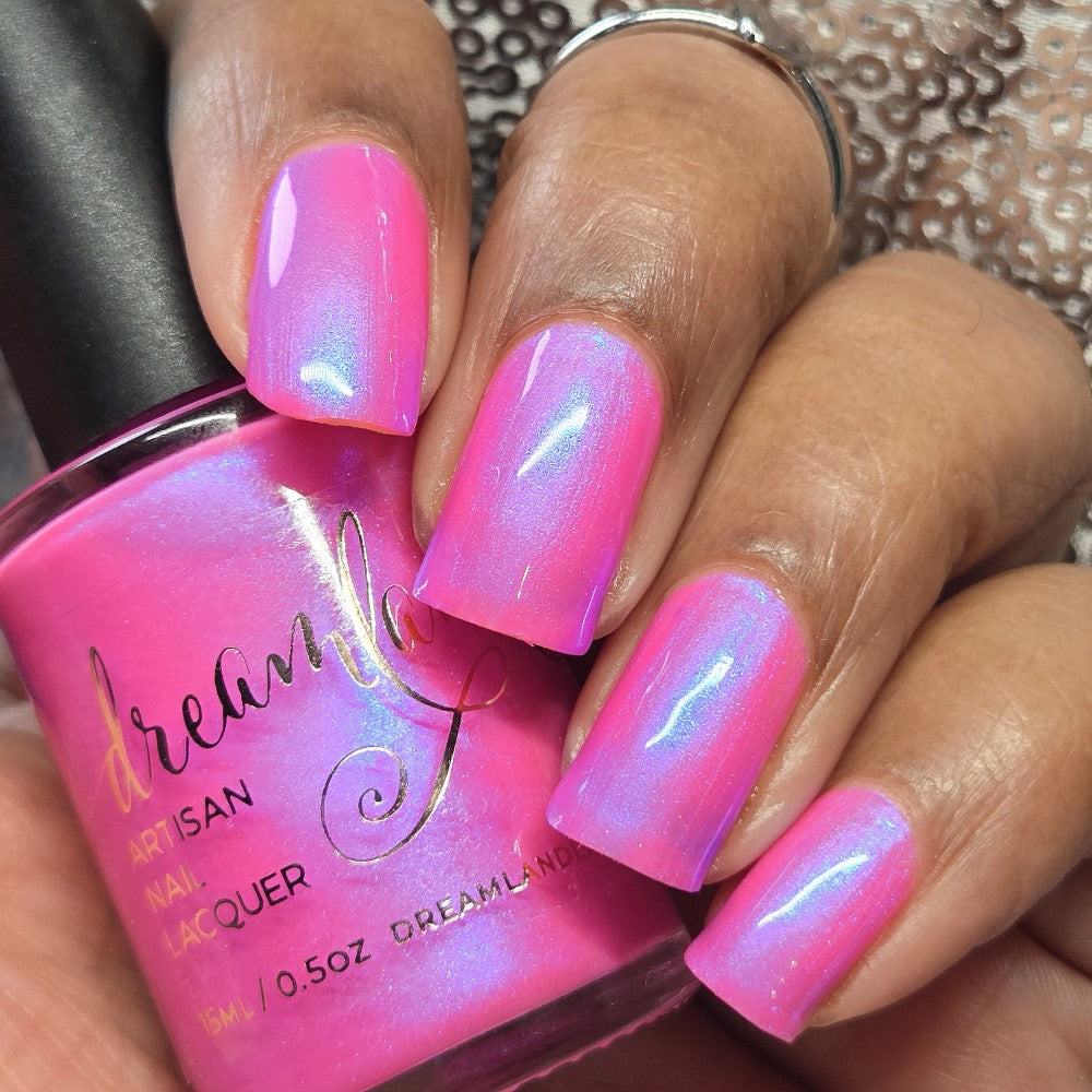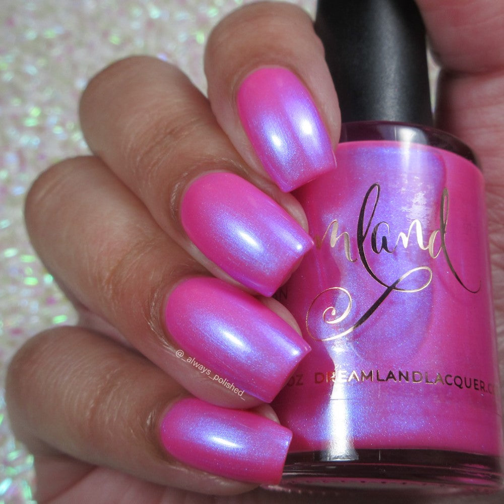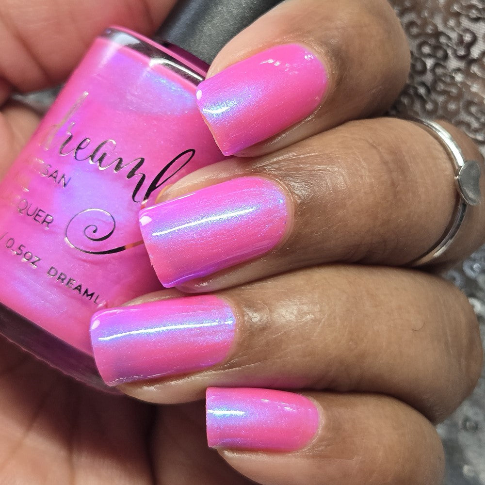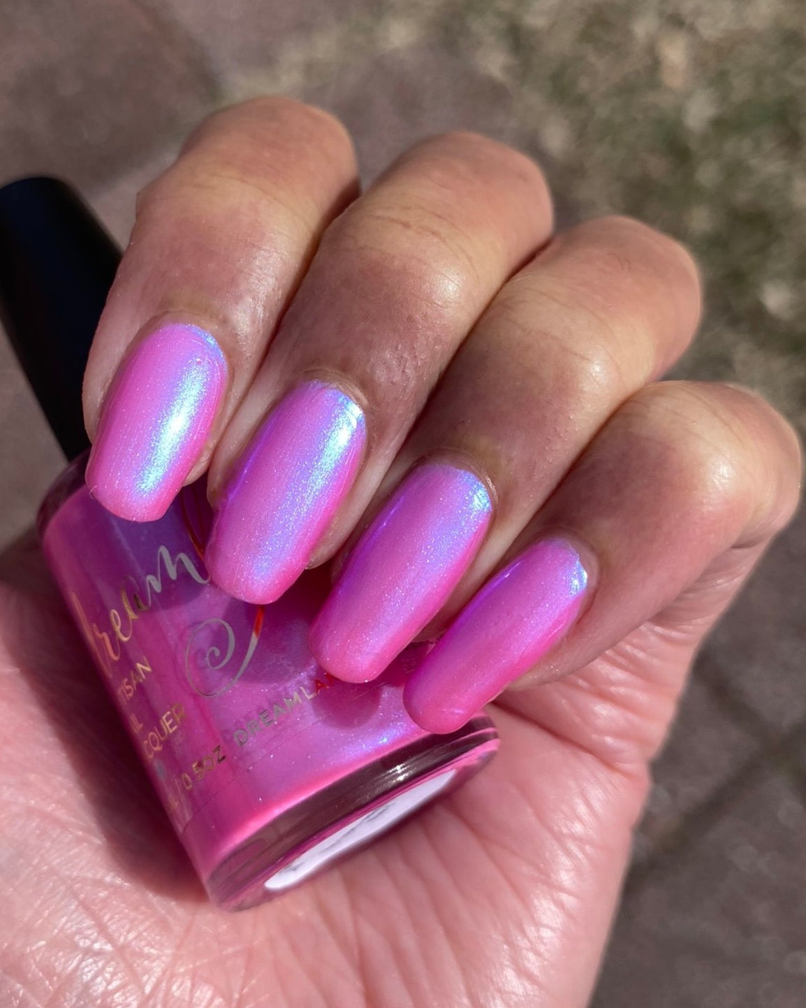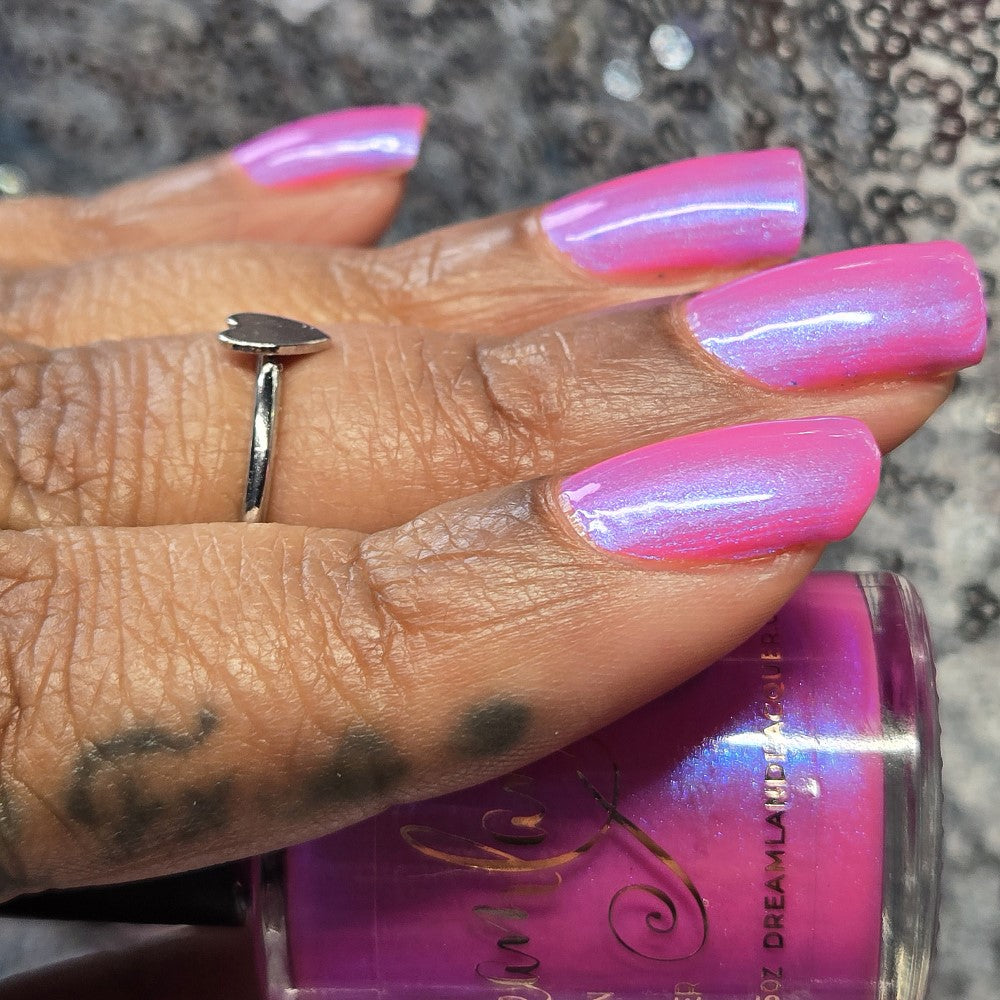 Orchid pink crelly filled with blue-violet shifty shimmer. Opaque in 2-3 coats. Dries smooth. No staining reported.