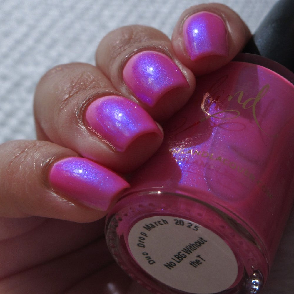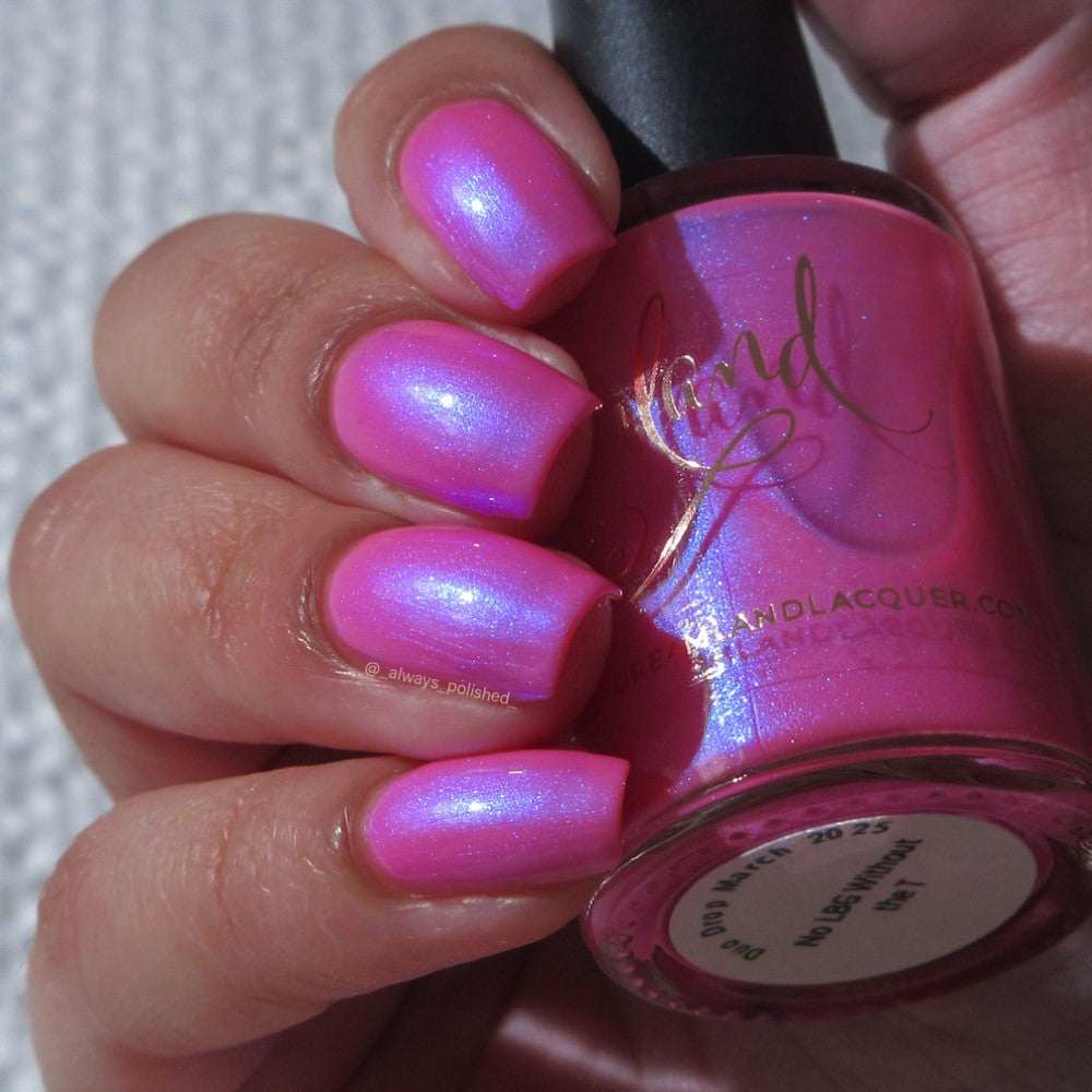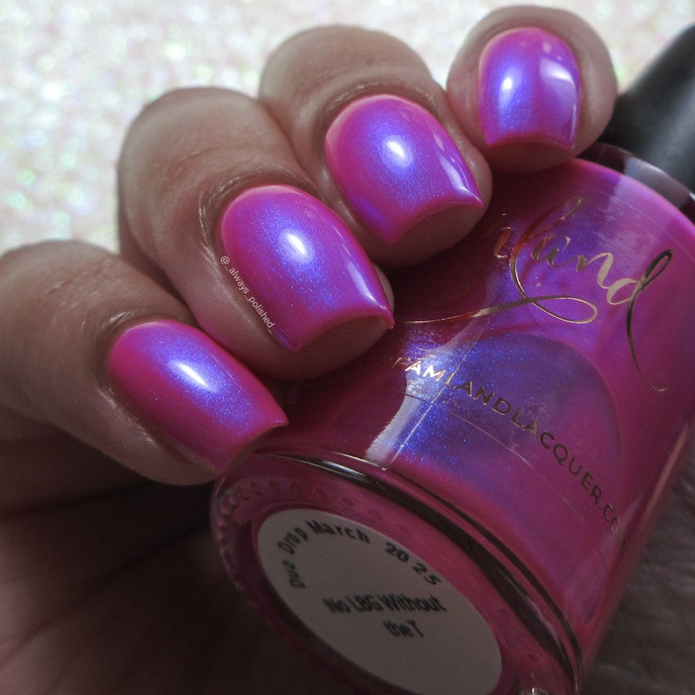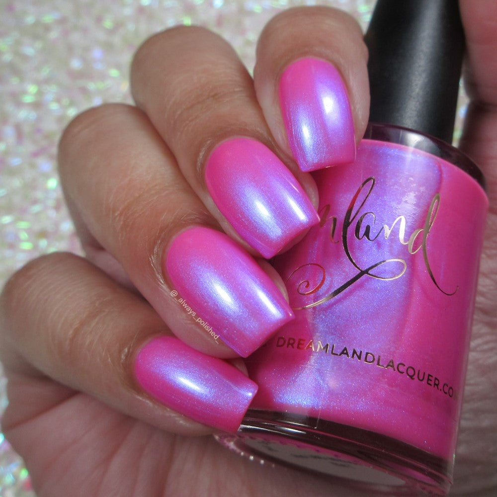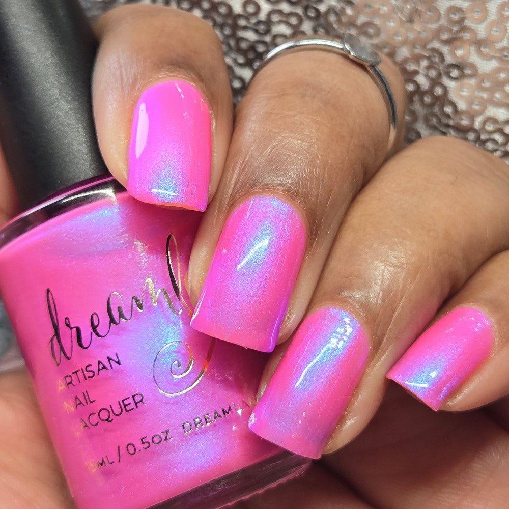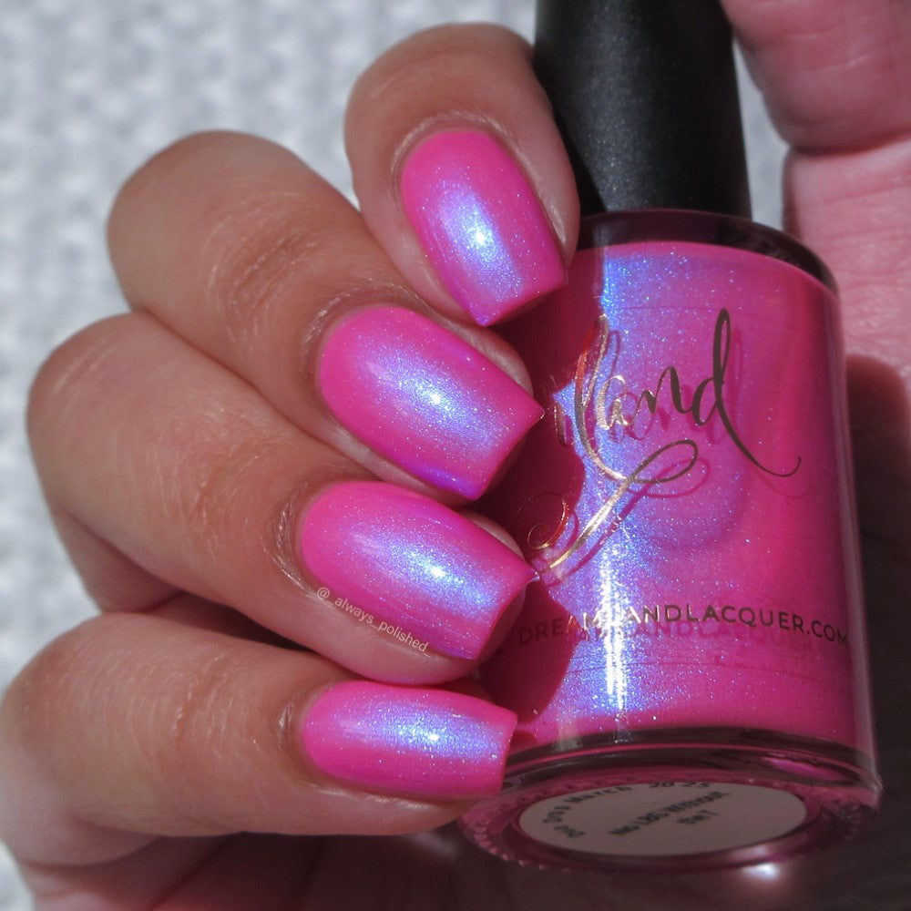 Orchid pink crelly filled with blue-violet shifty shimmer. Opaque in 2-3 coats. Dries smooth. No staining reported.
