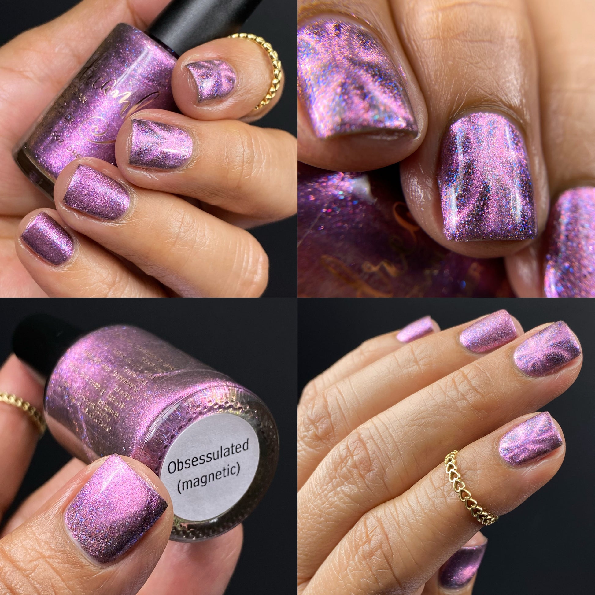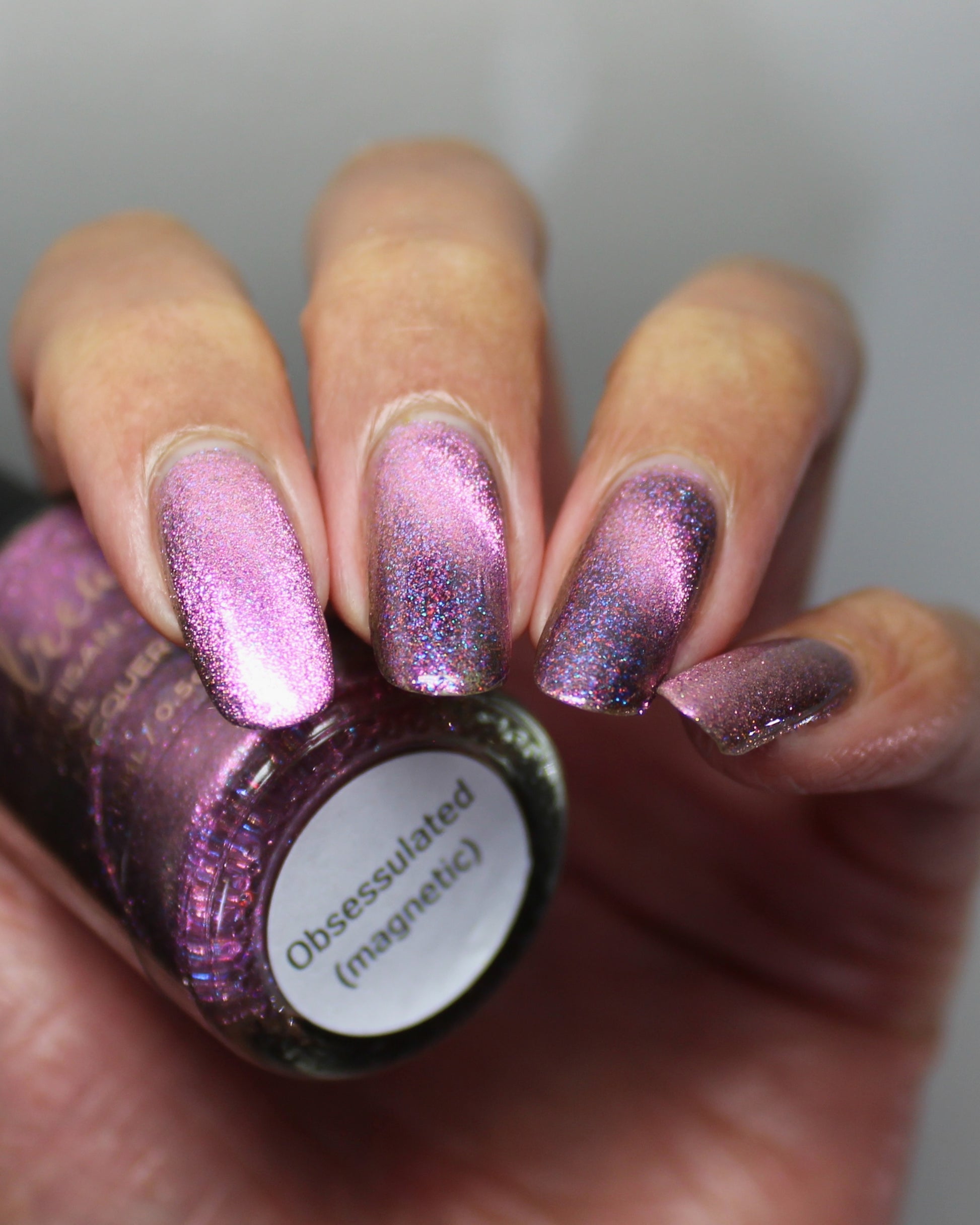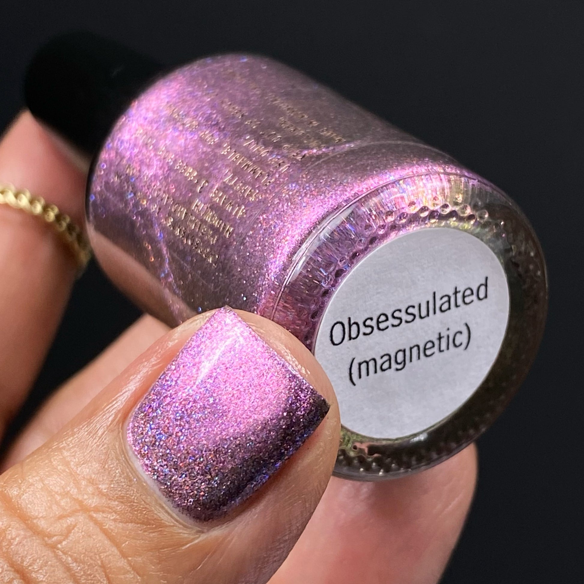 Black base filled with pink and blue shifty microflakes and a pink magnetic pull. Magnet not included. Dries smooth. No staining reported. Dries to a satin finish, glossy topcoat recommended for maximum shine.