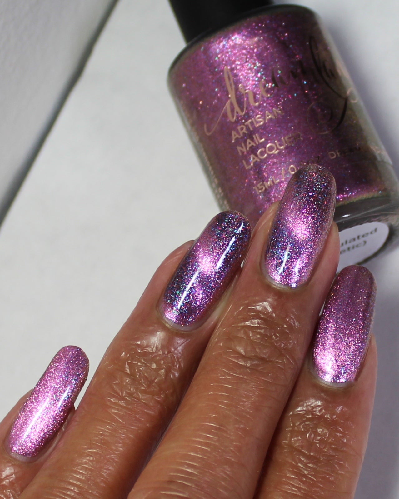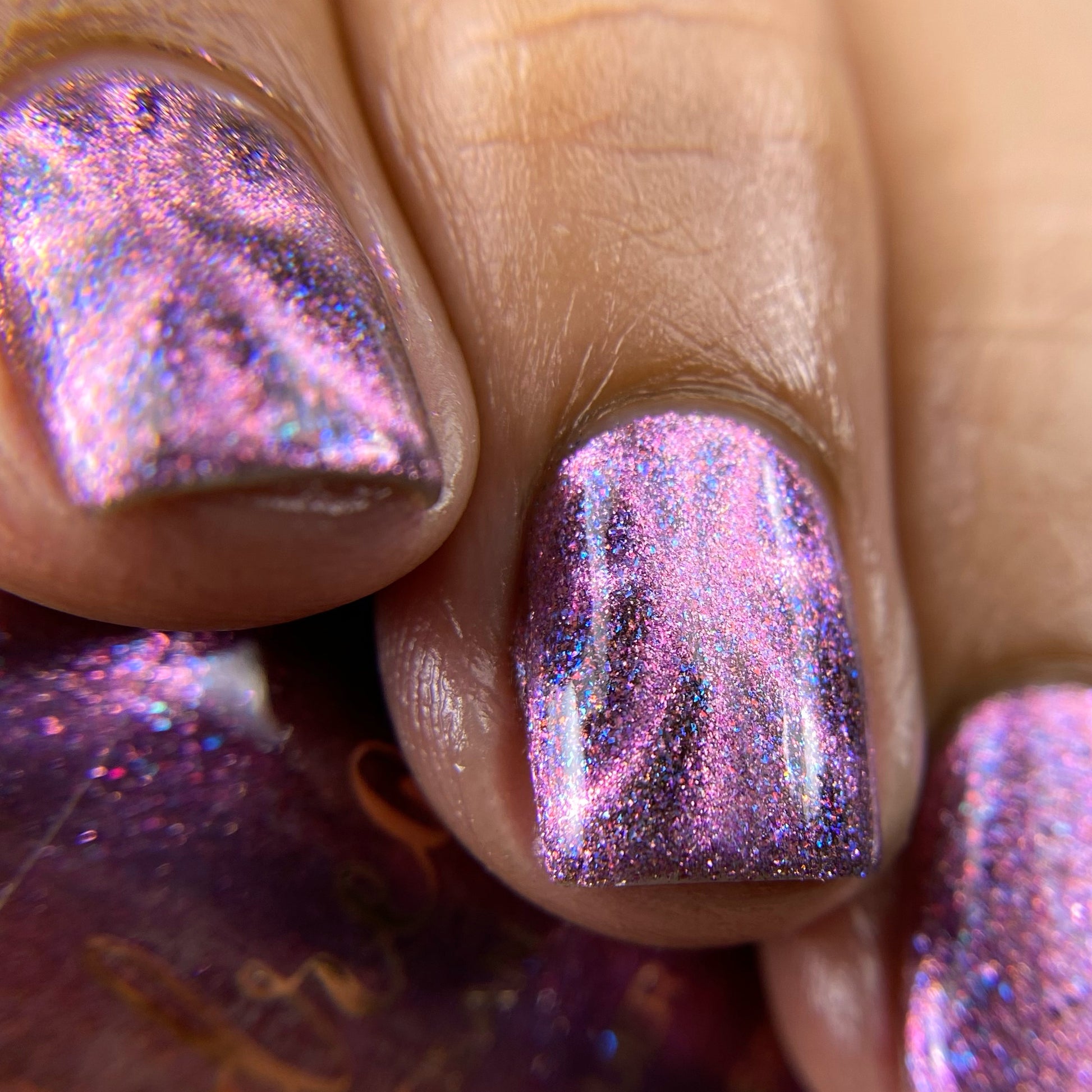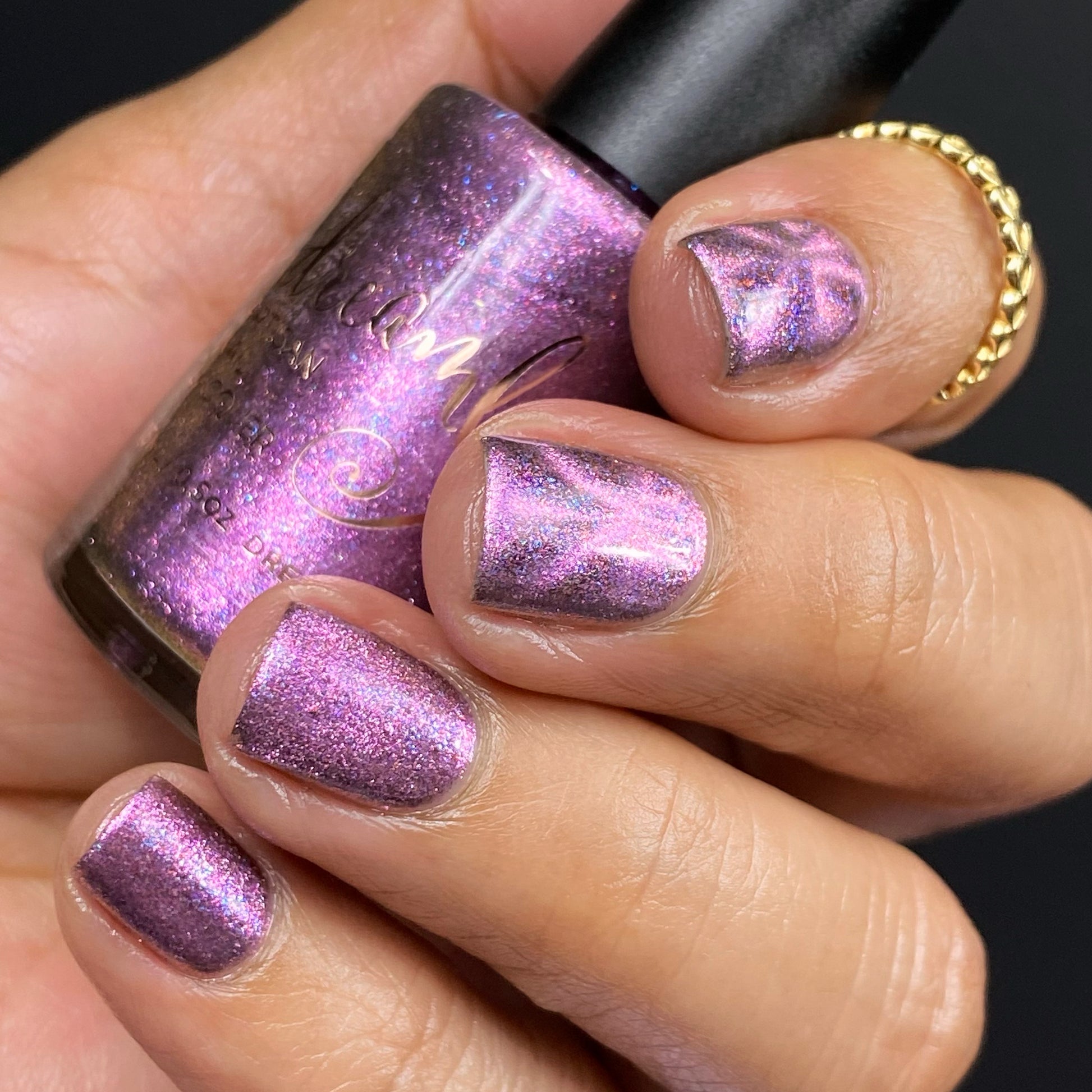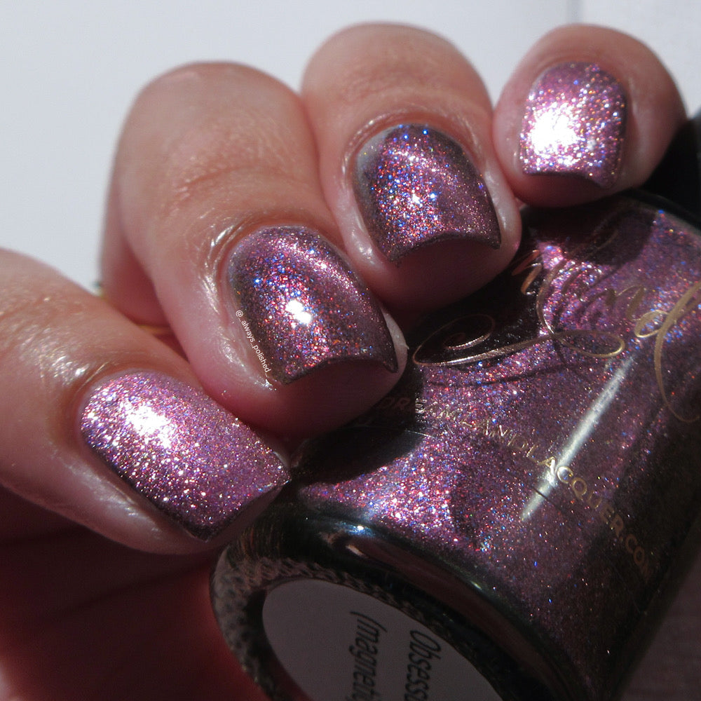 Black base filled with pink and blue shifty microflakes and a pink magnetic pull. Magnet not included. Dries smooth. No staining reported. Dries to a satin finish, glossy topcoat recommended for maximum shine.