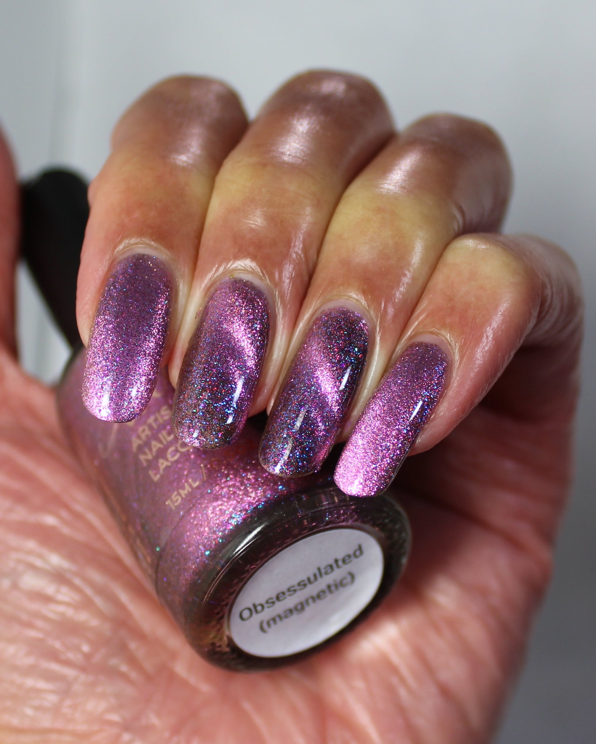 Magnetic instructions: Start by applying one coat of magnetic polish to all your nails and allow to dry. For each nail, add a second, thicker coat of polish - thin coats won't dry too fast and won't magnetize properly. Right away, hold the magnet about ¼ inch from your nail for 15–30 seconds. The closer and longer you hold it, the stronger the design will look.