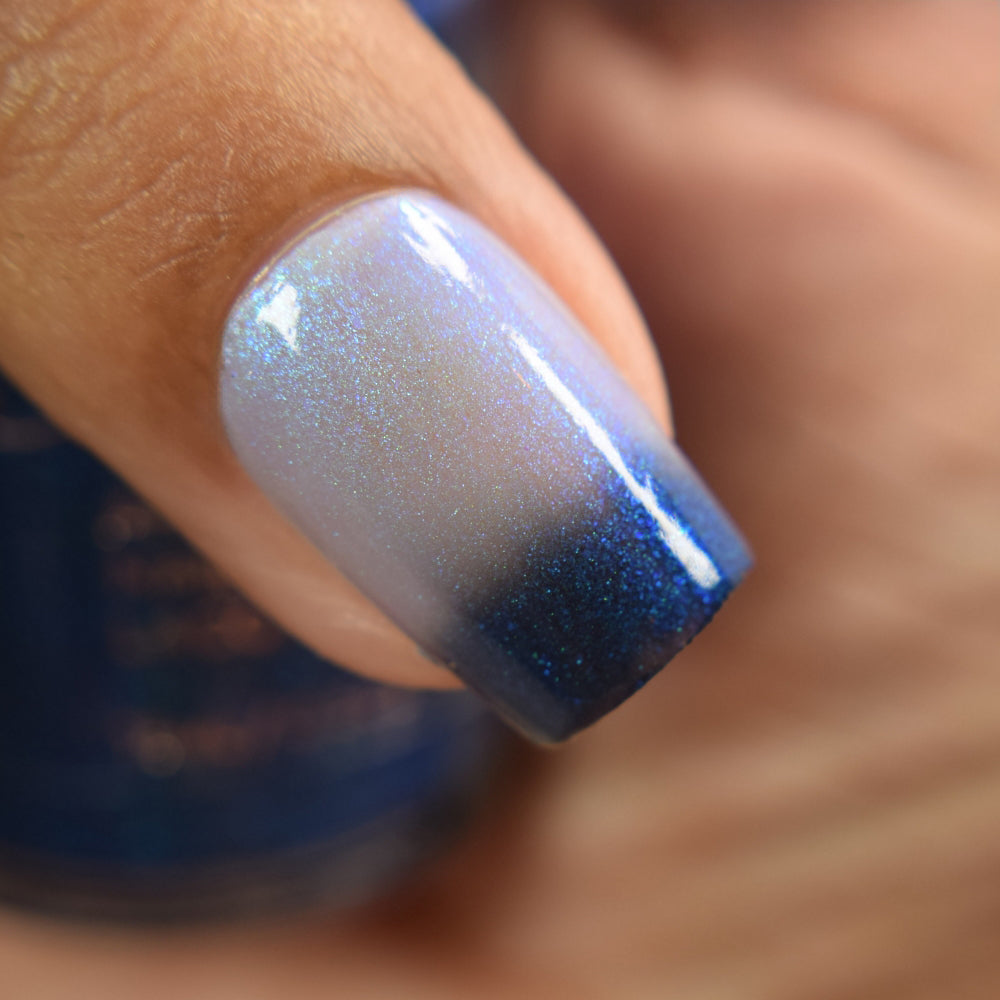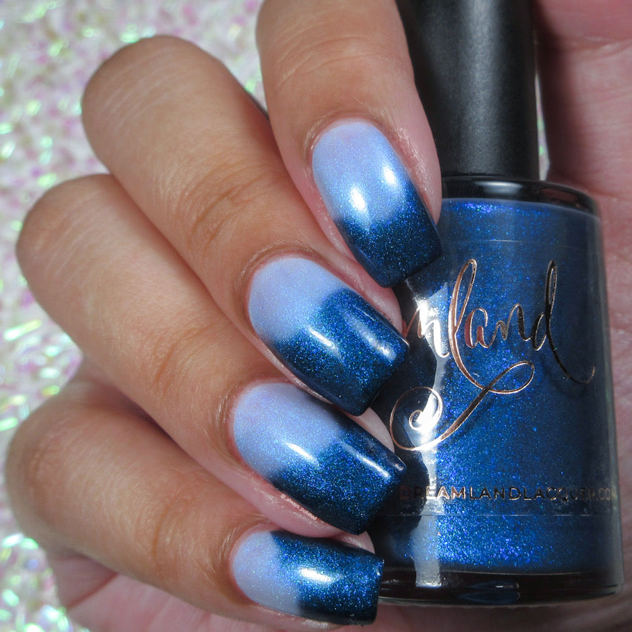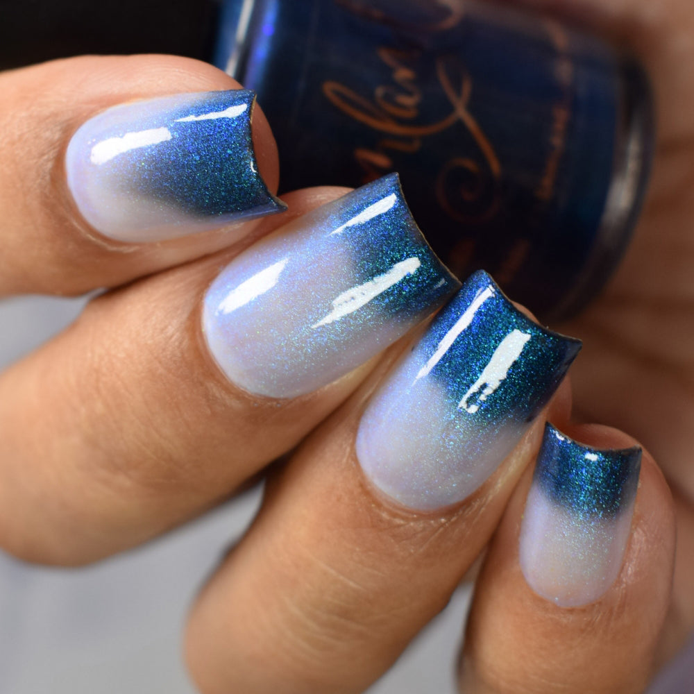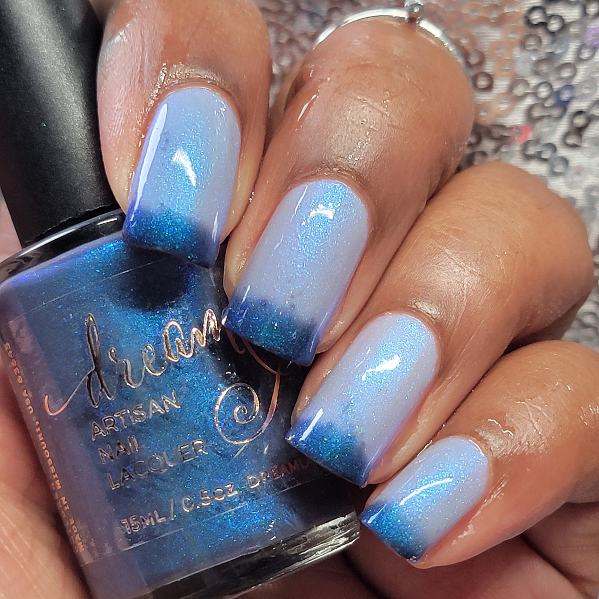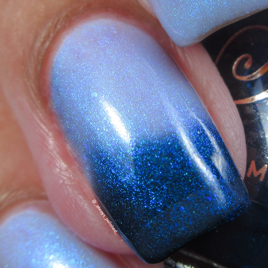 Inspired by my favorite and oldest literary boyfriend, Lestat de Lioncourt, in the series Interview with the Vampire, Very light blue to dark blue thermal filled with blue / violet shifty pigments and tiny iridescent flakes.
