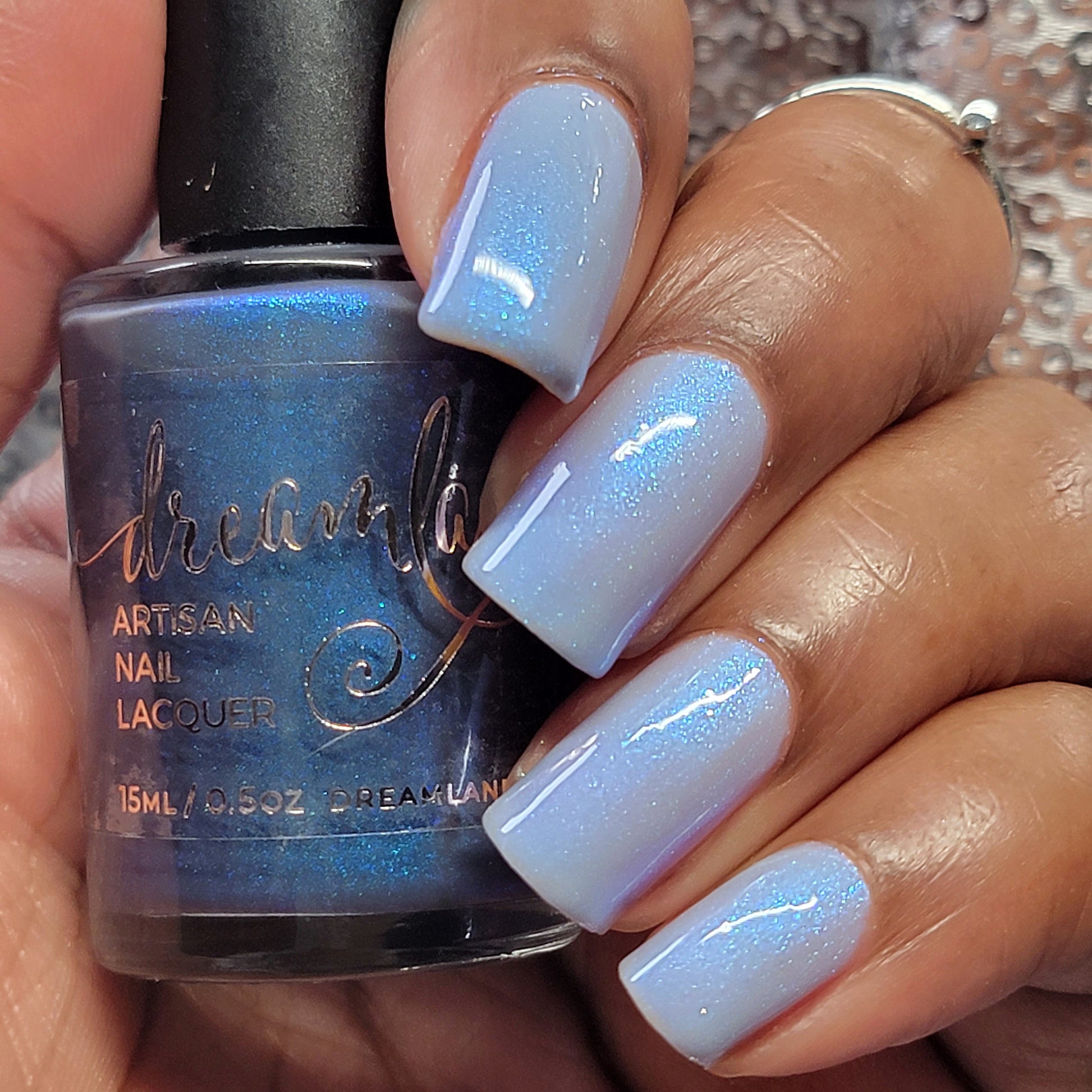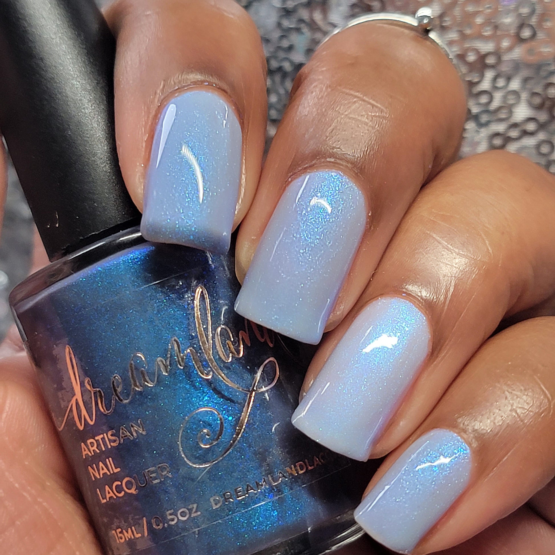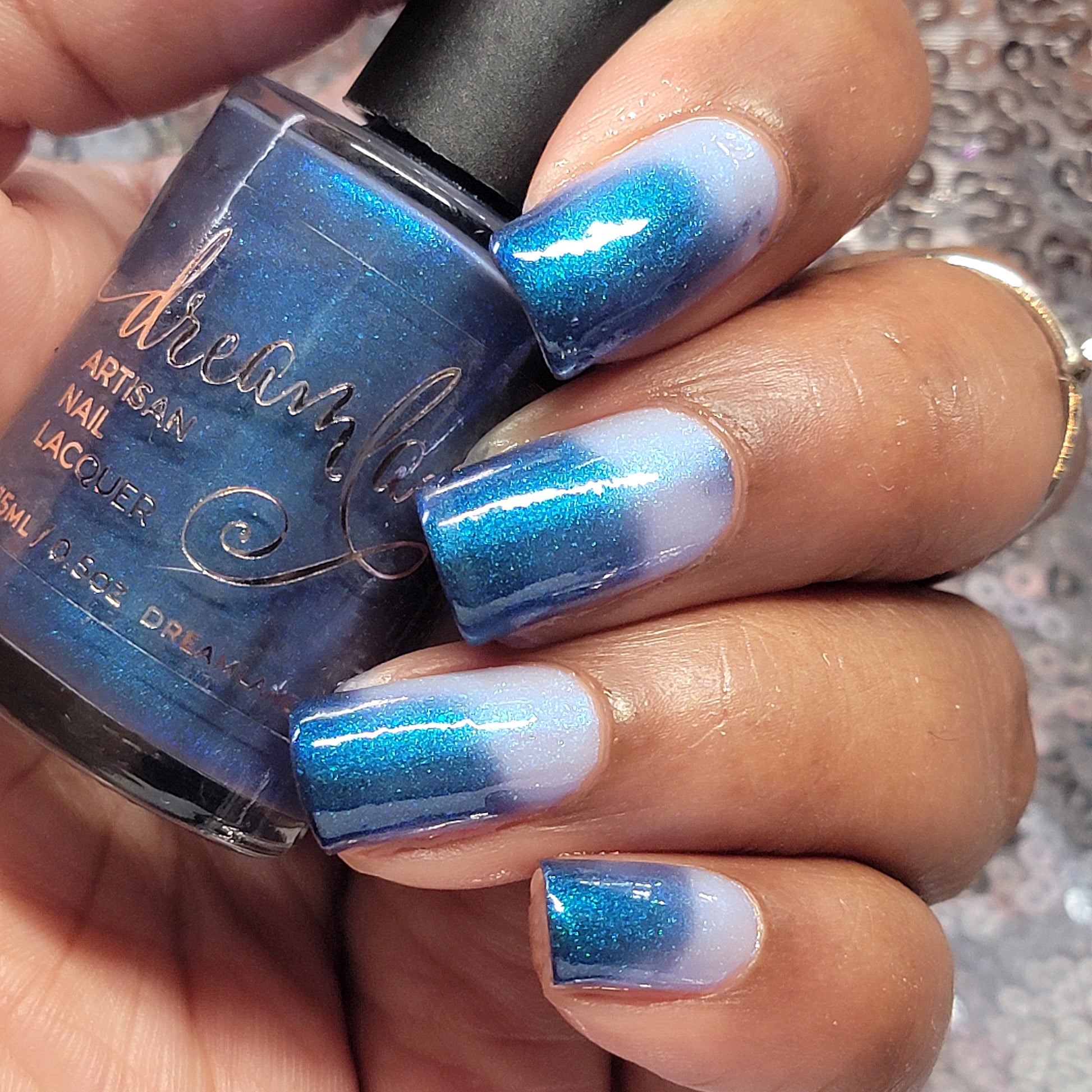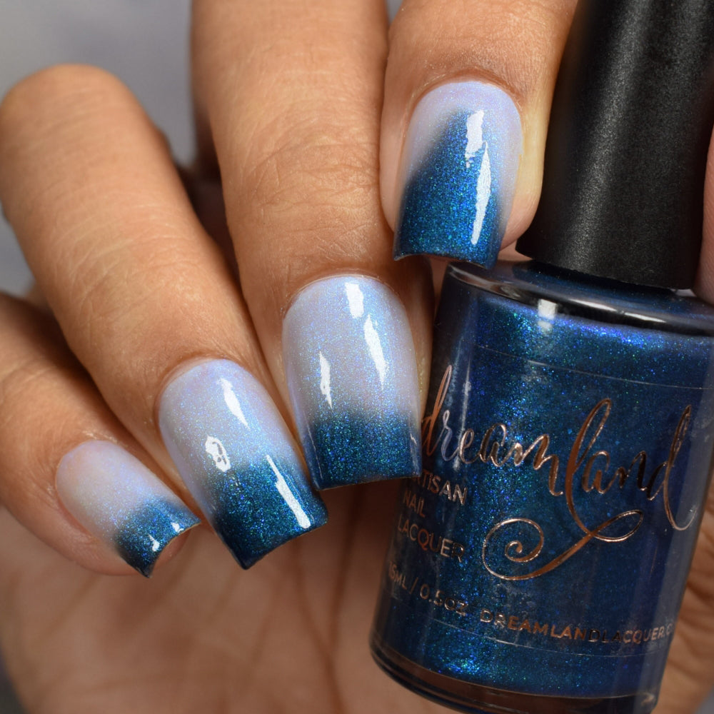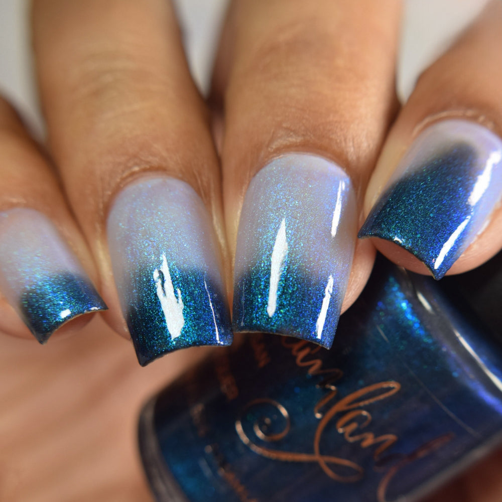 Inspired by my favorite and oldest literary boyfriend, Lestat de Lioncourt, in the series Interview with the Vampire, Very light blue to dark blue thermal filled with blue / violet shifty pigments and tiny iridescent flakes.