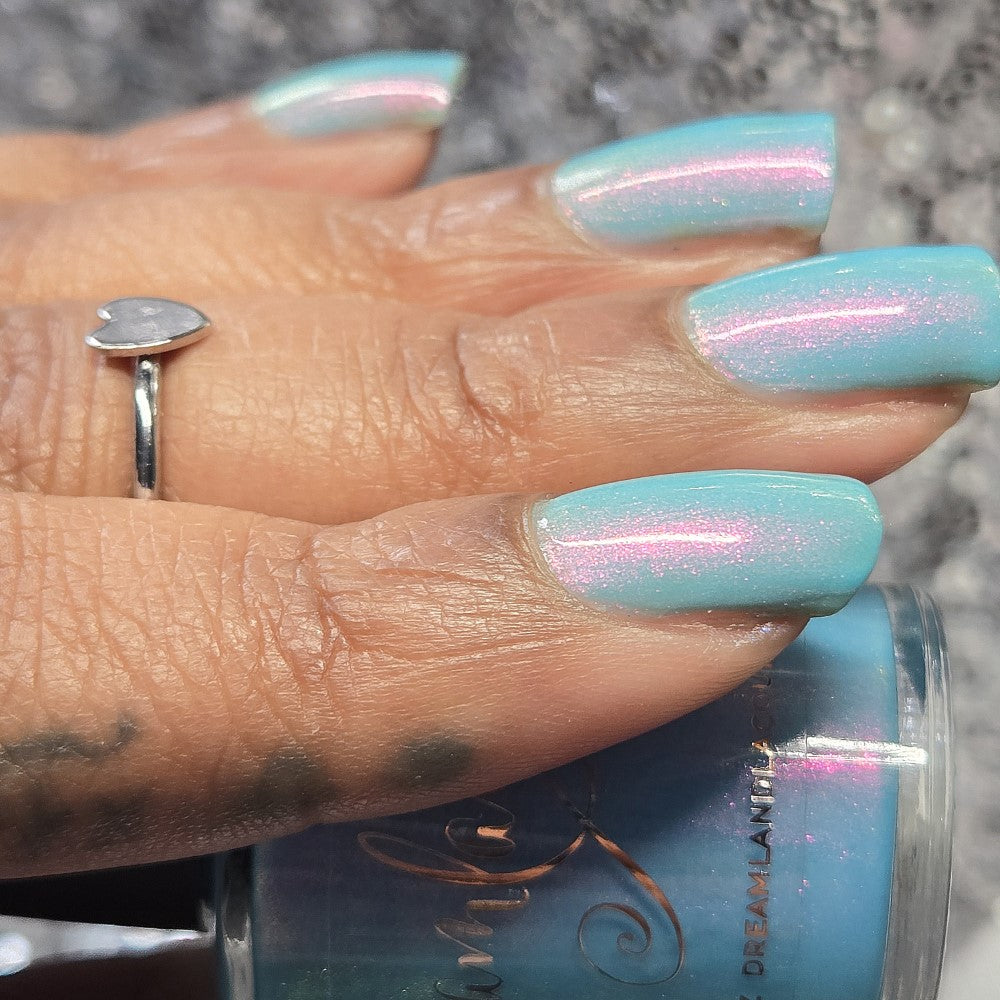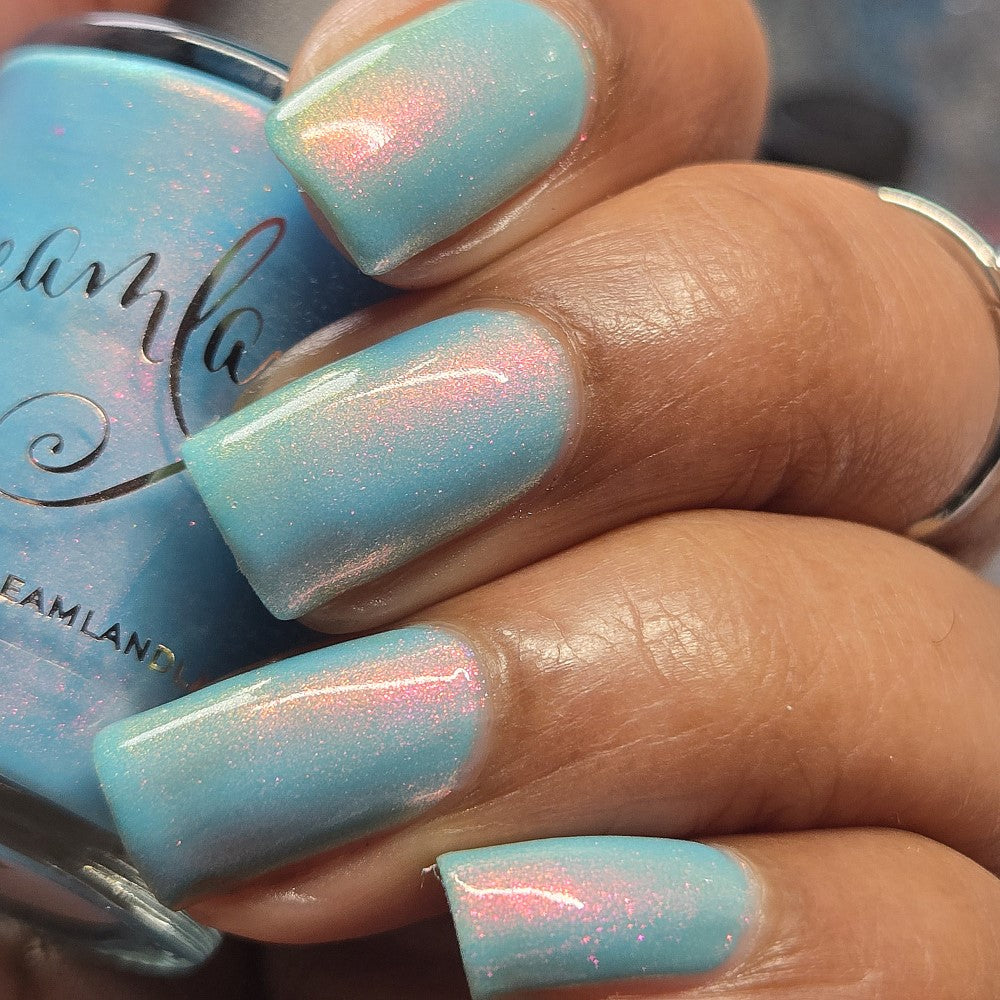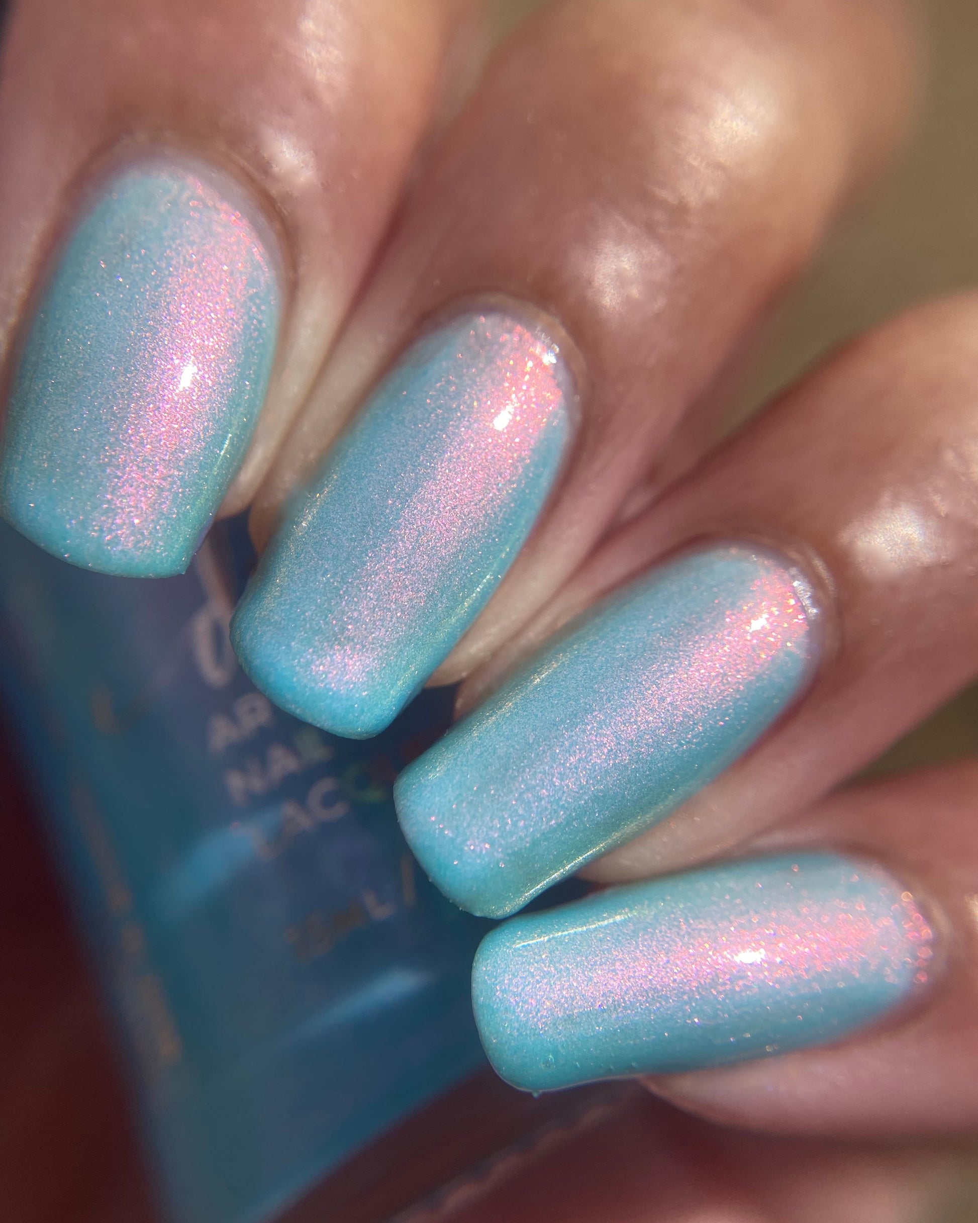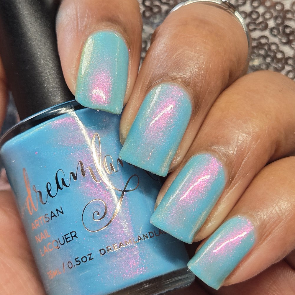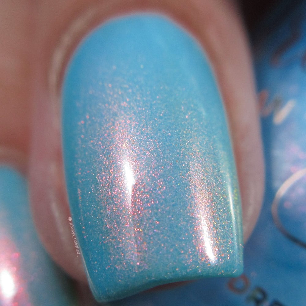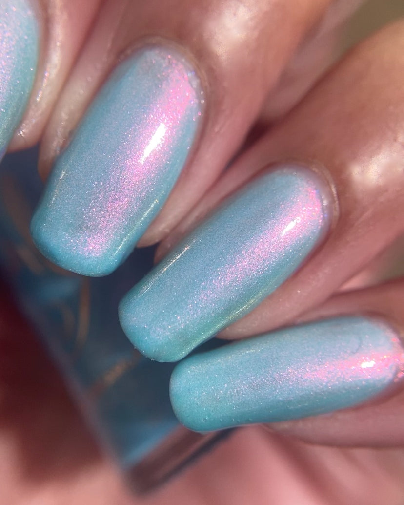 Sky blue crelly filled with pink - gold - green shifty pigment. Opaque in 2-3 coats. Dries smooth. No staining reported.