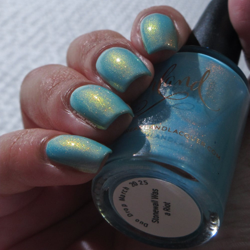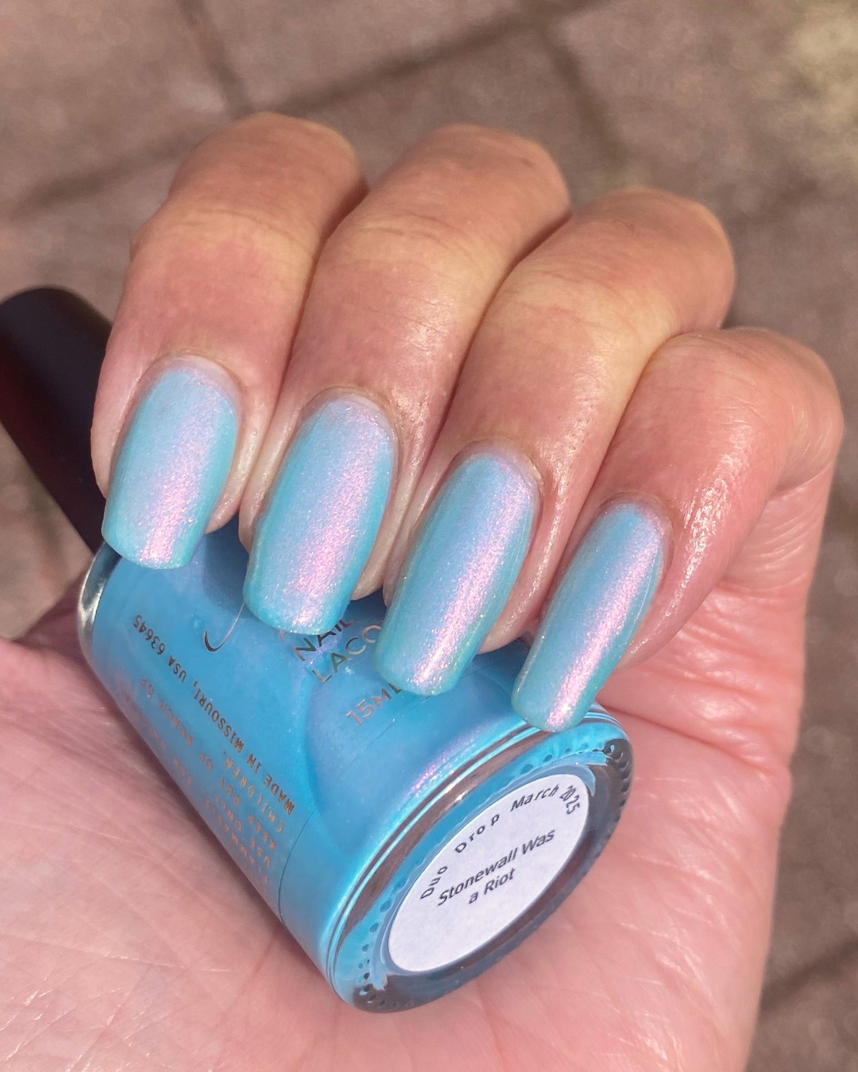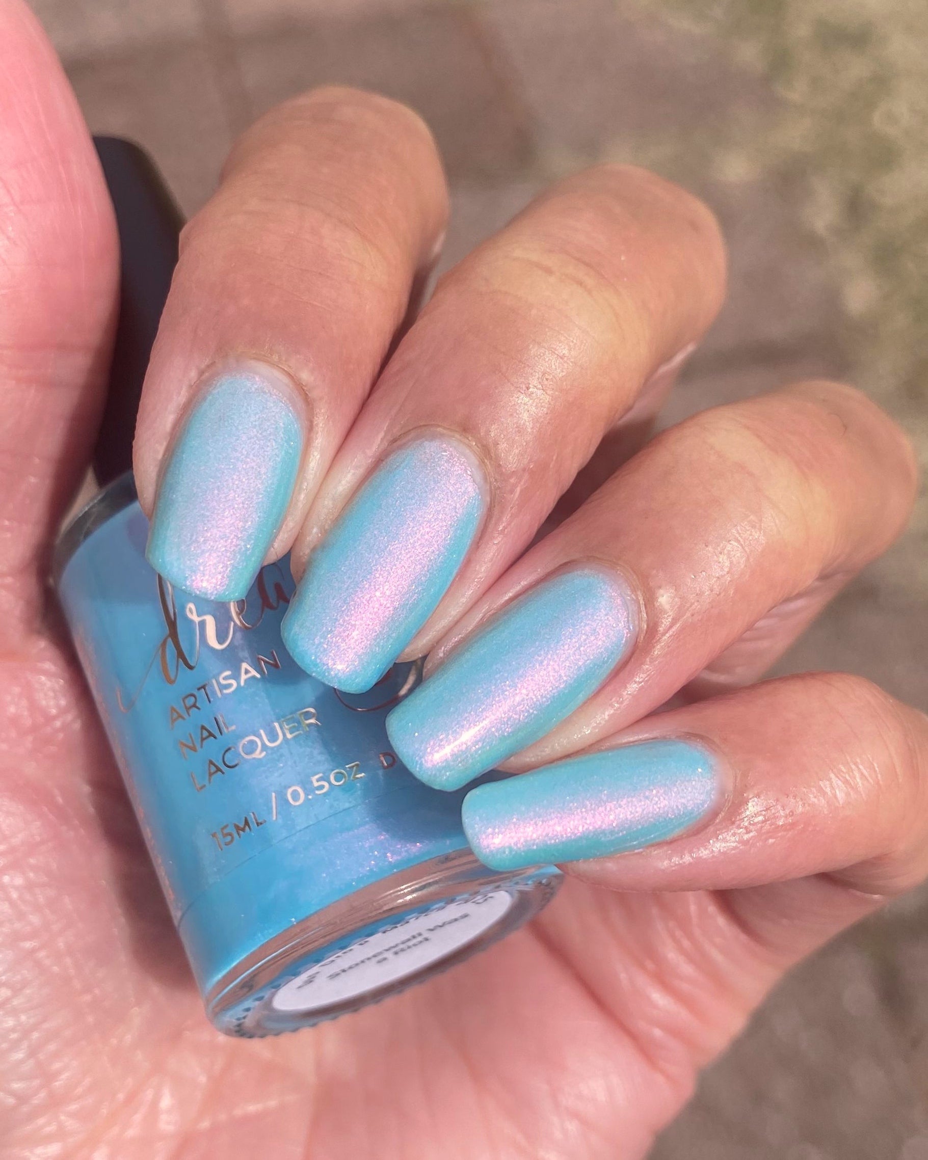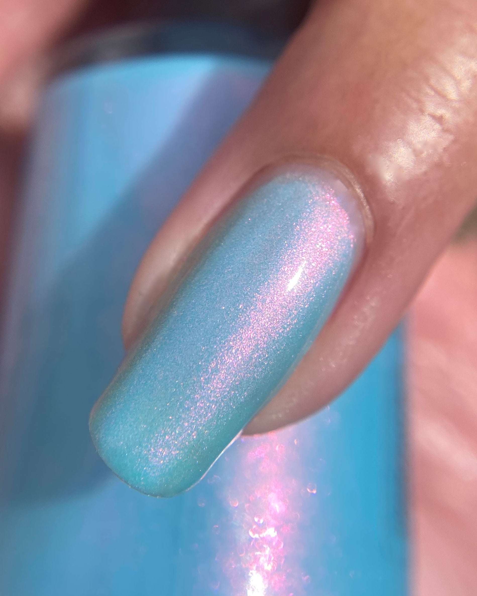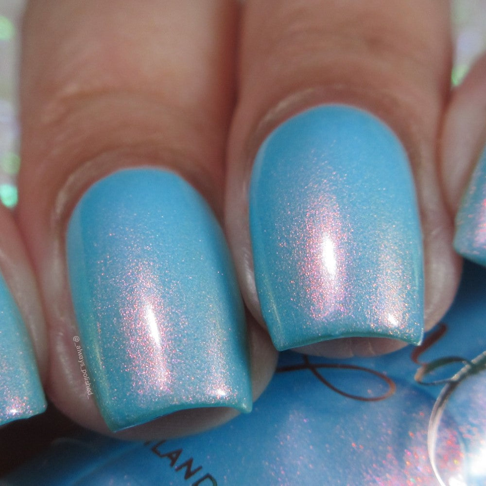 Sky blue crelly filled with pink - gold - green shifty pigment. Opaque in 2-3 coats. Dries smooth. No staining reported.