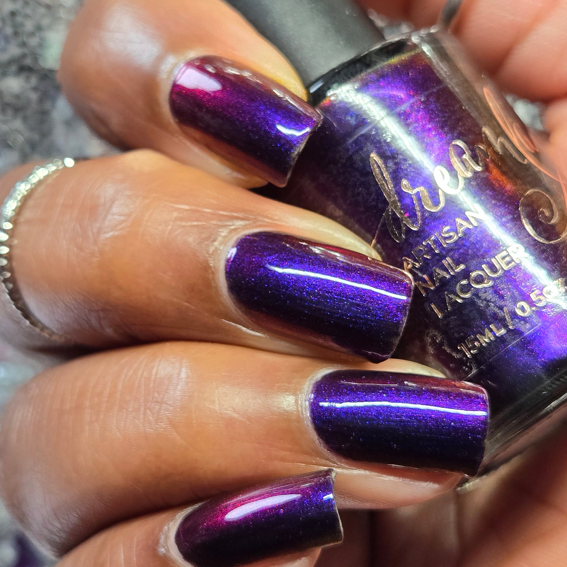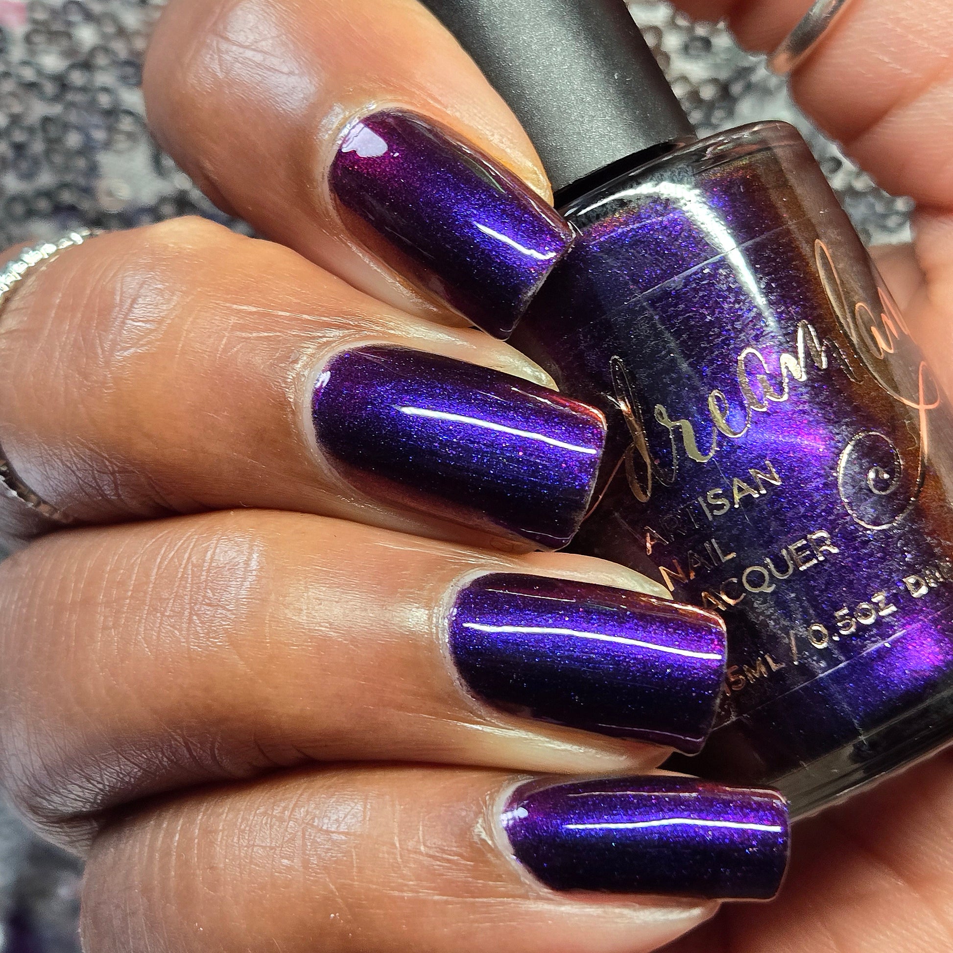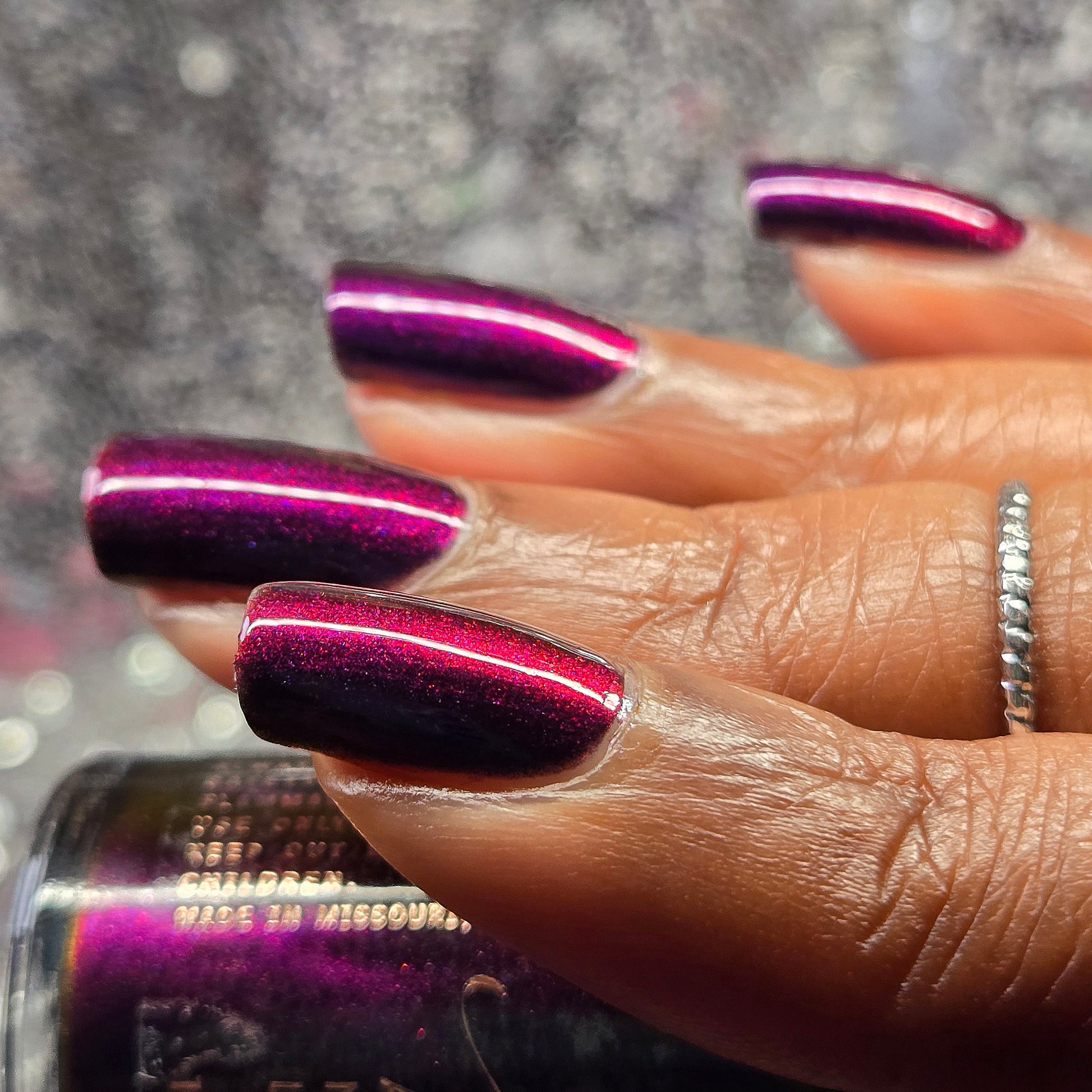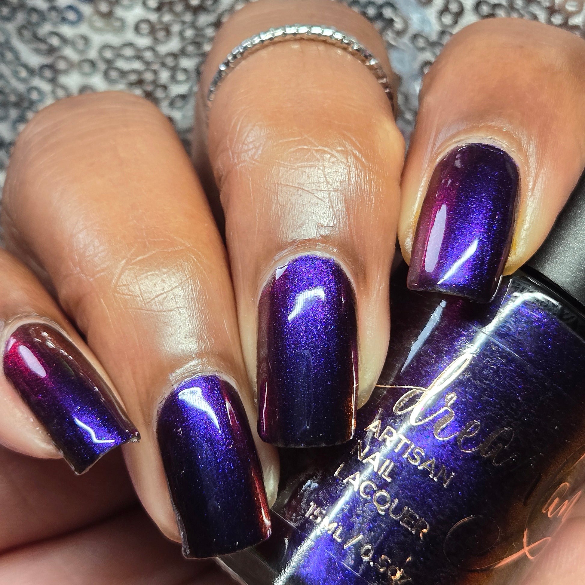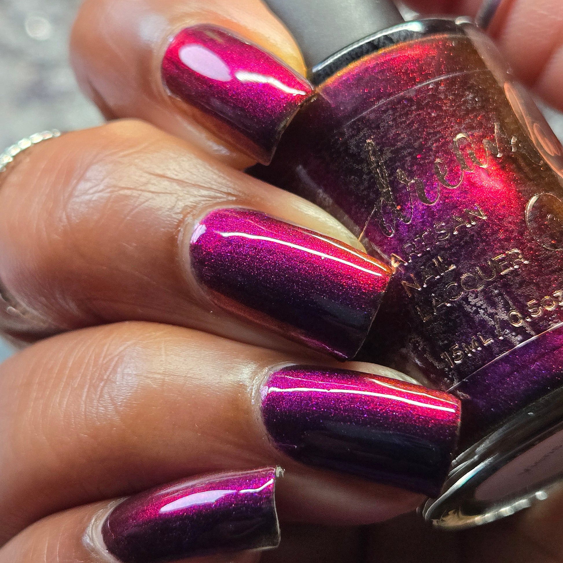 Inspired by Lestat from Interview with the Vampire, specifically as he is portrayed in the TV series (he is the Lestat I have dreamed of since I was 12!). Purple to black to red to orange multichrome. Dries smooth. No staining reported.