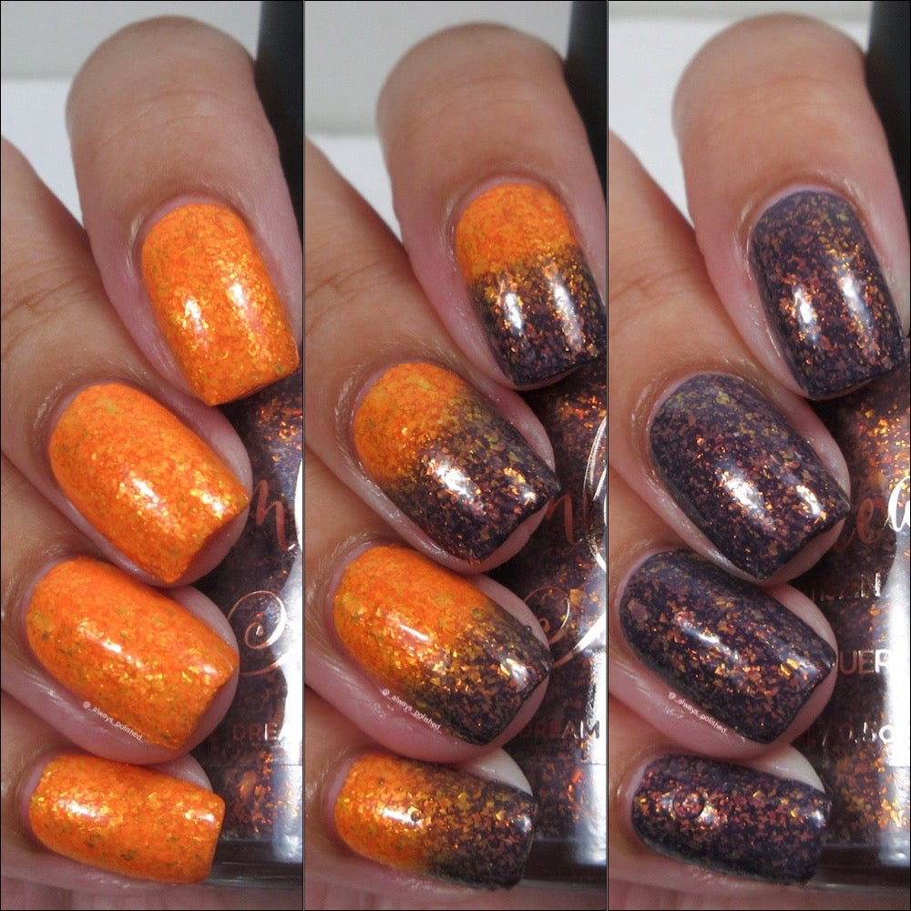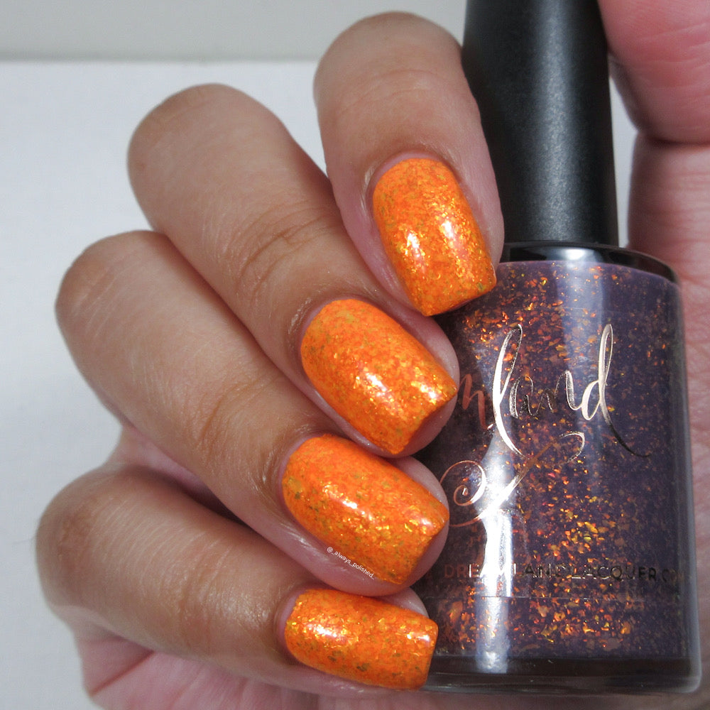 Inspired by the Wolfman. Orange to plum thermal filled with orange / gold shifting iridescent flakes. Dries to a satin finish and is slightly textured - we recommend a glitter smoother and high quality top coat for maximum shine. No staining reported.